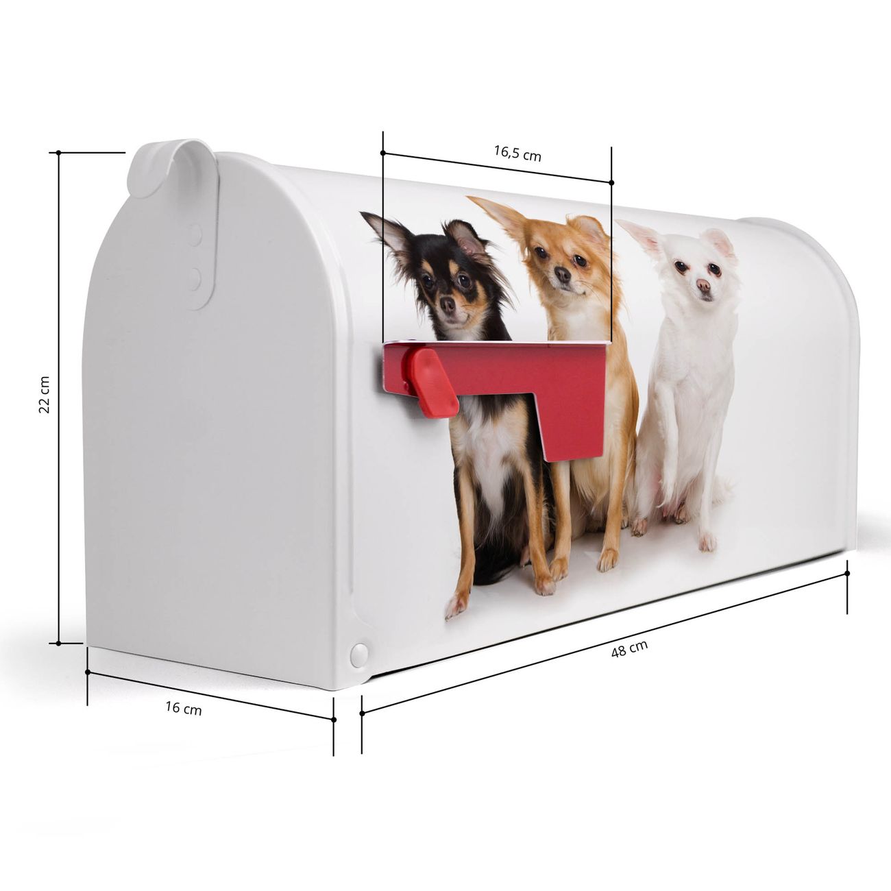 Der amerikanische Briefkasten von banjado mit Chihuahua Motiv bietet Ihnen ausreichend Fassungsvermögen, um große A4 Sendungen und Zeitschriften zu empfangen. Die typisch amerikanische rote Fahne zeigt Ihnen an, wenn Sie Post erhalten haben. Die US-Mailbox besteht aus verzinktem Stahlblech welches lackiert wurde und ist 48 x 22 x 16 CM (BxHxT) groß. Die Folie mit Motiv Chihuahua besteht aus einer wetter- und UV-resistenten Folie, die mit einem Schutzlaminat überzogen ist, sodass die US Mailbox zusätzlich vor Kratzern geschützt ist. An der Unterkante sind 4 Löcher je Seite um die Mailbox, typisch amerikanisch, an einem Holzpfahl oder einem Zaun zu befestigen. Auf Wunsch können Sie bei uns den passenden Standfuß oder die passende Wandhalterung kaufen um die US-Mailbox sicher zu befestigen. Wir bieten Ihnen ebenfalls Namensschilder, bereits beschriftet oder frei zu beschriften, und verschiedene selbst gestaltete Bitte-Keine-Werbung-Aufkleber.