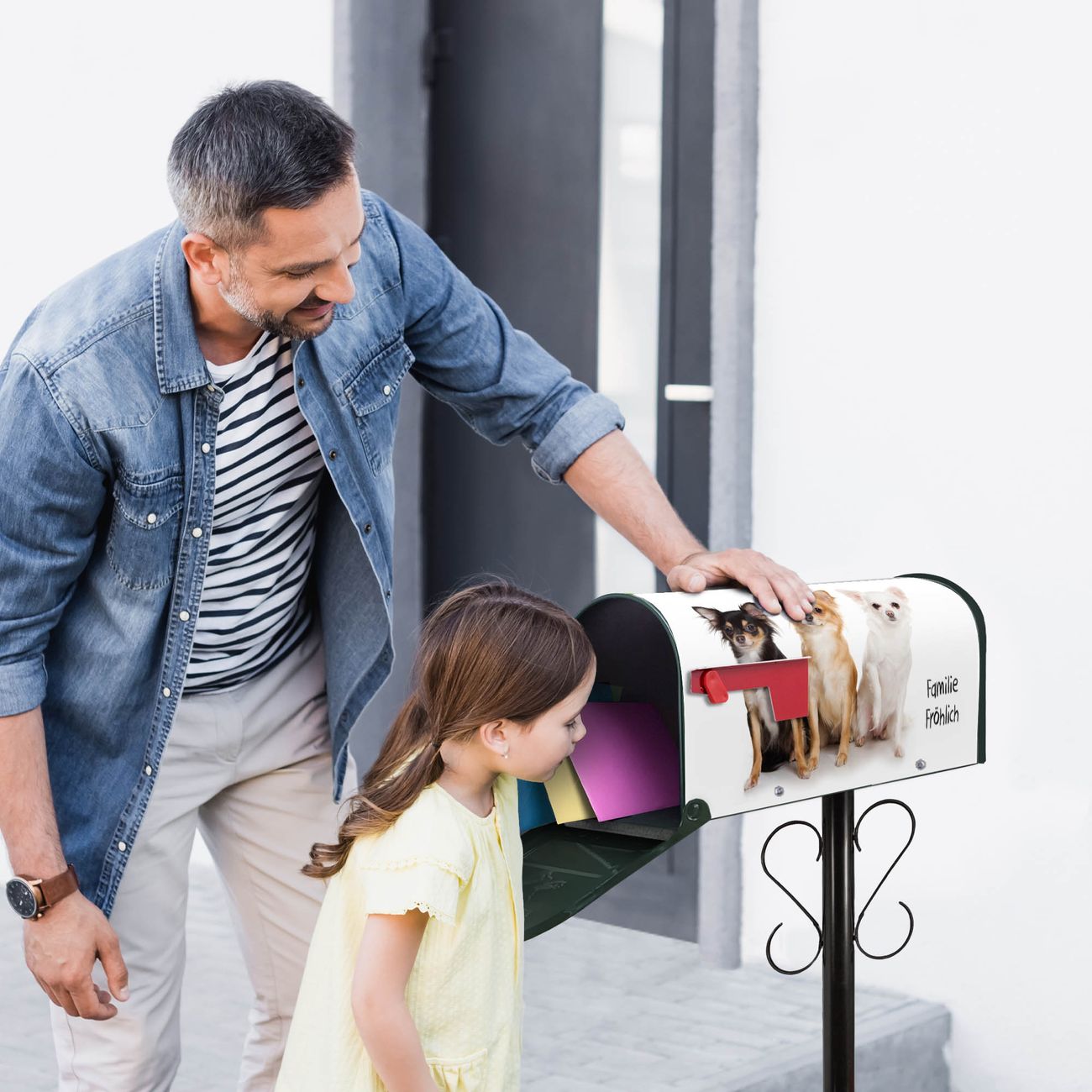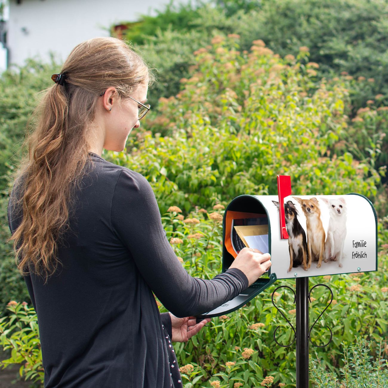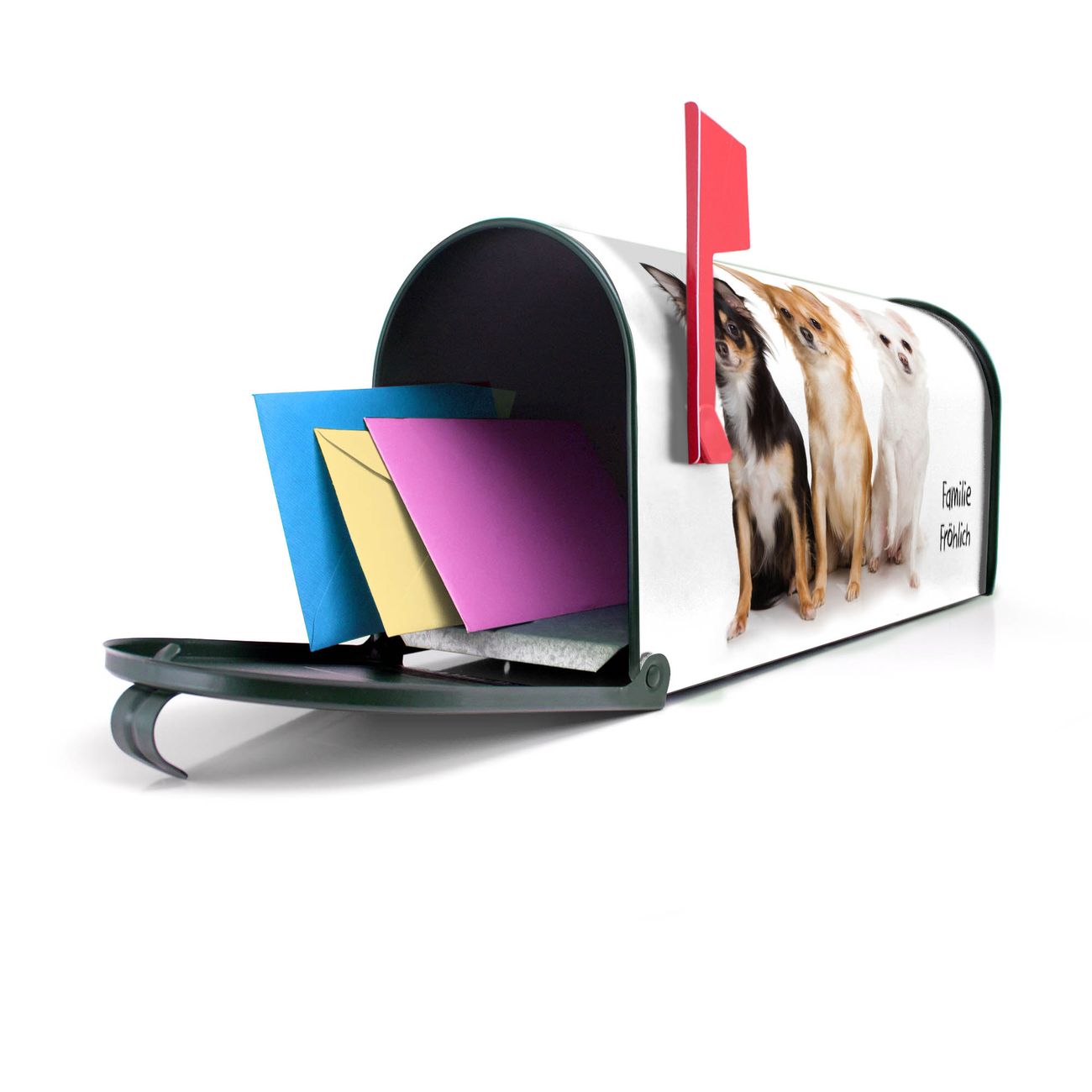 Unser amerikanischer Briefkasten mit dem Motiv Chihuahua hat ein sehr ansprechendes und ausgefallenes Design, ist in der Grundfarbe weiß, grün oder schwarz erhältlich. Damit entlocken Sie Ihren Nachbarn und dem Postboten immer wieder ein Lächeln. Die Mailbox ist ein Original Import aus Mississippi USA und wird von unserer kleinen Manufaktur in Sachsen von Hand veredelt. Die US-Mailbox bietet ausreichend Platz auch für große Sendungen, eine Fahne die Ihnen Post anzeigt, wetterfestes und äußerst stabiles Material - so macht Post empfangen Freude.