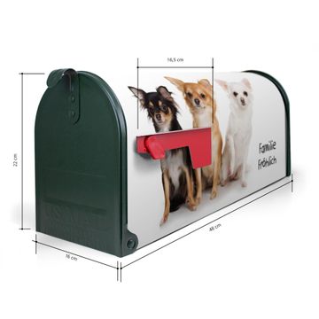 Der amerikanische Briefkasten von banjado mit Chihuahua Motiv bietet Ihnen ausreichend Fassungsvermögen, um große A4 Sendungen und Zeitschriften zu empfangen. Die typisch amerikanische rote Fahne zeigt Ihnen an, wenn Sie Post erhalten haben. Die US-Mailbox besteht aus verzinktem Stahlblech welches lackiert wurde und ist 48 x 22 x 16 CM (BxHxT) groß. Die Folie mit Motiv Chihuahua besteht aus einer wetter- und UV-resistenten Folie, die mit einem Schutzlaminat überzogen ist, sodass die US Mailbox zusätzlich vor Kratzern geschützt ist. An der Unterkante sind 4 Löcher je Seite um die Mailbox, typisch amerikanisch, an einem Holzpfahl oder einem Zaun zu befestigen. Auf Wunsch können Sie bei uns den passenden Standfuß oder die passende Wandhalterung kaufen um die US-Mailbox sicher zu befestigen. Wir bieten Ihnen ebenfalls Namensschilder, bereits beschriftet oder frei zu beschriften, und verschiedene selbst gestaltete Bitte-Keine-Werbung-Aufkleber.