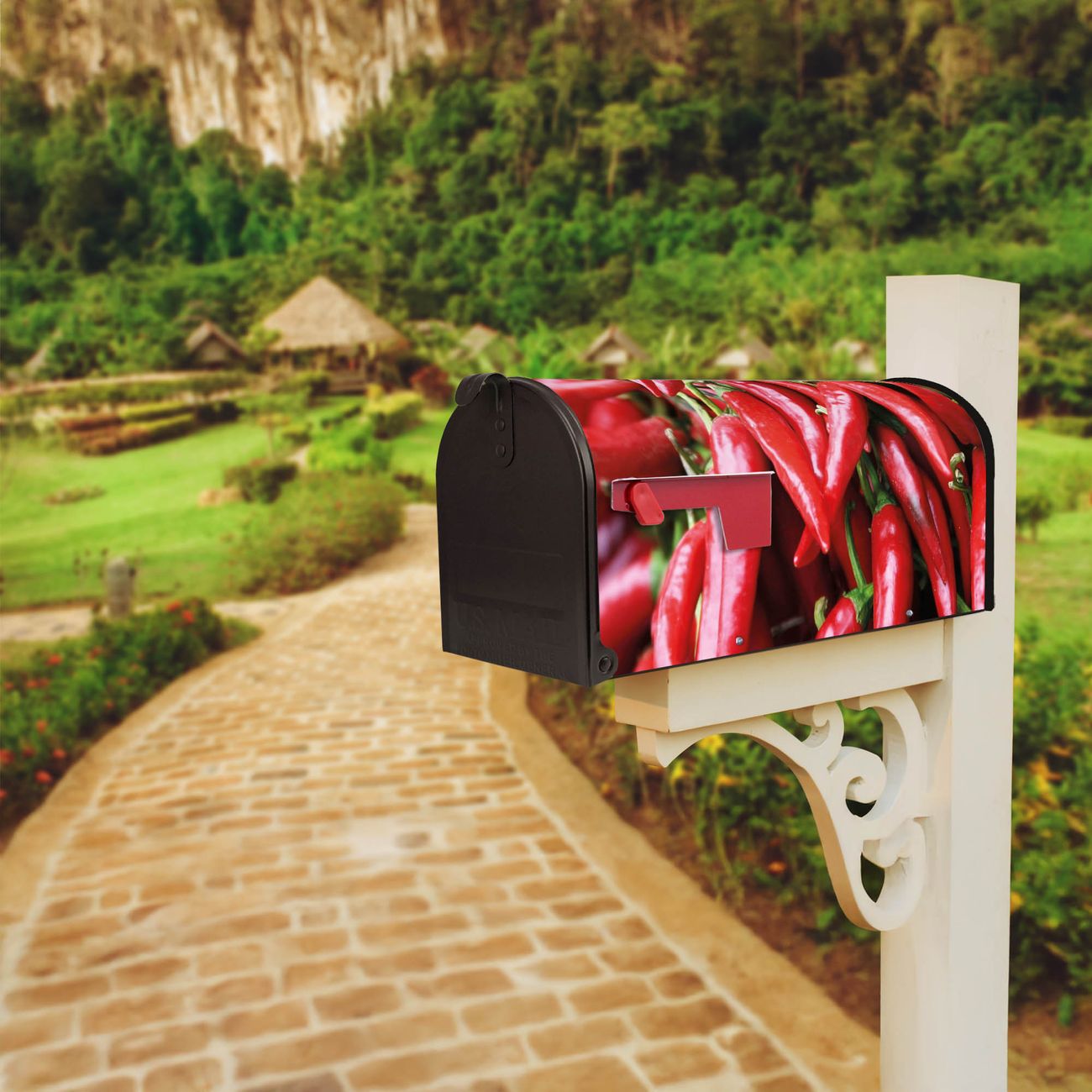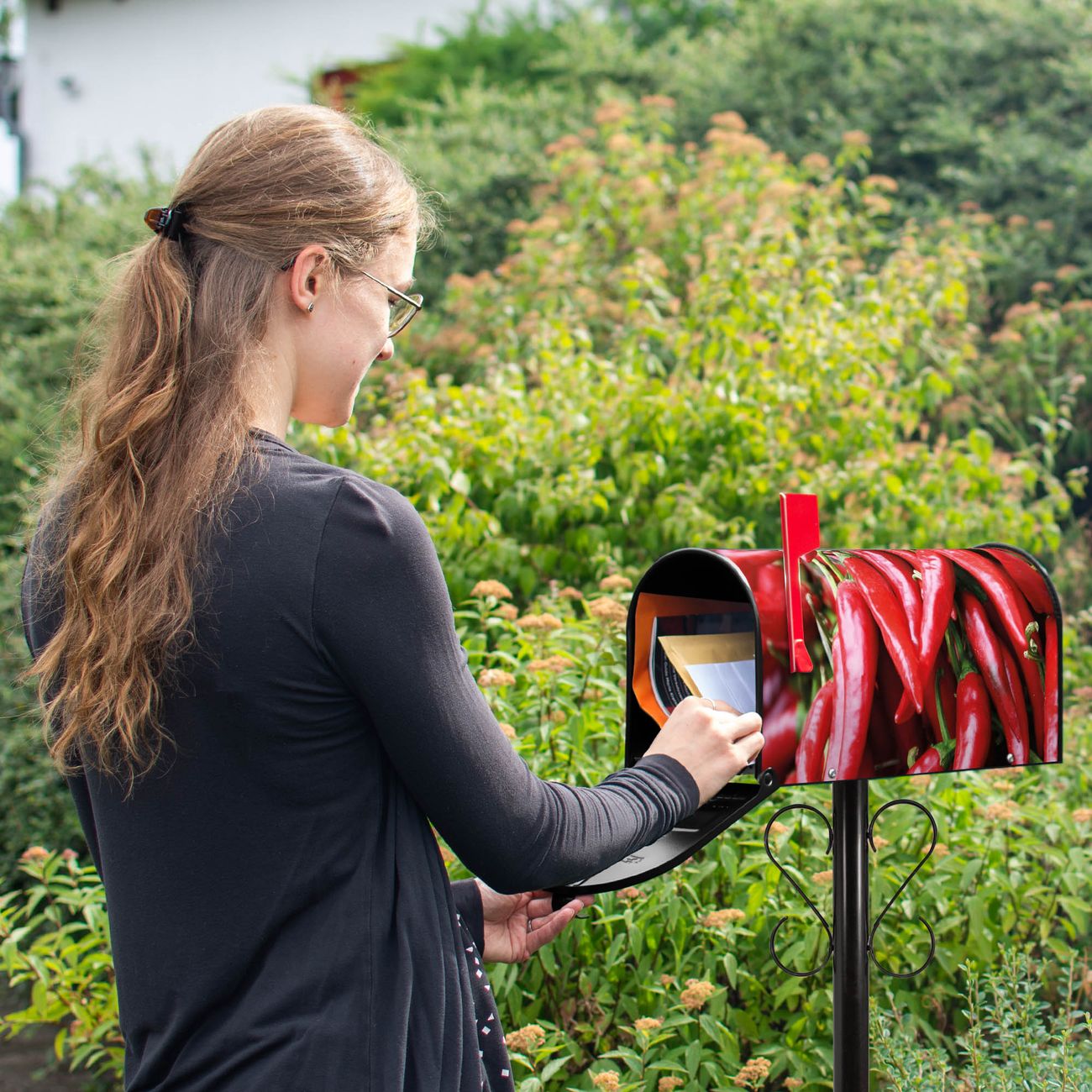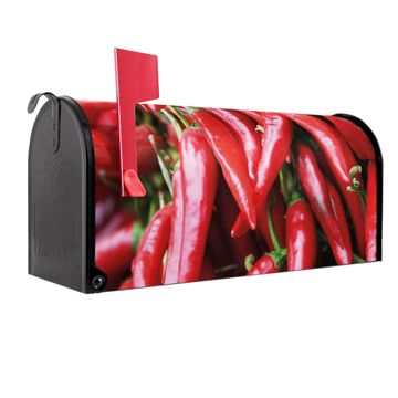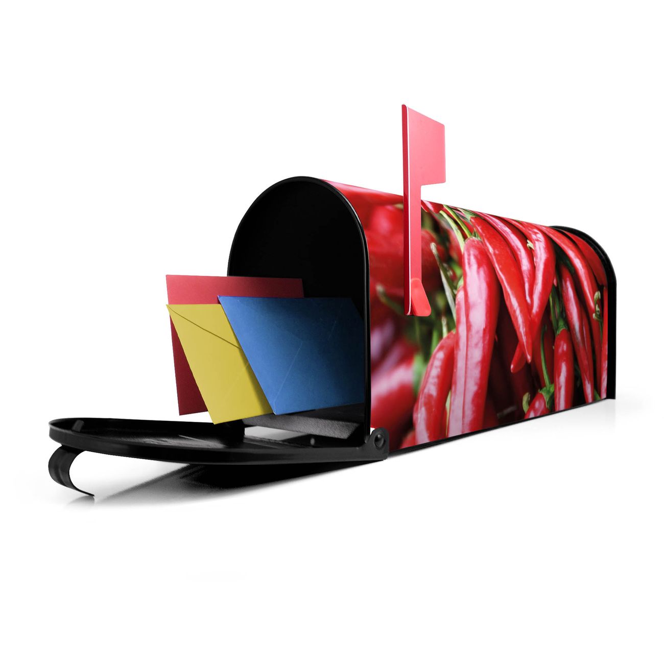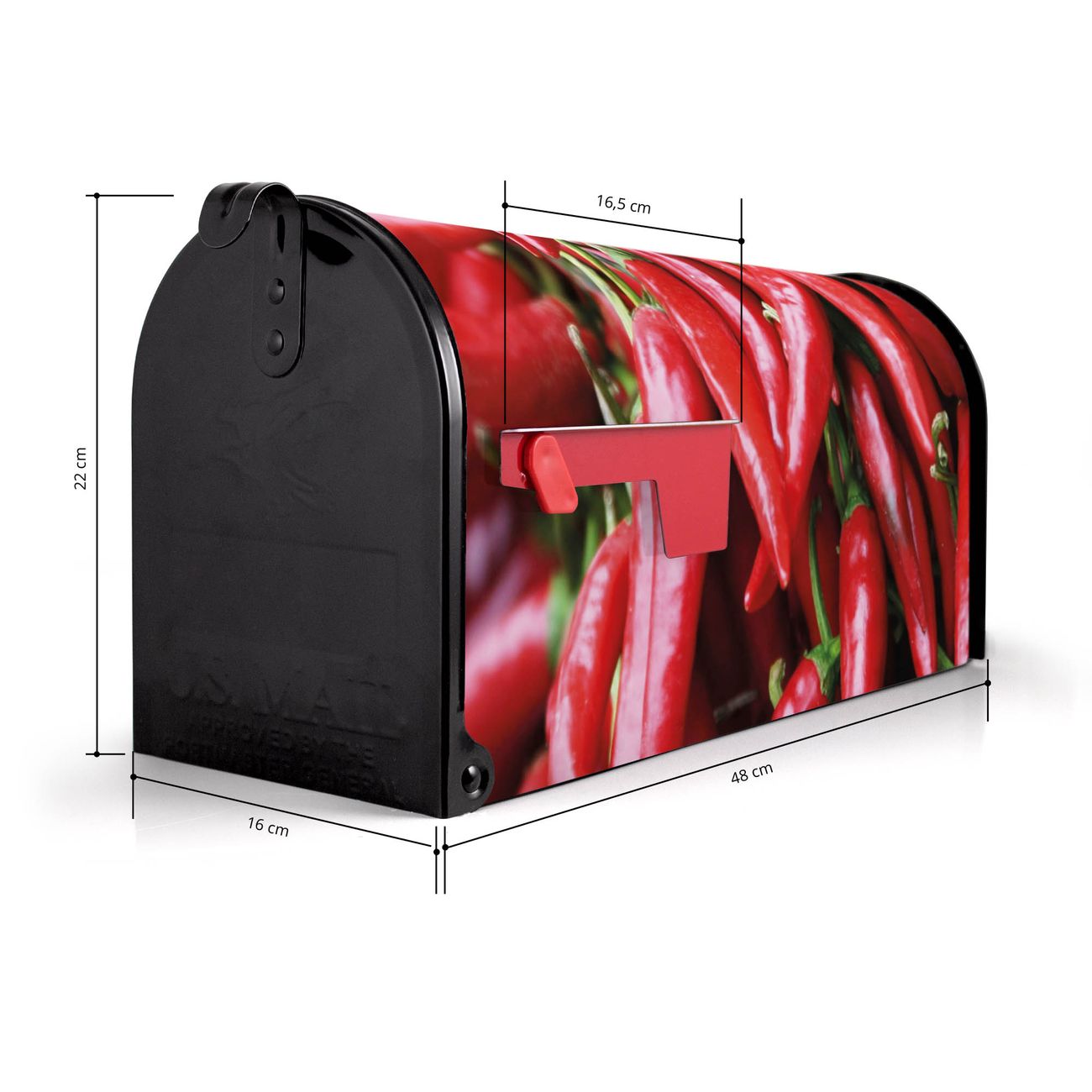 Der amerikanische Briefkasten von banjado mit Chilli Motiv bietet Ihnen ausreichend Fassungsvermögen, um große A4 Sendungen und Zeitschriften zu empfangen. Die typisch amerikanische rote Fahne zeigt Ihnen an, wenn Sie Post erhalten haben. Die US-Mailbox besteht aus verzinktem Stahlblech welches lackiert wurde und ist 48 x 22 x 16 CM (BxHxT) groß. Die Folie mit Motiv Chilli besteht aus einer wetter- und UV-resistenten Folie, die mit einem Schutzlaminat überzogen ist, sodass die US Mailbox zusätzlich vor Kratzern geschützt ist. An der Unterkante sind 4 Löcher je Seite um die Mailbox, typisch amerikanisch, an einem Holzpfahl oder einem Zaun zu befestigen. Auf Wunsch können Sie bei uns den passenden Standfuß oder die passende Wandhalterung kaufen um die US-Mailbox sicher zu befestigen. Wir bieten Ihnen ebenfalls Namensschilder, bereits beschriftet oder frei zu beschriften, und verschiedene selbst gestaltete Bitte-Keine-Werbung-Aufkleber.