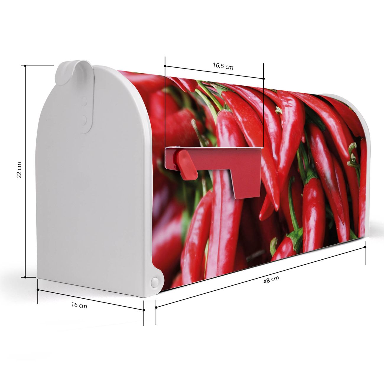 Der amerikanische Briefkasten von banjado mit Chilli Motiv bietet Ihnen ausreichend Fassungsvermögen, um große A4 Sendungen und Zeitschriften zu empfangen. Die typisch amerikanische rote Fahne zeigt Ihnen an, wenn Sie Post erhalten haben. Die US-Mailbox besteht aus verzinktem Stahlblech welches lackiert wurde und ist 48 x 22 x 16 CM (BxHxT) groß. Die Folie mit Motiv Chilli besteht aus einer wetter- und UV-resistenten Folie, die mit einem Schutzlaminat überzogen ist, sodass die US Mailbox zusätzlich vor Kratzern geschützt ist. An der Unterkante sind 4 Löcher je Seite um die Mailbox, typisch amerikanisch, an einem Holzpfahl oder einem Zaun zu befestigen. Auf Wunsch können Sie bei uns den passenden Standfuß oder die passende Wandhalterung kaufen um die US-Mailbox sicher zu befestigen. Wir bieten Ihnen ebenfalls Namensschilder, bereits beschriftet oder frei zu beschriften, und verschiedene selbst gestaltete Bitte-Keine-Werbung-Aufkleber.