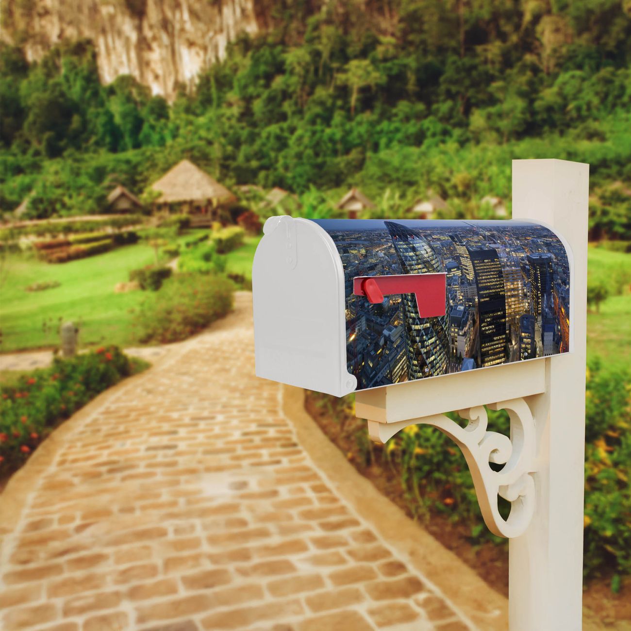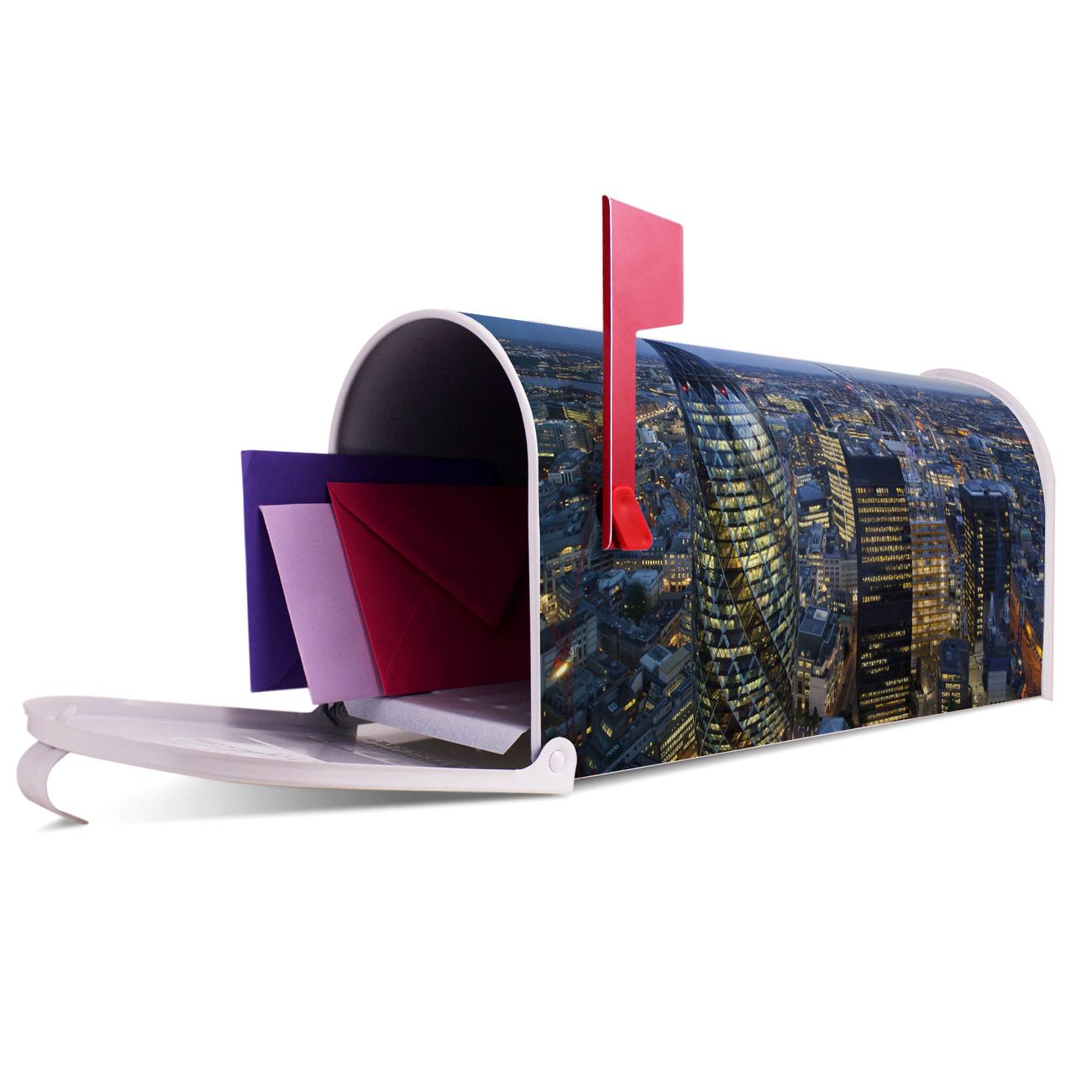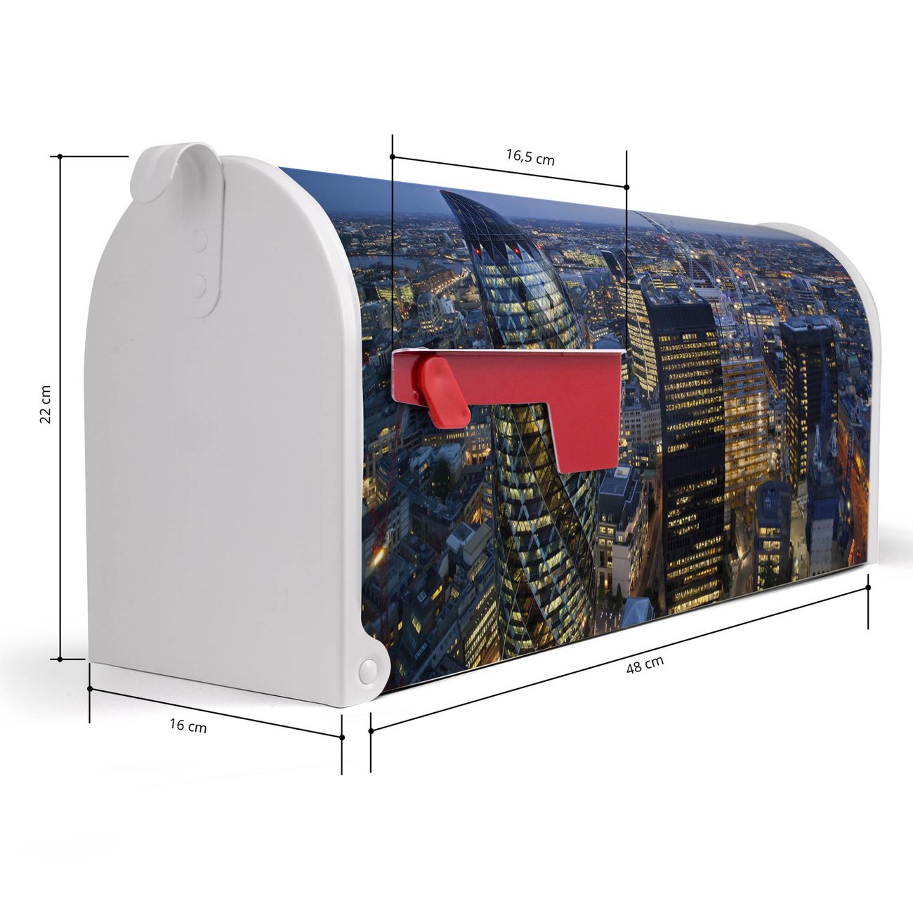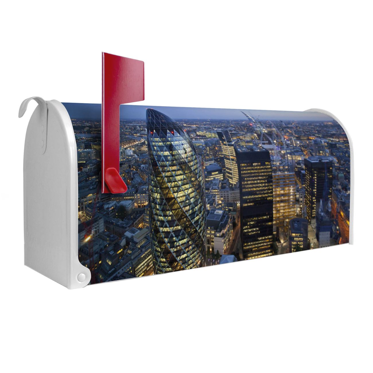 Der amerikanische Briefkasten von banjado mit City Of London Motiv bietet Ihnen ausreichend Fassungsvermögen, um große A4 Sendungen und Zeitschriften zu empfangen. Die typisch amerikanische rote Fahne zeigt Ihnen an, wenn Sie Post erhalten haben. Die US-Mailbox besteht aus verzinktem Stahlblech welches lackiert wurde und ist 48 x 22 x 16 CM (BxHxT) groß. Die Folie mit Motiv City Of London besteht aus einer wetter- und UV-resistenten Folie, die mit einem Schutzlaminat überzogen ist, sodass die US Mailbox zusätzlich vor Kratzern geschützt ist. An der Unterkante sind 4 Löcher je Seite um die Mailbox, typisch amerikanisch, an einem Holzpfahl oder einem Zaun zu befestigen. Auf Wunsch können Sie bei uns den passenden Standfuß oder die passende Wandhalterung kaufen um die US-Mailbox sicher zu befestigen. Wir bieten Ihnen ebenfalls Namensschilder, bereits beschriftet oder frei zu beschriften, und verschiedene selbst gestaltete Bitte-Keine-Werbung-Aufkleber.