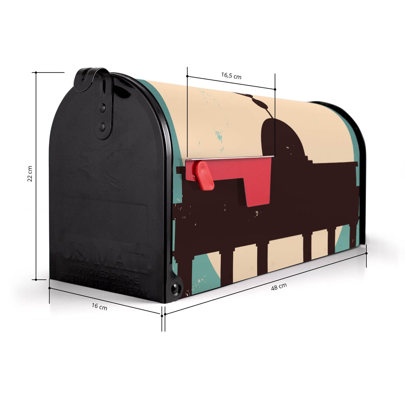 Der amerikanische Briefkasten von banjado mit City Poster Berlin Motiv bietet Ihnen ausreichend Fassungsvermögen, um große A4 Sendungen und Zeitschriften zu empfangen. Die typisch amerikanische rote Fahne zeigt Ihnen an, wenn Sie Post erhalten haben. Die US-Mailbox besteht aus verzinktem Stahlblech welches lackiert wurde und ist 48 x 22 x 16 CM (BxHxT) groß. Die Folie mit Motiv City Poster Berlin besteht aus einer wetter- und UV-resistenten Folie, die mit einem Schutzlaminat überzogen ist, sodass die US Mailbox zusätzlich vor Kratzern geschützt ist. An der Unterkante sind 4 Löcher je Seite um die Mailbox, typisch amerikanisch, an einem Holzpfahl oder einem Zaun zu befestigen. Auf Wunsch können Sie bei uns den passenden Standfuß oder die passende Wandhalterung kaufen um die US-Mailbox sicher zu befestigen. Wir bieten Ihnen ebenfalls Namensschilder, bereits beschriftet oder frei zu beschriften, und verschiedene selbst gestaltete Bitte-Keine-Werbung-Aufkleber.