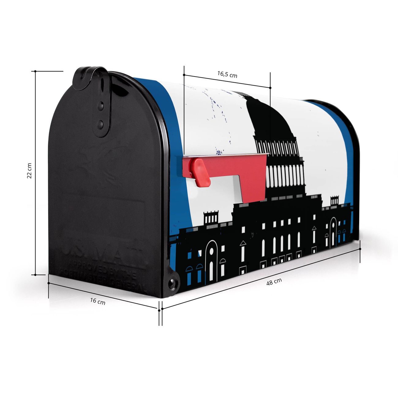 Der amerikanische Briefkasten von banjado mit City Poster Washington Motiv bietet Ihnen ausreichend Fassungsvermögen, um große A4 Sendungen und Zeitschriften zu empfangen. Die typisch amerikanische rote Fahne zeigt Ihnen an, wenn Sie Post erhalten haben. Die US-Mailbox besteht aus verzinktem Stahlblech welches lackiert wurde und ist 48 x 22 x 16 CM (BxHxT) groß. Die Folie mit Motiv City Poster Washington besteht aus einer wetter- und UV-resistenten Folie, die mit einem Schutzlaminat überzogen ist, sodass die US Mailbox zusätzlich vor Kratzern geschützt ist. An der Unterkante sind 4 Löcher je Seite um die Mailbox, typisch amerikanisch, an einem Holzpfahl oder einem Zaun zu befestigen. Auf Wunsch können Sie bei uns den passenden Standfuß oder die passende Wandhalterung kaufen um die US-Mailbox sicher zu befestigen. Wir bieten Ihnen ebenfalls Namensschilder, bereits beschriftet oder frei zu beschriften, und verschiedene selbst gestaltete Bitte-Keine-Werbung-Aufkleber.