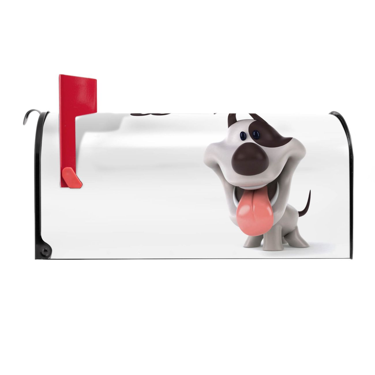 Der amerikanische Briefkasten von banjado mit Comic-Hund Motiv bietet Ihnen ausreichend Fassungsvermögen, um große A4 Sendungen und Zeitschriften zu empfangen. Die typisch amerikanische rote Fahne zeigt Ihnen an, wenn Sie Post erhalten haben. Die US-Mailbox besteht aus verzinktem Stahlblech welches lackiert wurde und ist 48 x 22 x 16 CM (BxHxT) groß. Die Folie mit Motiv Comic-Hund besteht aus einer wetter- und UV-resistenten Folie, die mit einem Schutzlaminat überzogen ist, sodass die US Mailbox zusätzlich vor Kratzern geschützt ist. An der Unterkante sind 4 Löcher je Seite um die Mailbox, typisch amerikanisch, an einem Holzpfahl oder einem Zaun zu befestigen. Auf Wunsch können Sie bei uns den passenden Standfuß oder die passende Wandhalterung kaufen um die US-Mailbox sicher zu befestigen. Wir bieten Ihnen ebenfalls Namensschilder, bereits beschriftet oder frei zu beschriften, und verschiedene selbst gestaltete Bitte-Keine-Werbung-Aufkleber.