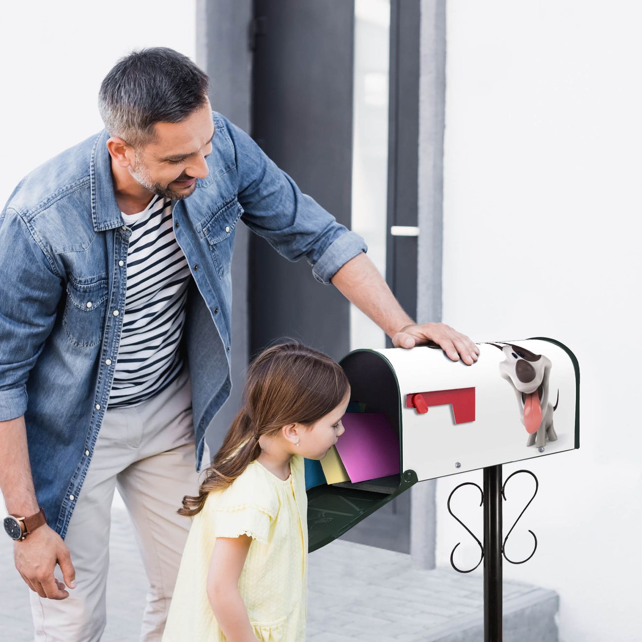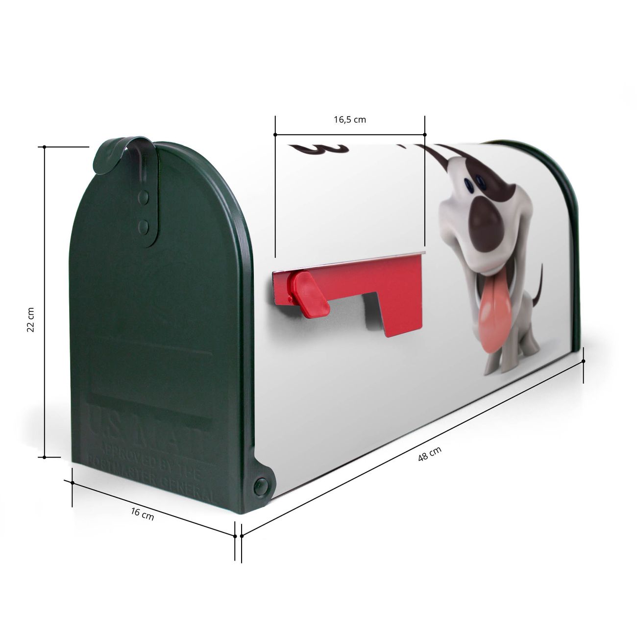 Der amerikanische Briefkasten von banjado mit Comic-Hund Motiv bietet Ihnen ausreichend Fassungsvermögen, um große A4 Sendungen und Zeitschriften zu empfangen. Die typisch amerikanische rote Fahne zeigt Ihnen an, wenn Sie Post erhalten haben. Die US-Mailbox besteht aus verzinktem Stahlblech welches lackiert wurde und ist 48 x 22 x 16 CM (BxHxT) groß. Die Folie mit Motiv Comic-Hund besteht aus einer wetter- und UV-resistenten Folie, die mit einem Schutzlaminat überzogen ist, sodass die US Mailbox zusätzlich vor Kratzern geschützt ist. An der Unterkante sind 4 Löcher je Seite um die Mailbox, typisch amerikanisch, an einem Holzpfahl oder einem Zaun zu befestigen. Auf Wunsch können Sie bei uns den passenden Standfuß oder die passende Wandhalterung kaufen um die US-Mailbox sicher zu befestigen. Wir bieten Ihnen ebenfalls Namensschilder, bereits beschriftet oder frei zu beschriften, und verschiedene selbst gestaltete Bitte-Keine-Werbung-Aufkleber.