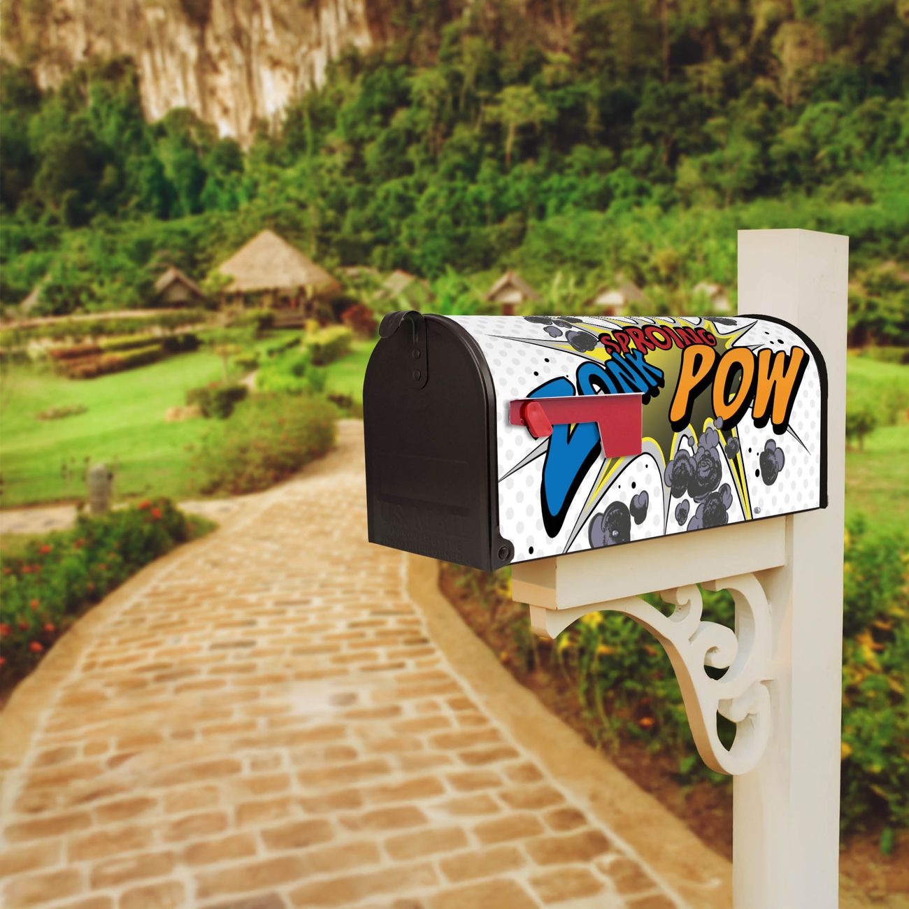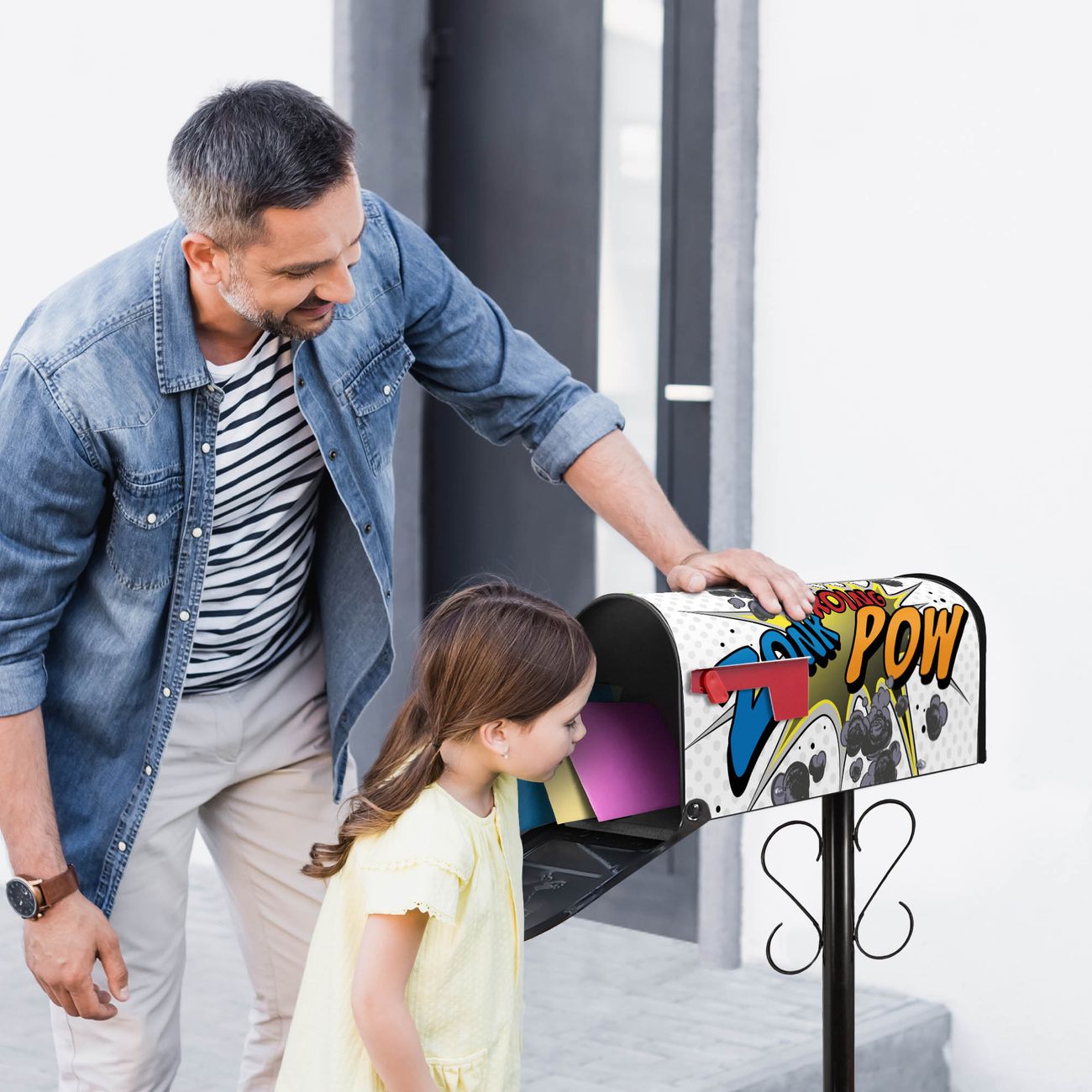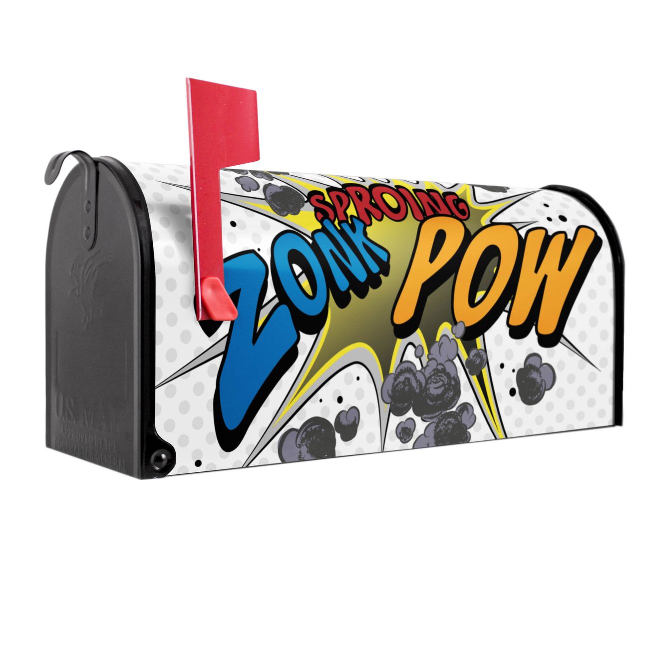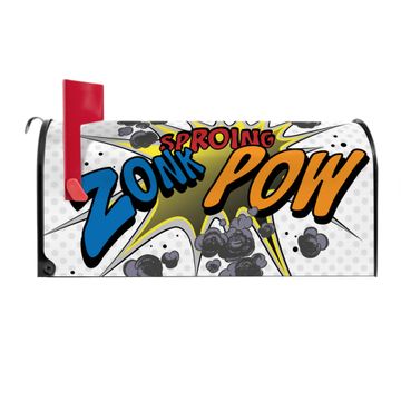Der amerikanische Briefkasten von banjado mit Comic Motiv bietet Ihnen ausreichend Fassungsvermögen, um große A4 Sendungen und Zeitschriften zu empfangen. Die typisch amerikanische rote Fahne zeigt Ihnen an, wenn Sie Post erhalten haben. Die US-Mailbox besteht aus verzinktem Stahlblech welches lackiert wurde und ist 48 x 22 x 16 CM (BxHxT) groß. Die Folie mit Motiv Comic besteht aus einer wetter- und UV-resistenten Folie, die mit einem Schutzlaminat überzogen ist, sodass die US Mailbox zusätzlich vor Kratzern geschützt ist. An der Unterkante sind 4 Löcher je Seite um die Mailbox, typisch amerikanisch, an einem Holzpfahl oder einem Zaun zu befestigen. Auf Wunsch können Sie bei uns den passenden Standfuß oder die passende Wandhalterung kaufen um die US-Mailbox sicher zu befestigen. Wir bieten Ihnen ebenfalls Namensschilder, bereits beschriftet oder frei zu beschriften, und verschiedene selbst gestaltete Bitte-Keine-Werbung-Aufkleber.