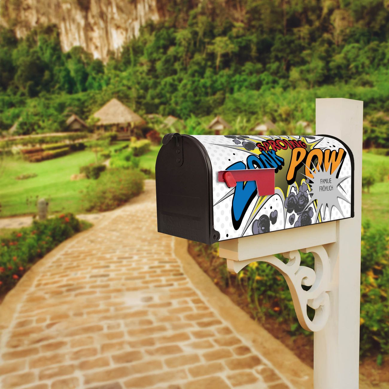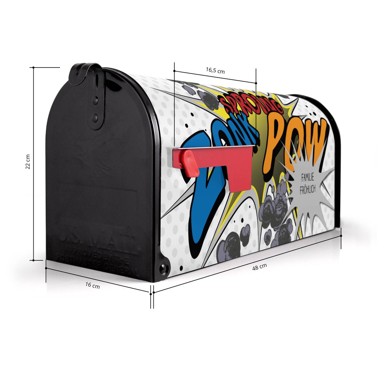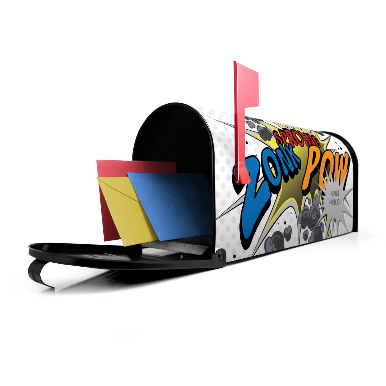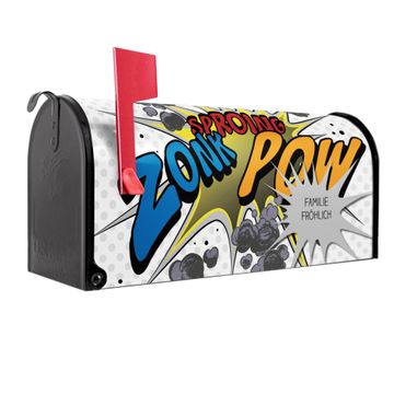 Der amerikanische Briefkasten von banjado mit Comic Motiv bietet Ihnen ausreichend Fassungsvermögen, um große A4 Sendungen und Zeitschriften zu empfangen. Die typisch amerikanische rote Fahne zeigt Ihnen an, wenn Sie Post erhalten haben. Die US-Mailbox besteht aus verzinktem Stahlblech welches lackiert wurde und ist 48 x 22 x 16 CM (BxHxT) groß. Die Folie mit Motiv Comic besteht aus einer wetter- und UV-resistenten Folie, die mit einem Schutzlaminat überzogen ist, sodass die US Mailbox zusätzlich vor Kratzern geschützt ist. An der Unterkante sind 4 Löcher je Seite um die Mailbox, typisch amerikanisch, an einem Holzpfahl oder einem Zaun zu befestigen. Auf Wunsch können Sie bei uns den passenden Standfuß oder die passende Wandhalterung kaufen um die US-Mailbox sicher zu befestigen. Wir bieten Ihnen ebenfalls Namensschilder, bereits beschriftet oder frei zu beschriften, und verschiedene selbst gestaltete Bitte-Keine-Werbung-Aufkleber.