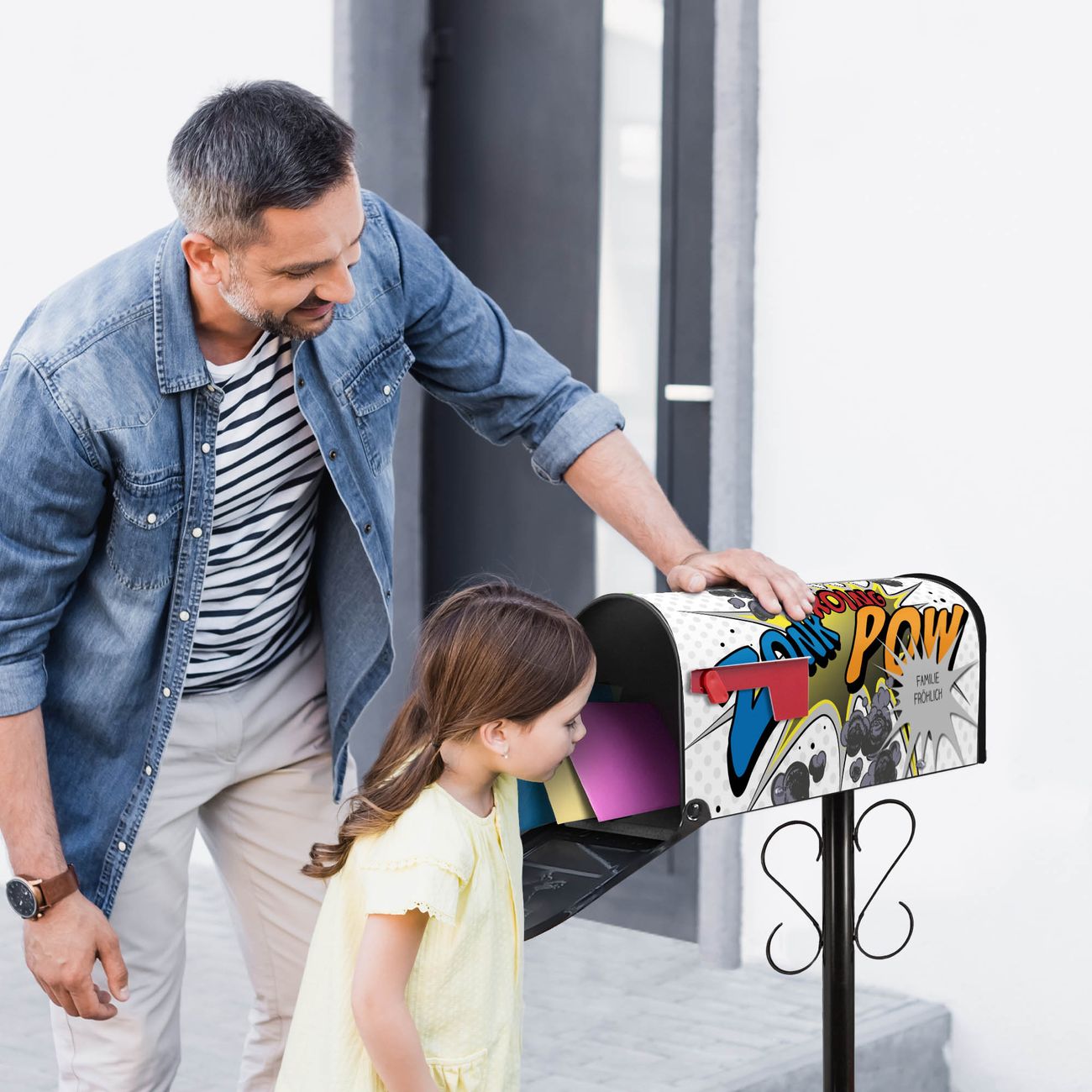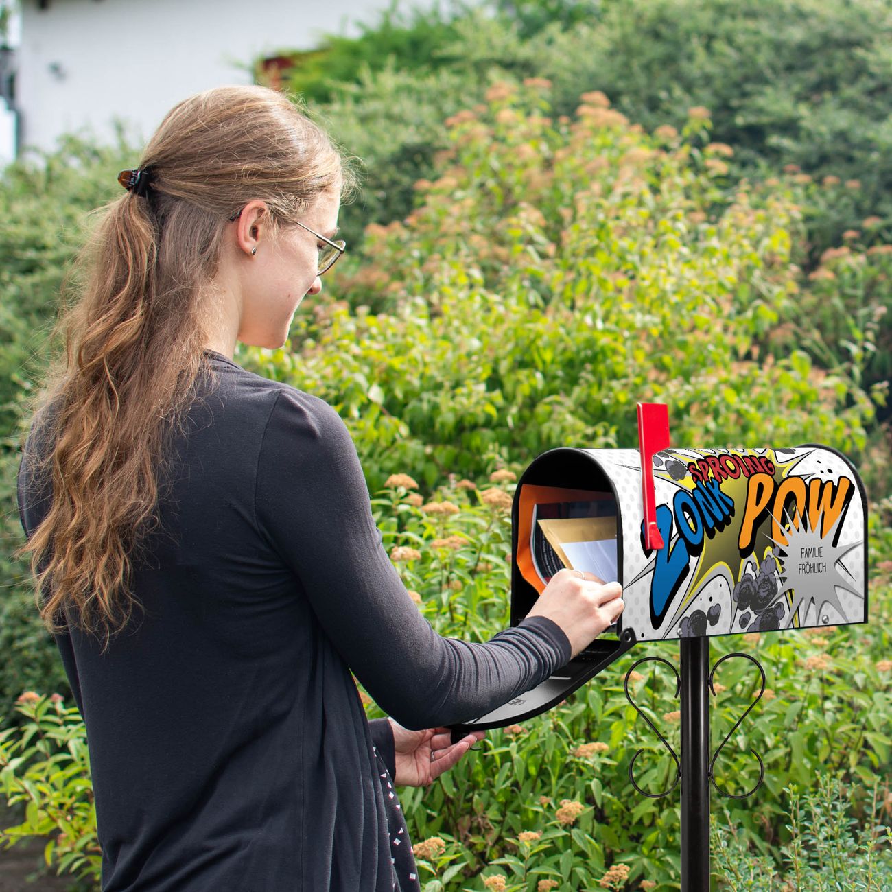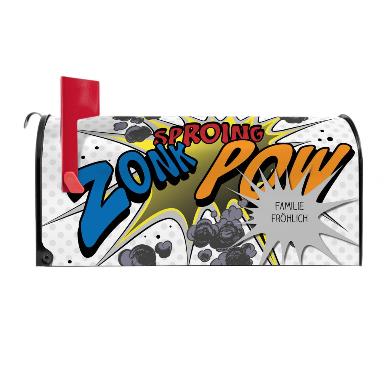 Der amerikanische Briefkasten von banjado mit Comic Motiv bietet Ihnen ausreichend Fassungsvermögen, um große A4 Sendungen und Zeitschriften zu empfangen. Die typisch amerikanische rote Fahne zeigt Ihnen an, wenn Sie Post erhalten haben. Die US-Mailbox besteht aus verzinktem Stahlblech welches lackiert wurde und ist 48 x 22 x 16 CM (BxHxT) groß. Die Folie mit Motiv Comic besteht aus einer wetter- und UV-resistenten Folie, die mit einem Schutzlaminat überzogen ist, sodass die US Mailbox zusätzlich vor Kratzern geschützt ist. An der Unterkante sind 4 Löcher je Seite um die Mailbox, typisch amerikanisch, an einem Holzpfahl oder einem Zaun zu befestigen. Auf Wunsch können Sie bei uns den passenden Standfuß oder die passende Wandhalterung kaufen um die US-Mailbox sicher zu befestigen. Wir bieten Ihnen ebenfalls Namensschilder, bereits beschriftet oder frei zu beschriften, und verschiedene selbst gestaltete Bitte-Keine-Werbung-Aufkleber.