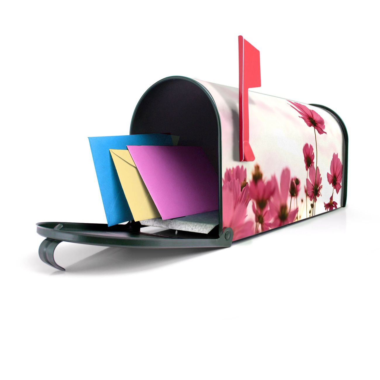 Der amerikanische Briefkasten von banjado mit Cosmea Motiv bietet Ihnen ausreichend Fassungsvermögen, um große A4 Sendungen und Zeitschriften zu empfangen. Die typisch amerikanische rote Fahne zeigt Ihnen an, wenn Sie Post erhalten haben. Die US-Mailbox besteht aus verzinktem Stahlblech welches lackiert wurde und ist 48 x 22 x 16 CM (BxHxT) groß. Die Folie mit Motiv Cosmea besteht aus einer wetter- und UV-resistenten Folie, die mit einem Schutzlaminat überzogen ist, sodass die US Mailbox zusätzlich vor Kratzern geschützt ist. An der Unterkante sind 4 Löcher je Seite um die Mailbox, typisch amerikanisch, an einem Holzpfahl oder einem Zaun zu befestigen. Auf Wunsch können Sie bei uns den passenden Standfuß oder die passende Wandhalterung kaufen um die US-Mailbox sicher zu befestigen. Wir bieten Ihnen ebenfalls Namensschilder, bereits beschriftet oder frei zu beschriften, und verschiedene selbst gestaltete Bitte-Keine-Werbung-Aufkleber.