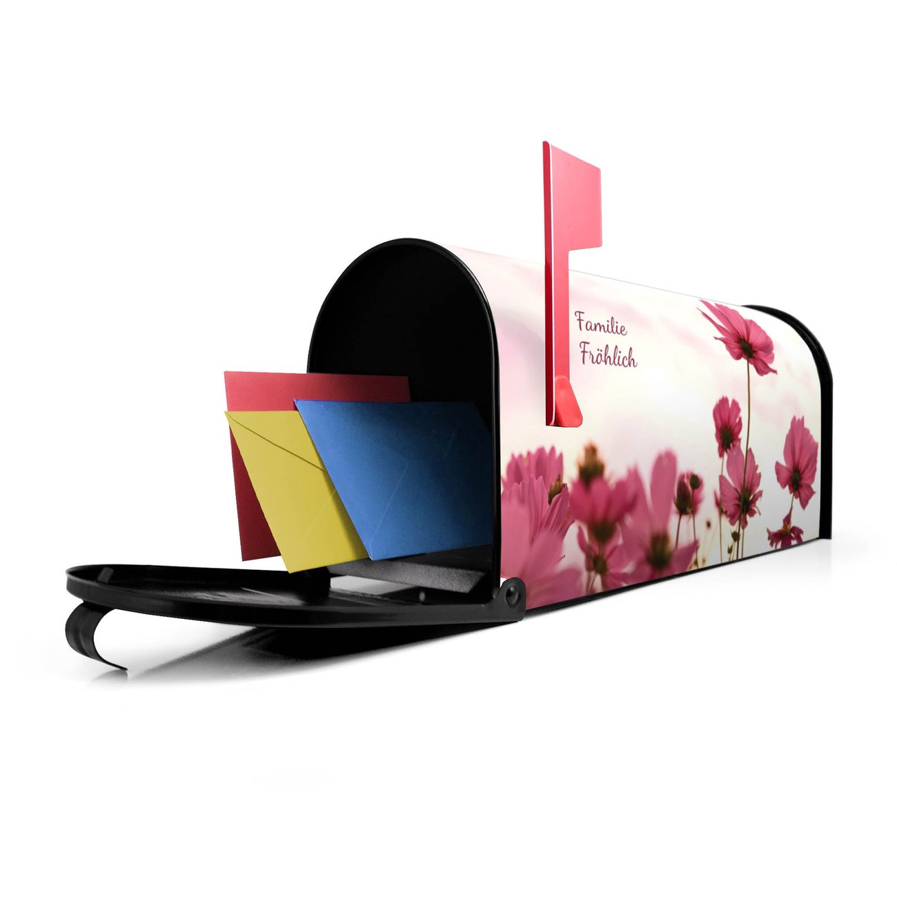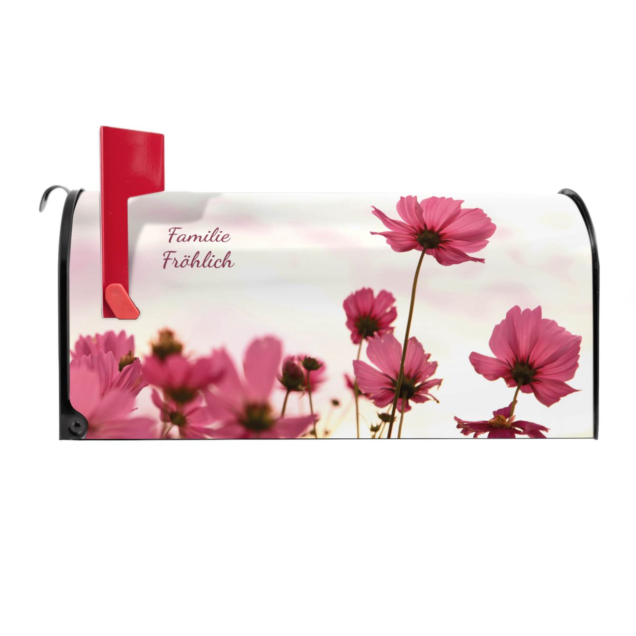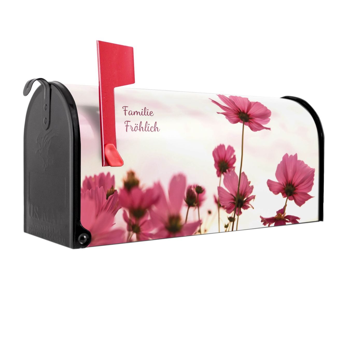 Der amerikanische Briefkasten von banjado mit Cosmea Motiv bietet Ihnen ausreichend Fassungsvermögen, um große A4 Sendungen und Zeitschriften zu empfangen. Die typisch amerikanische rote Fahne zeigt Ihnen an, wenn Sie Post erhalten haben. Die US-Mailbox besteht aus verzinktem Stahlblech welches lackiert wurde und ist 48 x 22 x 16 CM (BxHxT) groß. Die Folie mit Motiv Cosmea besteht aus einer wetter- und UV-resistenten Folie, die mit einem Schutzlaminat überzogen ist, sodass die US Mailbox zusätzlich vor Kratzern geschützt ist. An der Unterkante sind 4 Löcher je Seite um die Mailbox, typisch amerikanisch, an einem Holzpfahl oder einem Zaun zu befestigen. Auf Wunsch können Sie bei uns den passenden Standfuß oder die passende Wandhalterung kaufen um die US-Mailbox sicher zu befestigen. Wir bieten Ihnen ebenfalls Namensschilder, bereits beschriftet oder frei zu beschriften, und verschiedene selbst gestaltete Bitte-Keine-Werbung-Aufkleber.