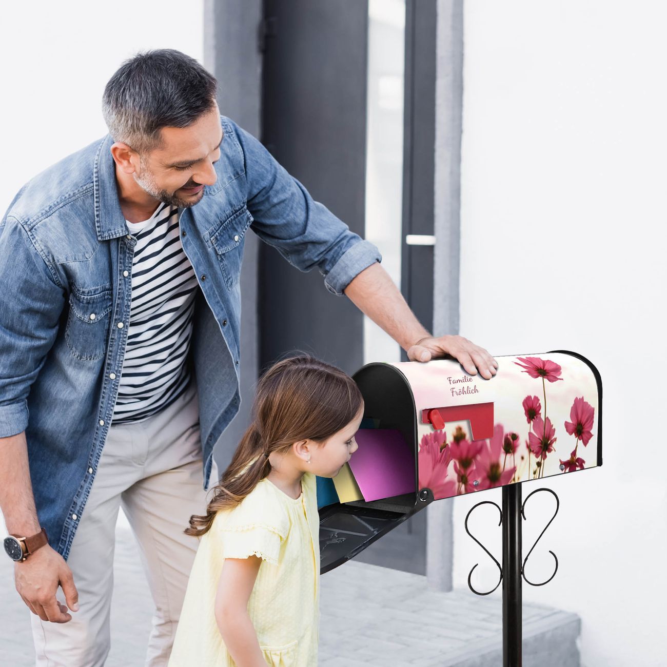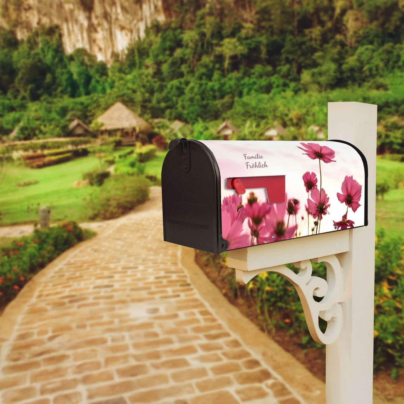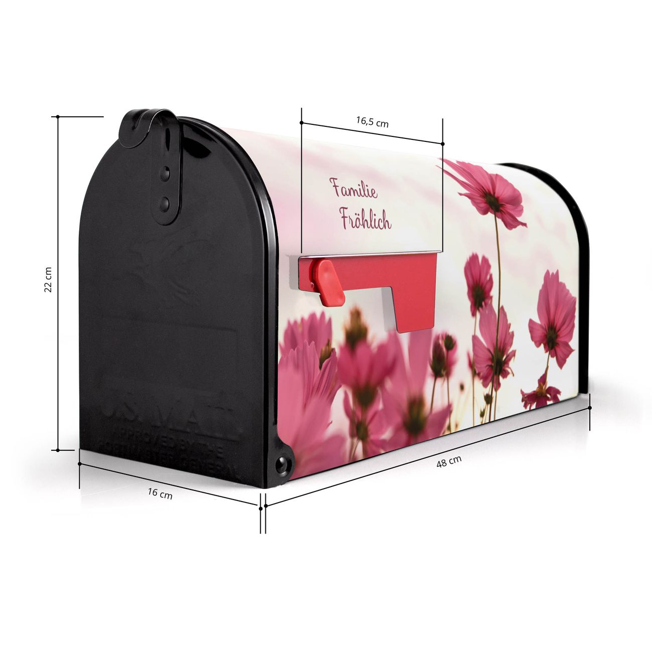 Der amerikanische Briefkasten von banjado mit Cosmea Motiv bietet Ihnen ausreichend Fassungsvermögen, um große A4 Sendungen und Zeitschriften zu empfangen. Die typisch amerikanische rote Fahne zeigt Ihnen an, wenn Sie Post erhalten haben. Die US-Mailbox besteht aus verzinktem Stahlblech welches lackiert wurde und ist 48 x 22 x 16 CM (BxHxT) groß. Die Folie mit Motiv Cosmea besteht aus einer wetter- und UV-resistenten Folie, die mit einem Schutzlaminat überzogen ist, sodass die US Mailbox zusätzlich vor Kratzern geschützt ist. An der Unterkante sind 4 Löcher je Seite um die Mailbox, typisch amerikanisch, an einem Holzpfahl oder einem Zaun zu befestigen. Auf Wunsch können Sie bei uns den passenden Standfuß oder die passende Wandhalterung kaufen um die US-Mailbox sicher zu befestigen. Wir bieten Ihnen ebenfalls Namensschilder, bereits beschriftet oder frei zu beschriften, und verschiedene selbst gestaltete Bitte-Keine-Werbung-Aufkleber.