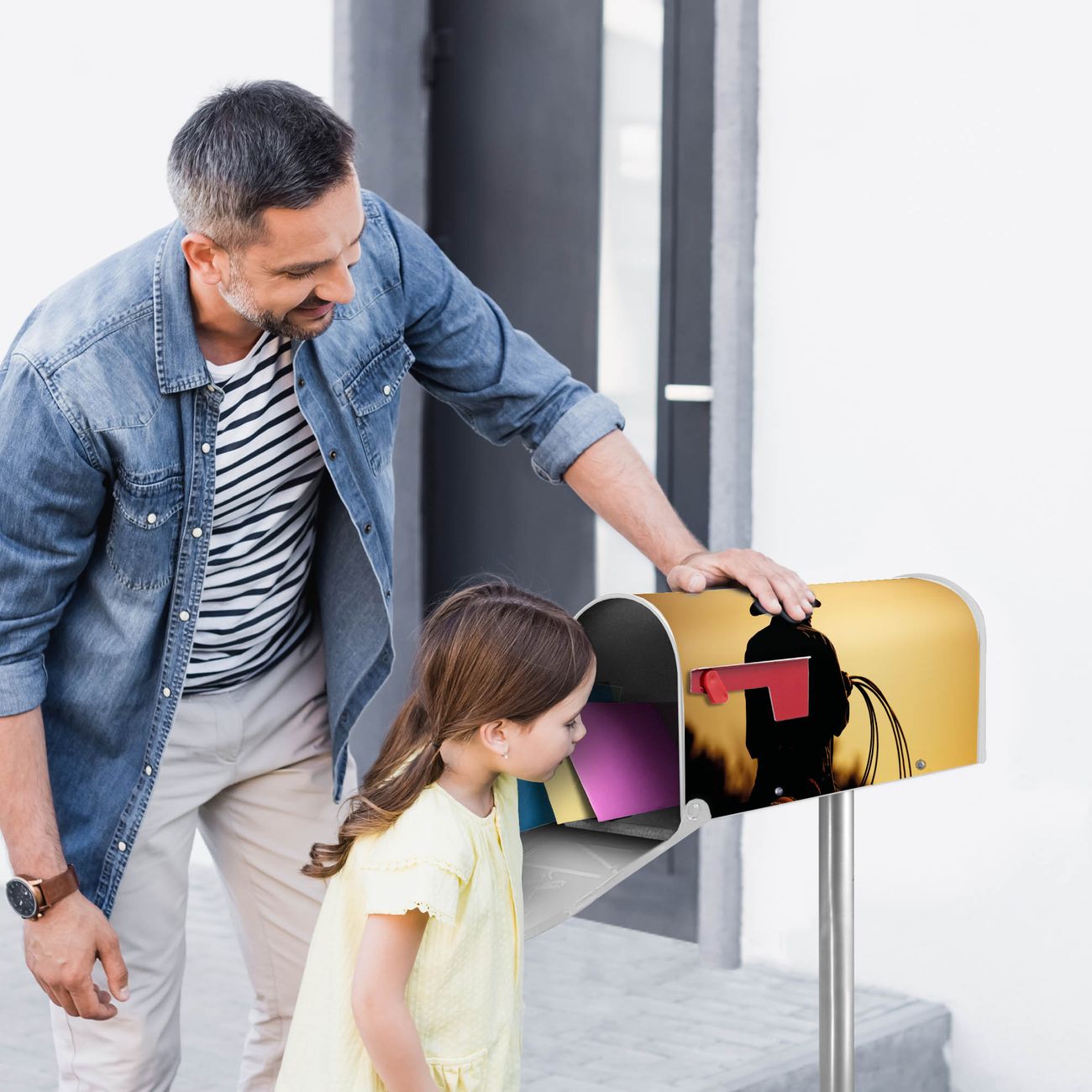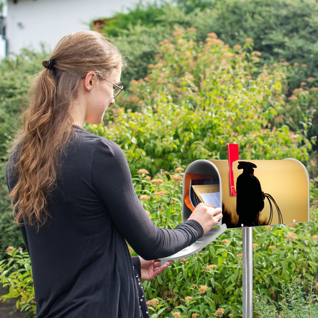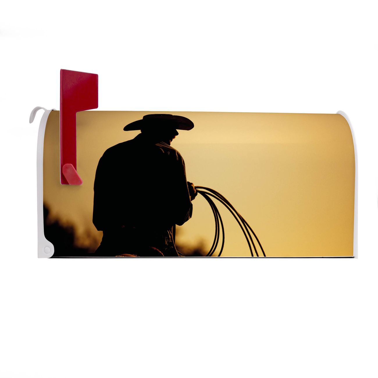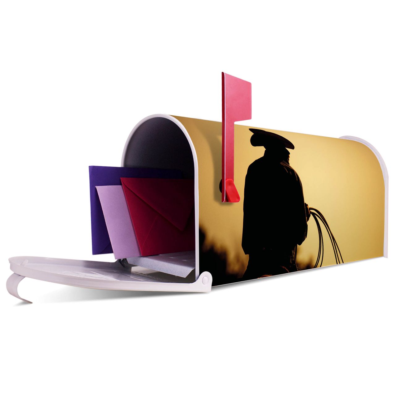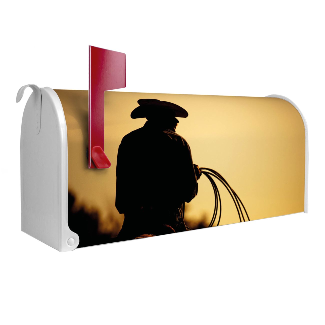 Der amerikanische Briefkasten von banjado mit Cowboy Motiv bietet Ihnen ausreichend Fassungsvermögen, um große A4 Sendungen und Zeitschriften zu empfangen. Die typisch amerikanische rote Fahne zeigt Ihnen an, wenn Sie Post erhalten haben. Die US-Mailbox besteht aus verzinktem Stahlblech welches lackiert wurde und ist 48 x 22 x 16 CM (BxHxT) groß. Die Folie mit Motiv Cowboy besteht aus einer wetter- und UV-resistenten Folie, die mit einem Schutzlaminat überzogen ist, sodass die US Mailbox zusätzlich vor Kratzern geschützt ist. An der Unterkante sind 4 Löcher je Seite um die Mailbox, typisch amerikanisch, an einem Holzpfahl oder einem Zaun zu befestigen. Auf Wunsch können Sie bei uns den passenden Standfuß oder die passende Wandhalterung kaufen um die US-Mailbox sicher zu befestigen. Wir bieten Ihnen ebenfalls Namensschilder, bereits beschriftet oder frei zu beschriften, und verschiedene selbst gestaltete Bitte-Keine-Werbung-Aufkleber.