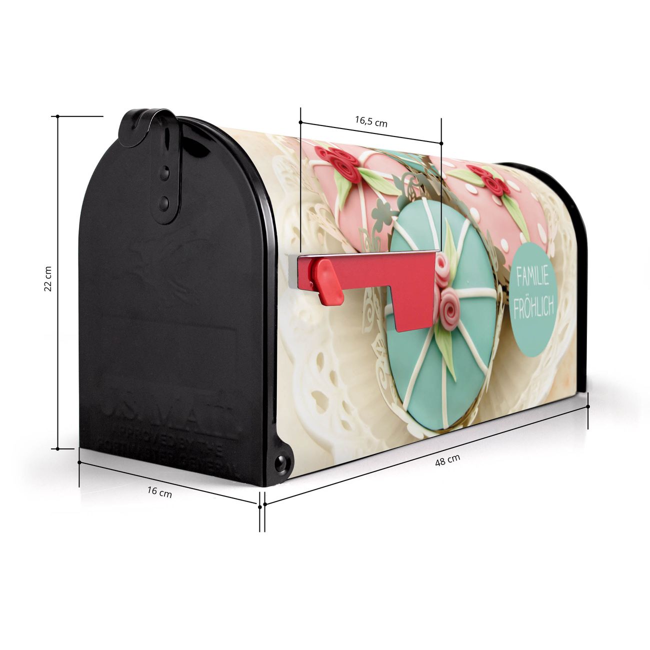 Der amerikanische Briefkasten von banjado mit Cupcakes Motiv bietet Ihnen ausreichend Fassungsvermögen, um große A4 Sendungen und Zeitschriften zu empfangen. Die typisch amerikanische rote Fahne zeigt Ihnen an, wenn Sie Post erhalten haben. Die US-Mailbox besteht aus verzinktem Stahlblech welches lackiert wurde und ist 48 x 22 x 16 CM (BxHxT) groß. Die Folie mit Motiv Cupcakes besteht aus einer wetter- und UV-resistenten Folie, die mit einem Schutzlaminat überzogen ist, sodass die US Mailbox zusätzlich vor Kratzern geschützt ist. An der Unterkante sind 4 Löcher je Seite um die Mailbox, typisch amerikanisch, an einem Holzpfahl oder einem Zaun zu befestigen. Auf Wunsch können Sie bei uns den passenden Standfuß oder die passende Wandhalterung kaufen um die US-Mailbox sicher zu befestigen. Wir bieten Ihnen ebenfalls Namensschilder, bereits beschriftet oder frei zu beschriften, und verschiedene selbst gestaltete Bitte-Keine-Werbung-Aufkleber.