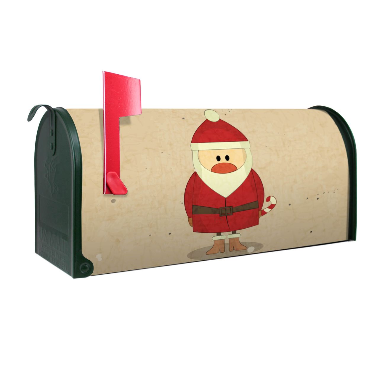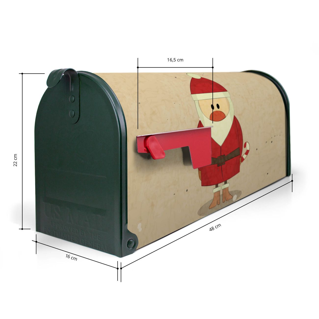 Der amerikanische Briefkasten von banjado mit Cute Claus Motiv bietet Ihnen ausreichend Fassungsvermögen, um große A4 Sendungen und Zeitschriften zu empfangen. Die typisch amerikanische rote Fahne zeigt Ihnen an, wenn Sie Post erhalten haben. Die US-Mailbox besteht aus verzinktem Stahlblech welches lackiert wurde und ist 48 x 22 x 16 CM (BxHxT) groß. Die Folie mit Motiv Cute Claus besteht aus einer wetter- und UV-resistenten Folie, die mit einem Schutzlaminat überzogen ist, sodass die US Mailbox zusätzlich vor Kratzern geschützt ist. An der Unterkante sind 4 Löcher je Seite um die Mailbox, typisch amerikanisch, an einem Holzpfahl oder einem Zaun zu befestigen. Auf Wunsch können Sie bei uns den passenden Standfuß oder die passende Wandhalterung kaufen um die US-Mailbox sicher zu befestigen. Wir bieten Ihnen ebenfalls Namensschilder, bereits beschriftet oder frei zu beschriften, und verschiedene selbst gestaltete Bitte-Keine-Werbung-Aufkleber.