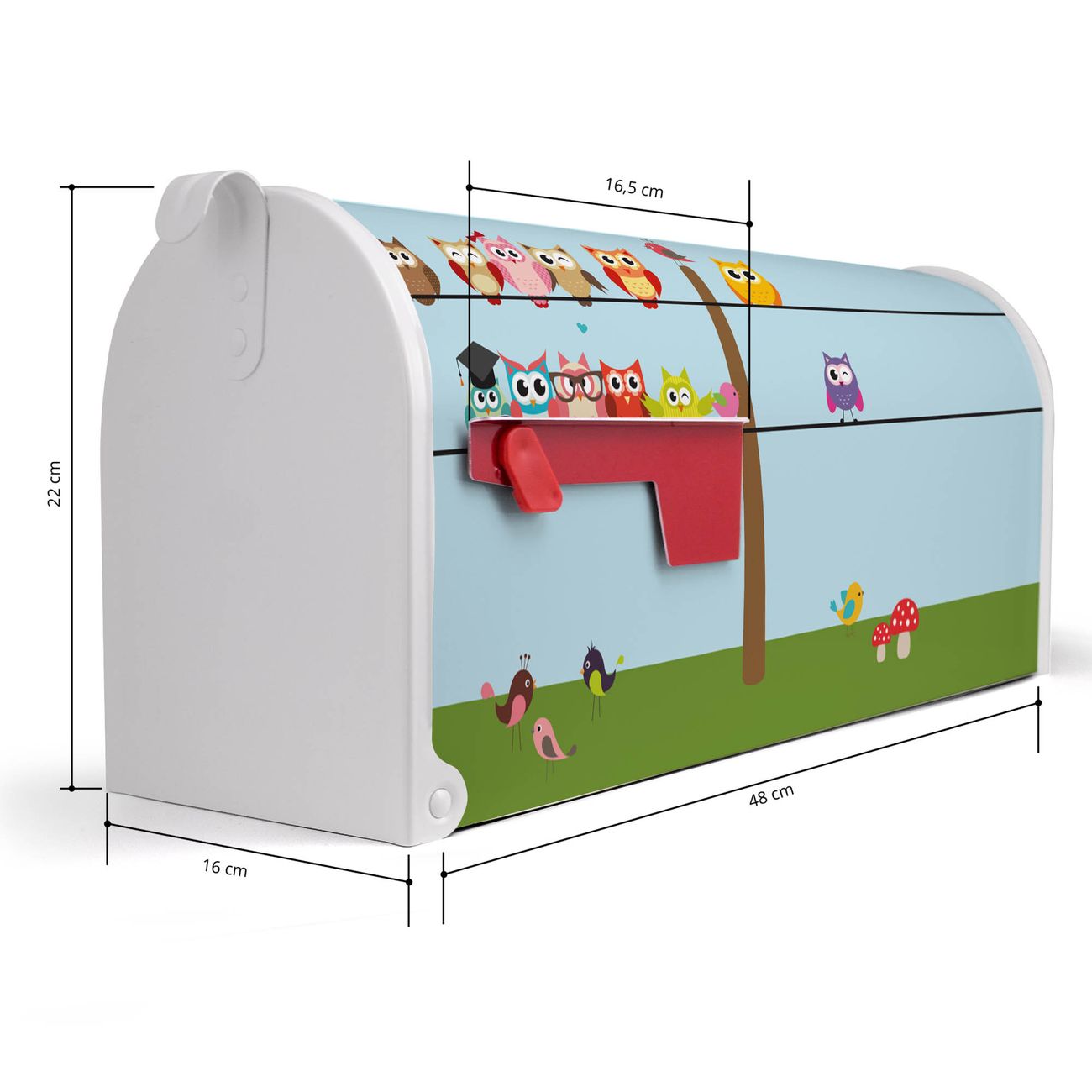 Der amerikanische Briefkasten von banjado mit Da Wären Wir Motiv bietet Ihnen ausreichend Fassungsvermögen, um große A4 Sendungen und Zeitschriften zu empfangen. Die typisch amerikanische rote Fahne zeigt Ihnen an, wenn Sie Post erhalten haben. Die US-Mailbox besteht aus verzinktem Stahlblech welches lackiert wurde und ist 48 x 22 x 16 CM (BxHxT) groß. Die Folie mit Motiv Da Wären Wir besteht aus einer wetter- und UV-resistenten Folie, die mit einem Schutzlaminat überzogen ist, sodass die US Mailbox zusätzlich vor Kratzern geschützt ist. An der Unterkante sind 4 Löcher je Seite um die Mailbox, typisch amerikanisch, an einem Holzpfahl oder einem Zaun zu befestigen. Auf Wunsch können Sie bei uns den passenden Standfuß oder die passende Wandhalterung kaufen um die US-Mailbox sicher zu befestigen. Wir bieten Ihnen ebenfalls Namensschilder, bereits beschriftet oder frei zu beschriften, und verschiedene selbst gestaltete Bitte-Keine-Werbung-Aufkleber.