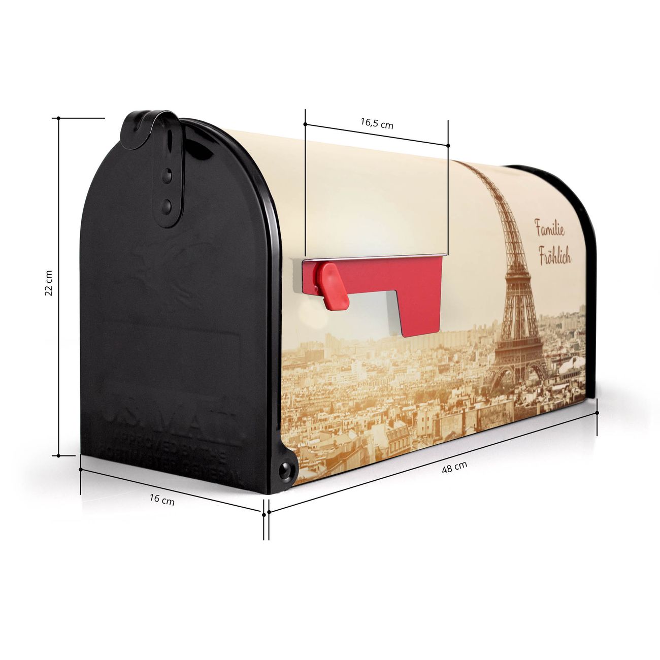 Der amerikanische Briefkasten von banjado mit Dächer Von Paris Motiv bietet Ihnen ausreichend Fassungsvermögen, um große A4 Sendungen und Zeitschriften zu empfangen. Die typisch amerikanische rote Fahne zeigt Ihnen an, wenn Sie Post erhalten haben. Die US-Mailbox besteht aus verzinktem Stahlblech welches lackiert wurde und ist 48 x 22 x 16 CM (BxHxT) groß. Die Folie mit Motiv Dächer Von Paris besteht aus einer wetter- und UV-resistenten Folie, die mit einem Schutzlaminat überzogen ist, sodass die US Mailbox zusätzlich vor Kratzern geschützt ist. An der Unterkante sind 4 Löcher je Seite um die Mailbox, typisch amerikanisch, an einem Holzpfahl oder einem Zaun zu befestigen. Auf Wunsch können Sie bei uns den passenden Standfuß oder die passende Wandhalterung kaufen um die US-Mailbox sicher zu befestigen. Wir bieten Ihnen ebenfalls Namensschilder, bereits beschriftet oder frei zu beschriften, und verschiedene selbst gestaltete Bitte-Keine-Werbung-Aufkleber.