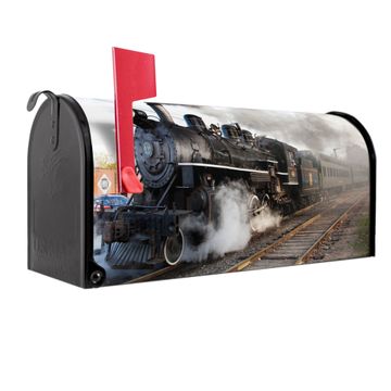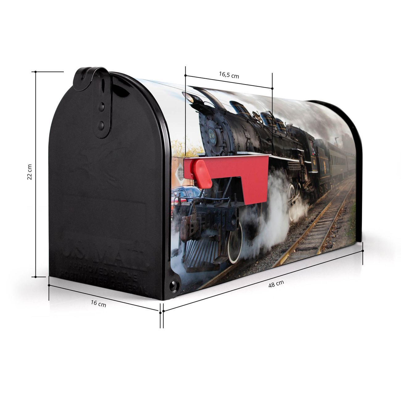 Der amerikanische Briefkasten von banjado mit Dampflok Motiv bietet Ihnen ausreichend Fassungsvermögen, um große A4 Sendungen und Zeitschriften zu empfangen. Die typisch amerikanische rote Fahne zeigt Ihnen an, wenn Sie Post erhalten haben. Die US-Mailbox besteht aus verzinktem Stahlblech welches lackiert wurde und ist 48 x 22 x 16 CM (BxHxT) groß. Die Folie mit Motiv Dampflok besteht aus einer wetter- und UV-resistenten Folie, die mit einem Schutzlaminat überzogen ist, sodass die US Mailbox zusätzlich vor Kratzern geschützt ist. An der Unterkante sind 4 Löcher je Seite um die Mailbox, typisch amerikanisch, an einem Holzpfahl oder einem Zaun zu befestigen. Auf Wunsch können Sie bei uns den passenden Standfuß oder die passende Wandhalterung kaufen um die US-Mailbox sicher zu befestigen. Wir bieten Ihnen ebenfalls Namensschilder, bereits beschriftet oder frei zu beschriften, und verschiedene selbst gestaltete Bitte-Keine-Werbung-Aufkleber.