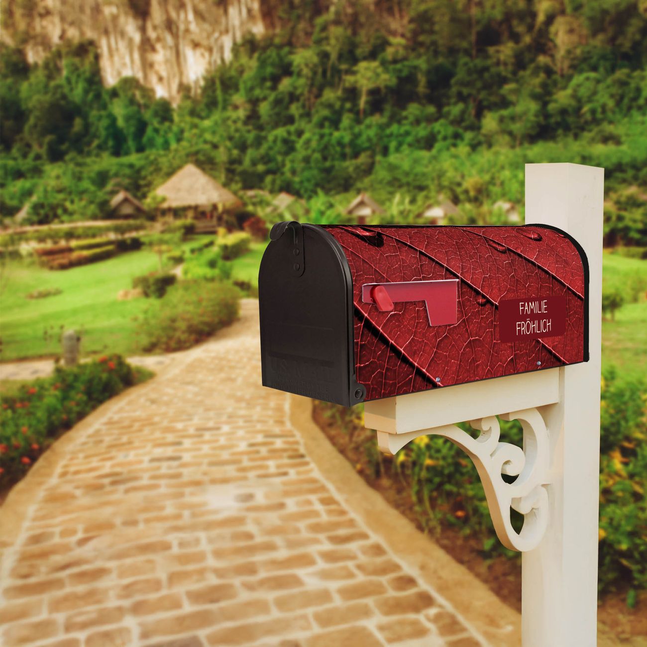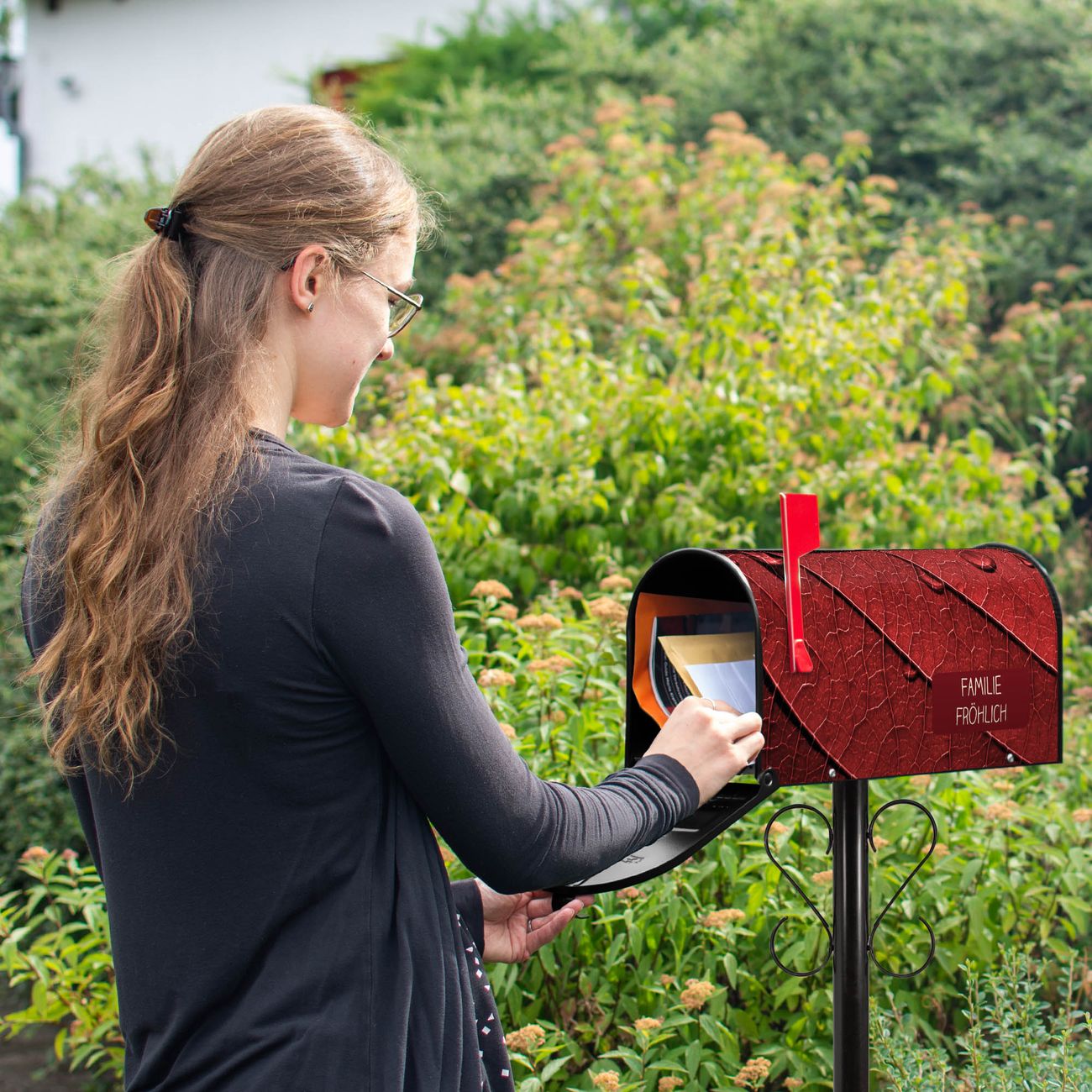 Der amerikanische Briefkasten von banjado mit Detail Blatt Motiv bietet Ihnen ausreichend Fassungsvermögen, um große A4 Sendungen und Zeitschriften zu empfangen. Die typisch amerikanische rote Fahne zeigt Ihnen an, wenn Sie Post erhalten haben. Die US-Mailbox besteht aus verzinktem Stahlblech welches lackiert wurde und ist 48 x 22 x 16 CM (BxHxT) groß. Die Folie mit Motiv Detail Blatt besteht aus einer wetter- und UV-resistenten Folie, die mit einem Schutzlaminat überzogen ist, sodass die US Mailbox zusätzlich vor Kratzern geschützt ist. An der Unterkante sind 4 Löcher je Seite um die Mailbox, typisch amerikanisch, an einem Holzpfahl oder einem Zaun zu befestigen. Auf Wunsch können Sie bei uns den passenden Standfuß oder die passende Wandhalterung kaufen um die US-Mailbox sicher zu befestigen. Wir bieten Ihnen ebenfalls Namensschilder, bereits beschriftet oder frei zu beschriften, und verschiedene selbst gestaltete Bitte-Keine-Werbung-Aufkleber.