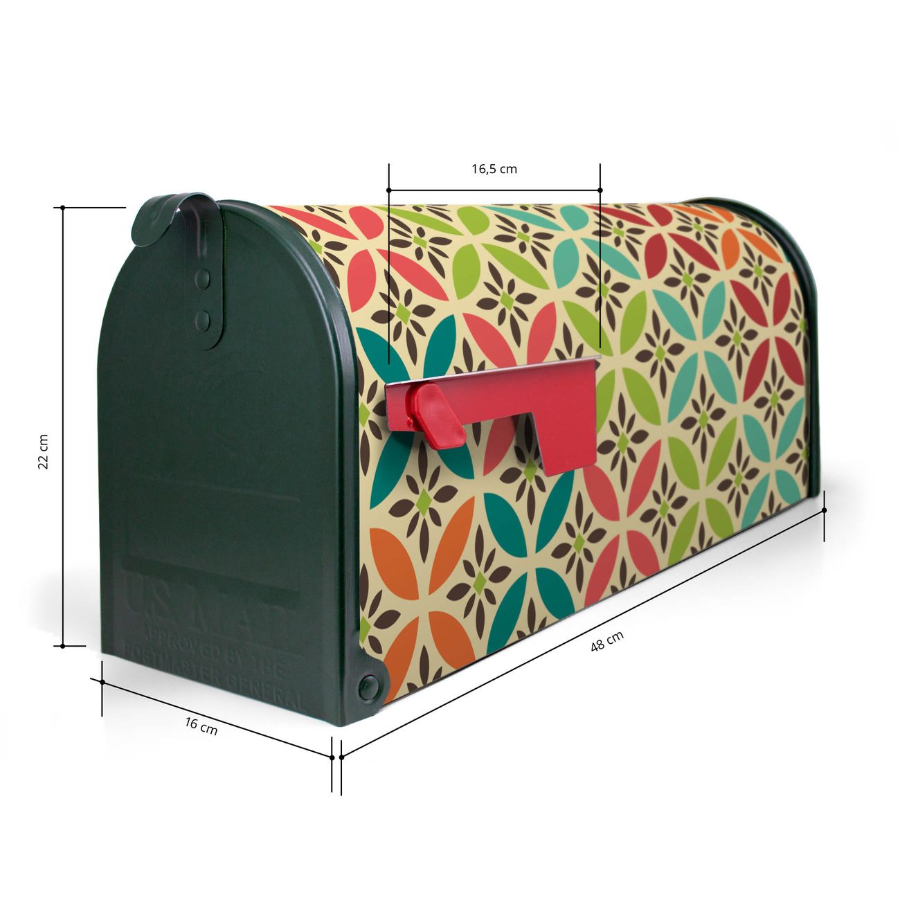 Der amerikanische Briefkasten von banjado mit Diamant Muster Motiv bietet Ihnen ausreichend Fassungsvermögen, um große A4 Sendungen und Zeitschriften zu empfangen. Die typisch amerikanische rote Fahne zeigt Ihnen an, wenn Sie Post erhalten haben. Die US-Mailbox besteht aus verzinktem Stahlblech welches lackiert wurde und ist 48 x 22 x 16 CM (BxHxT) groß. Die Folie mit Motiv Diamant Muster besteht aus einer wetter- und UV-resistenten Folie, die mit einem Schutzlaminat überzogen ist, sodass die US Mailbox zusätzlich vor Kratzern geschützt ist. An der Unterkante sind 4 Löcher je Seite um die Mailbox, typisch amerikanisch, an einem Holzpfahl oder einem Zaun zu befestigen. Auf Wunsch können Sie bei uns den passenden Standfuß oder die passende Wandhalterung kaufen um die US-Mailbox sicher zu befestigen. Wir bieten Ihnen ebenfalls Namensschilder, bereits beschriftet oder frei zu beschriften, und verschiedene selbst gestaltete Bitte-Keine-Werbung-Aufkleber.