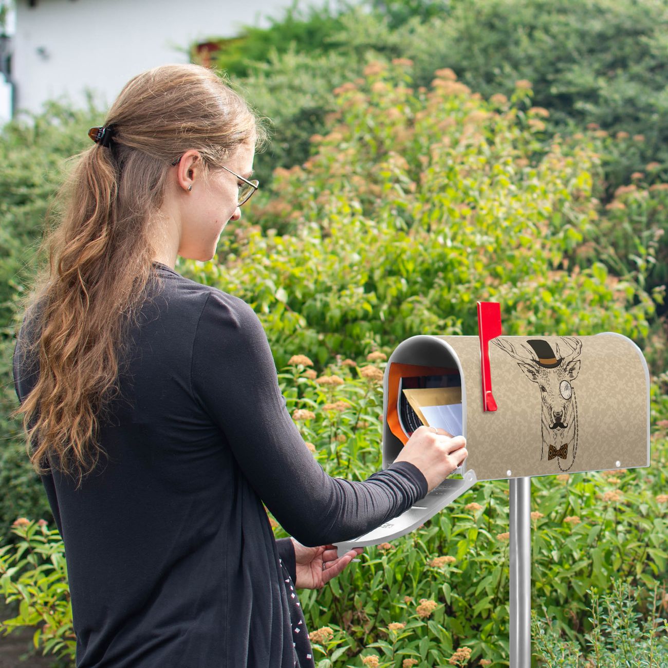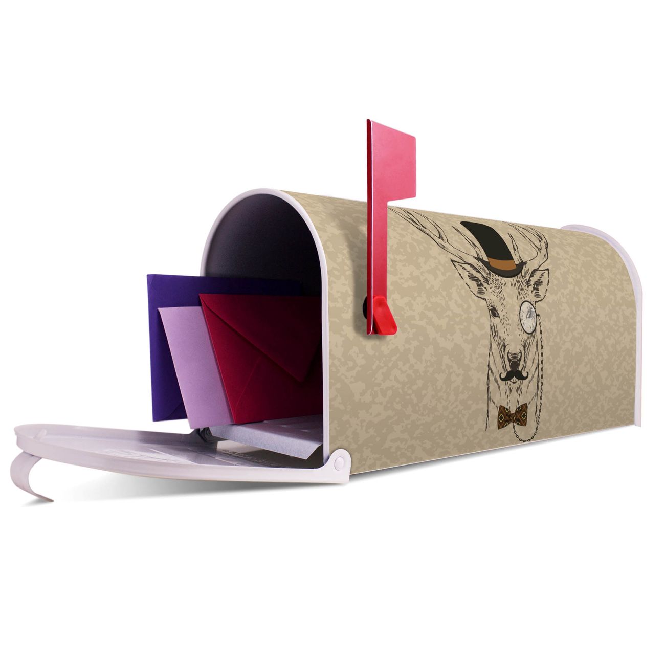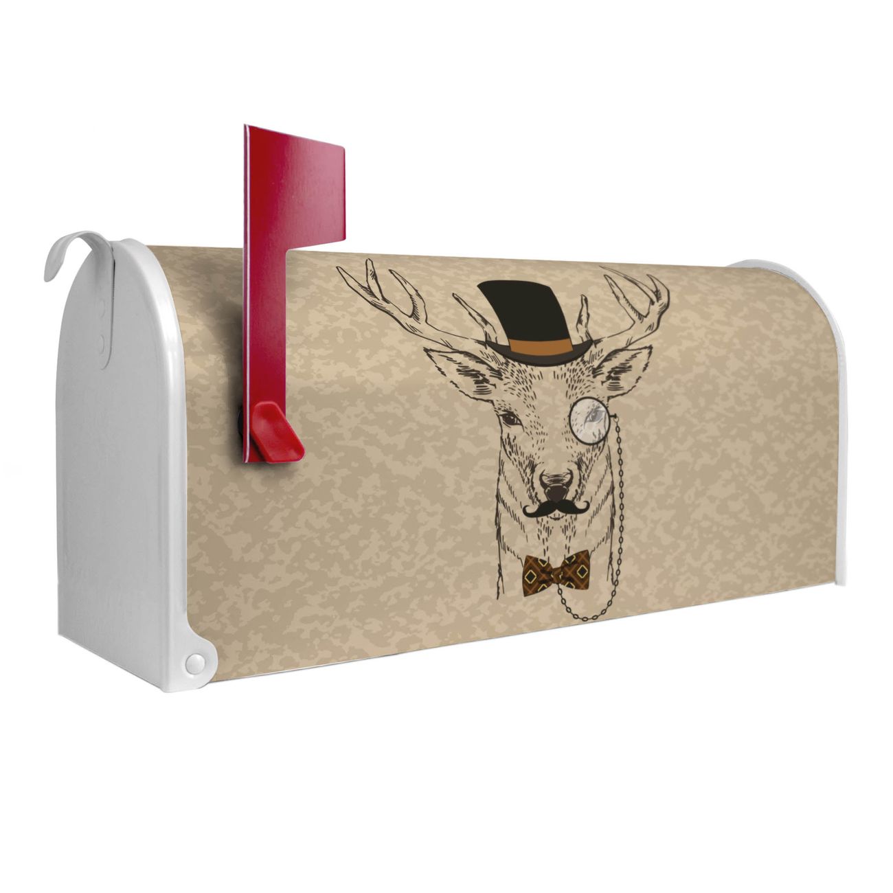 Unser amerikanischer Briefkasten mit dem Motiv Direktor Hirsch hat ein sehr ansprechendes und ausgefallenes Design, ist in der Grundfarbe weiß, grün oder schwarz erhältlich. Damit entlocken Sie Ihren Nachbarn und dem Postboten immer wieder ein Lächeln. Die Mailbox ist ein Original Import aus Mississippi USA und wird von unserer kleinen Manufaktur in Sachsen von Hand veredelt. Die US-Mailbox bietet ausreichend Platz auch für große Sendungen, eine Fahne die Ihnen Post anzeigt, wetterfestes und äußerst stabiles Material - so macht Post empfangen Freude.