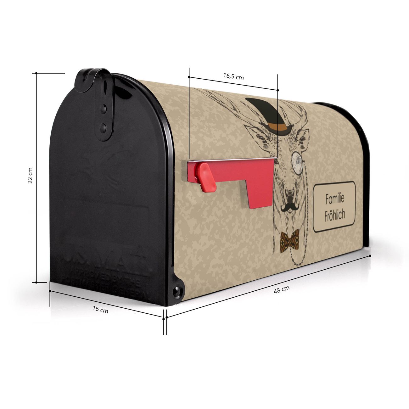 Der amerikanische Briefkasten von banjado mit Direktor Hirsch Motiv bietet Ihnen ausreichend Fassungsvermögen, um große A4 Sendungen und Zeitschriften zu empfangen. Die typisch amerikanische rote Fahne zeigt Ihnen an, wenn Sie Post erhalten haben. Die US-Mailbox besteht aus verzinktem Stahlblech welches lackiert wurde und ist 48 x 22 x 16 CM (BxHxT) groß. Die Folie mit Motiv Direktor Hirsch besteht aus einer wetter- und UV-resistenten Folie, die mit einem Schutzlaminat überzogen ist, sodass die US Mailbox zusätzlich vor Kratzern geschützt ist. An der Unterkante sind 4 Löcher je Seite um die Mailbox, typisch amerikanisch, an einem Holzpfahl oder einem Zaun zu befestigen. Auf Wunsch können Sie bei uns den passenden Standfuß oder die passende Wandhalterung kaufen um die US-Mailbox sicher zu befestigen. Wir bieten Ihnen ebenfalls Namensschilder, bereits beschriftet oder frei zu beschriften, und verschiedene selbst gestaltete Bitte-Keine-Werbung-Aufkleber.