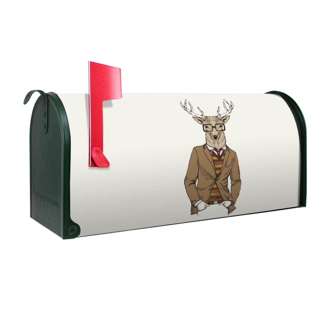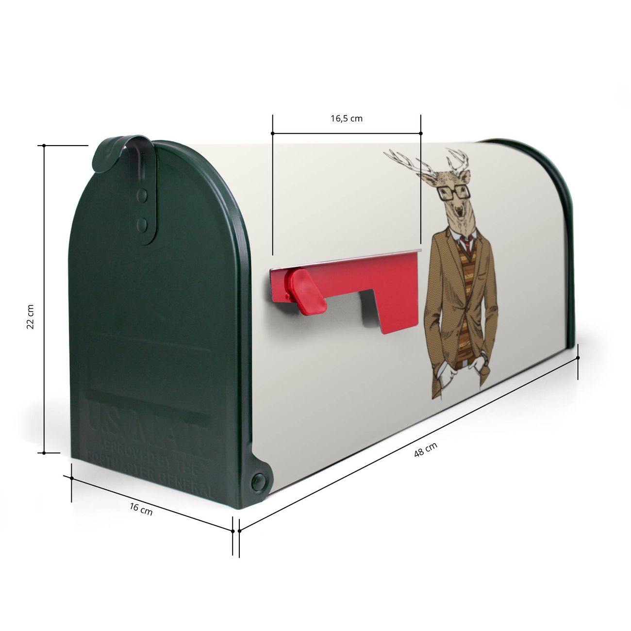 Der amerikanische Briefkasten von banjado mit Doktor Hirsch Motiv bietet Ihnen ausreichend Fassungsvermögen, um große A4 Sendungen und Zeitschriften zu empfangen. Die typisch amerikanische rote Fahne zeigt Ihnen an, wenn Sie Post erhalten haben. Die US-Mailbox besteht aus verzinktem Stahlblech welches lackiert wurde und ist 48 x 22 x 16 CM (BxHxT) groß. Die Folie mit Motiv Doktor Hirsch besteht aus einer wetter- und UV-resistenten Folie, die mit einem Schutzlaminat überzogen ist, sodass die US Mailbox zusätzlich vor Kratzern geschützt ist. An der Unterkante sind 4 Löcher je Seite um die Mailbox, typisch amerikanisch, an einem Holzpfahl oder einem Zaun zu befestigen. Auf Wunsch können Sie bei uns den passenden Standfuß oder die passende Wandhalterung kaufen um die US-Mailbox sicher zu befestigen. Wir bieten Ihnen ebenfalls Namensschilder, bereits beschriftet oder frei zu beschriften, und verschiedene selbst gestaltete Bitte-Keine-Werbung-Aufkleber.