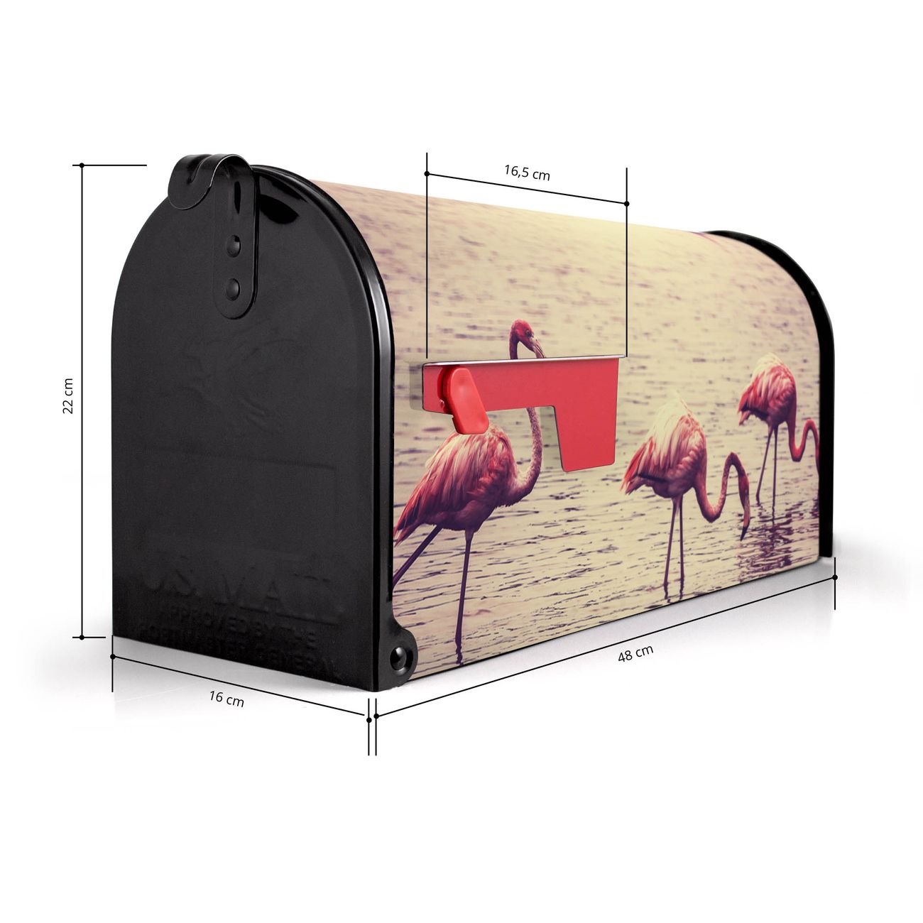 Der amerikanische Briefkasten von banjado mit Drei Flamnigos Motiv bietet Ihnen ausreichend Fassungsvermögen, um große A4 Sendungen und Zeitschriften zu empfangen. Die typisch amerikanische rote Fahne zeigt Ihnen an, wenn Sie Post erhalten haben. Die US-Mailbox besteht aus verzinktem Stahlblech welches lackiert wurde und ist 48 x 22 x 16 CM (BxHxT) groß. Die Folie mit Motiv Drei Flamnigos besteht aus einer wetter- und UV-resistenten Folie, die mit einem Schutzlaminat überzogen ist, sodass die US Mailbox zusätzlich vor Kratzern geschützt ist. An der Unterkante sind 4 Löcher je Seite um die Mailbox, typisch amerikanisch, an einem Holzpfahl oder einem Zaun zu befestigen. Auf Wunsch können Sie bei uns den passenden Standfuß oder die passende Wandhalterung kaufen um die US-Mailbox sicher zu befestigen. Wir bieten Ihnen ebenfalls Namensschilder, bereits beschriftet oder frei zu beschriften, und verschiedene selbst gestaltete Bitte-Keine-Werbung-Aufkleber.