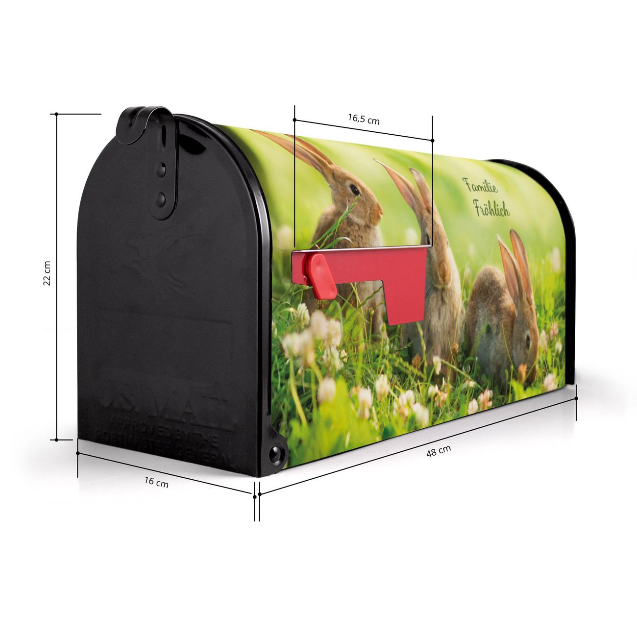 Der amerikanische Briefkasten von banjado mit Drei Hasen Motiv bietet Ihnen ausreichend Fassungsvermögen, um große A4 Sendungen und Zeitschriften zu empfangen. Die typisch amerikanische rote Fahne zeigt Ihnen an, wenn Sie Post erhalten haben. Die US-Mailbox besteht aus verzinktem Stahlblech welches lackiert wurde und ist 48 x 22 x 16 CM (BxHxT) groß. Die Folie mit Motiv Drei Hasen besteht aus einer wetter- und UV-resistenten Folie, die mit einem Schutzlaminat überzogen ist, sodass die US Mailbox zusätzlich vor Kratzern geschützt ist. An der Unterkante sind 4 Löcher je Seite um die Mailbox, typisch amerikanisch, an einem Holzpfahl oder einem Zaun zu befestigen. Auf Wunsch können Sie bei uns den passenden Standfuß oder die passende Wandhalterung kaufen um die US-Mailbox sicher zu befestigen. Wir bieten Ihnen ebenfalls Namensschilder, bereits beschriftet oder frei zu beschriften, und verschiedene selbst gestaltete Bitte-Keine-Werbung-Aufkleber.