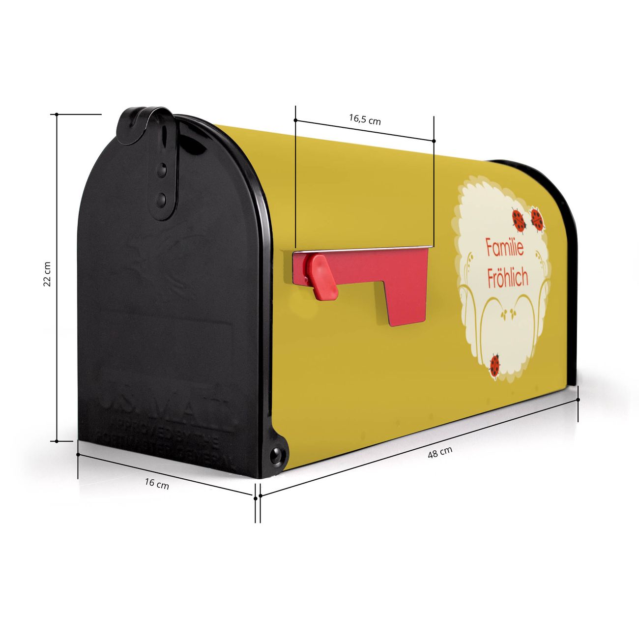 Der amerikanische Briefkasten von banjado mit Drei Marienkäfer Motiv bietet Ihnen ausreichend Fassungsvermögen, um große A4 Sendungen und Zeitschriften zu empfangen. Die typisch amerikanische rote Fahne zeigt Ihnen an, wenn Sie Post erhalten haben. Die US-Mailbox besteht aus verzinktem Stahlblech welches lackiert wurde und ist 48 x 22 x 16 CM (BxHxT) groß. Die Folie mit Motiv Drei Marienkäfer besteht aus einer wetter- und UV-resistenten Folie, die mit einem Schutzlaminat überzogen ist, sodass die US Mailbox zusätzlich vor Kratzern geschützt ist. An der Unterkante sind 4 Löcher je Seite um die Mailbox, typisch amerikanisch, an einem Holzpfahl oder einem Zaun zu befestigen. Auf Wunsch können Sie bei uns den passenden Standfuß oder die passende Wandhalterung kaufen um die US-Mailbox sicher zu befestigen. Wir bieten Ihnen ebenfalls Namensschilder, bereits beschriftet oder frei zu beschriften, und verschiedene selbst gestaltete Bitte-Keine-Werbung-Aufkleber.