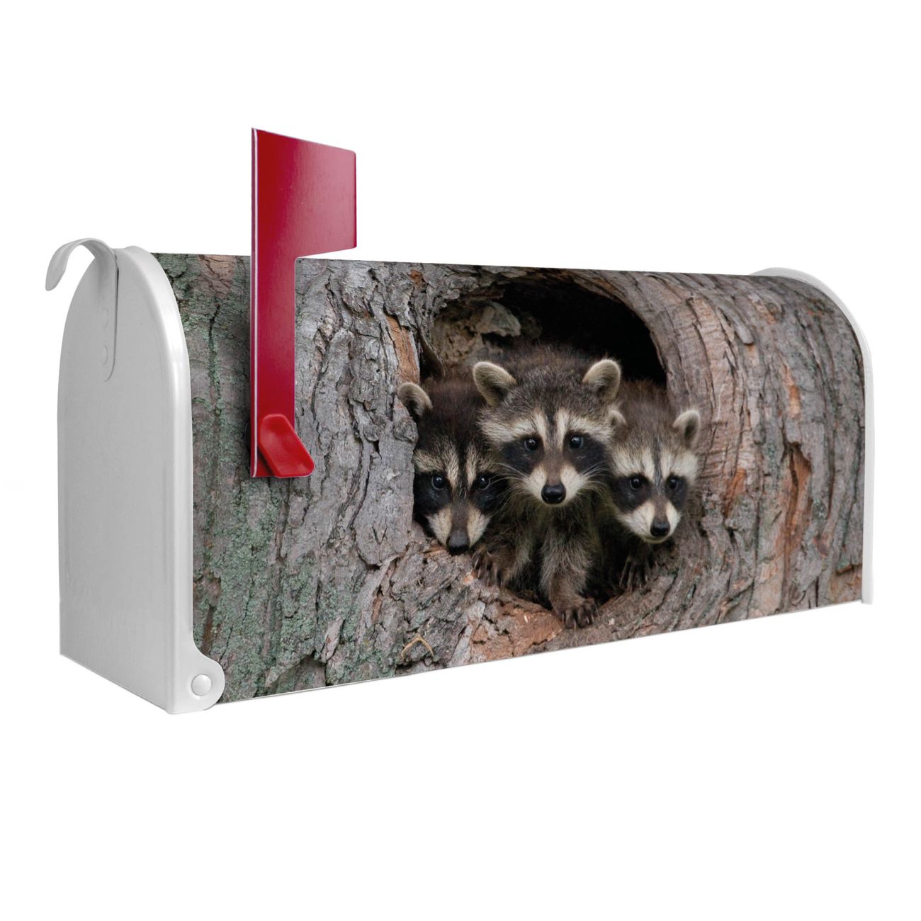 Unser amerikanischer Briefkasten mit dem Motiv Drei Waschbären hat ein sehr ansprechendes und ausgefallenes Design, ist in der Grundfarbe weiß, grün oder schwarz erhältlich. Damit entlocken Sie Ihren Nachbarn und dem Postboten immer wieder ein Lächeln. Die Mailbox ist ein Original Import aus Mississippi USA und wird von unserer kleinen Manufaktur in Sachsen von Hand veredelt. Die US-Mailbox bietet ausreichend Platz auch für große Sendungen, eine Fahne die Ihnen Post anzeigt, wetterfestes und äußerst stabiles Material - so macht Post empfangen Freude.