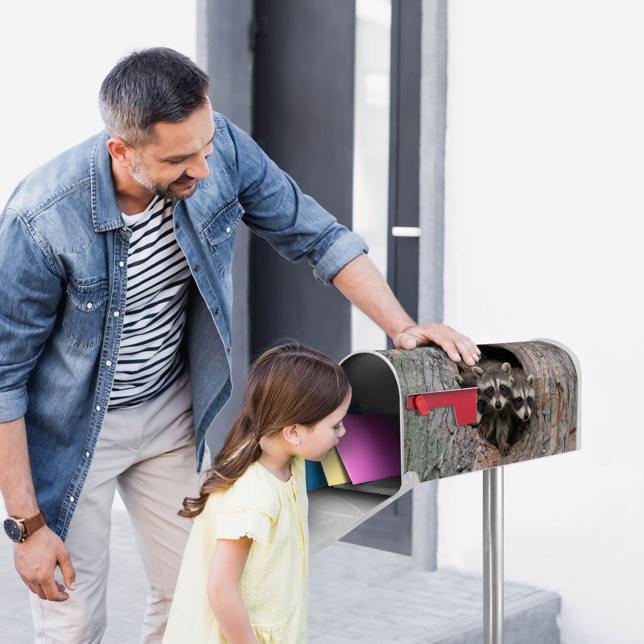 Der amerikanische Briefkasten von banjado mit Drei Waschbären Motiv bietet Ihnen ausreichend Fassungsvermögen, um große A4 Sendungen und Zeitschriften zu empfangen. Die typisch amerikanische rote Fahne zeigt Ihnen an, wenn Sie Post erhalten haben. Die US-Mailbox besteht aus verzinktem Stahlblech welches lackiert wurde und ist 48 x 22 x 16 CM (BxHxT) groß. Die Folie mit Motiv Drei Waschbären besteht aus einer wetter- und UV-resistenten Folie, die mit einem Schutzlaminat überzogen ist, sodass die US Mailbox zusätzlich vor Kratzern geschützt ist. An der Unterkante sind 4 Löcher je Seite um die Mailbox, typisch amerikanisch, an einem Holzpfahl oder einem Zaun zu befestigen. Auf Wunsch können Sie bei uns den passenden Standfuß oder die passende Wandhalterung kaufen um die US-Mailbox sicher zu befestigen. Wir bieten Ihnen ebenfalls Namensschilder, bereits beschriftet oder frei zu beschriften, und verschiedene selbst gestaltete Bitte-Keine-Werbung-Aufkleber.
