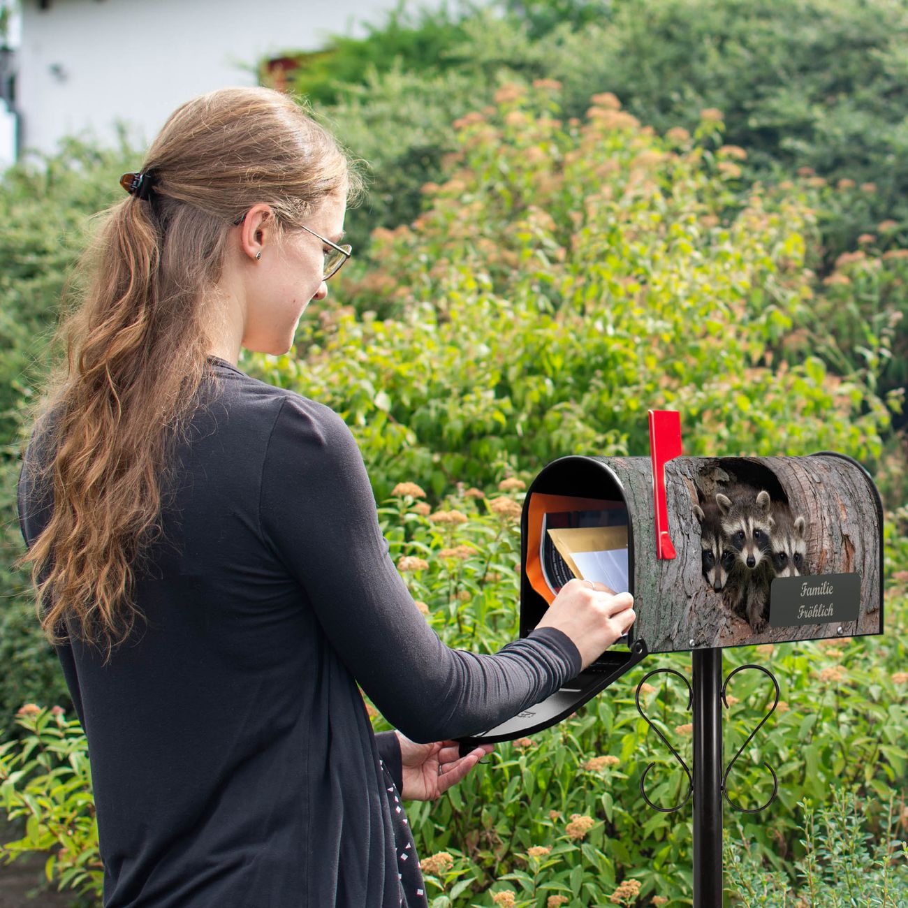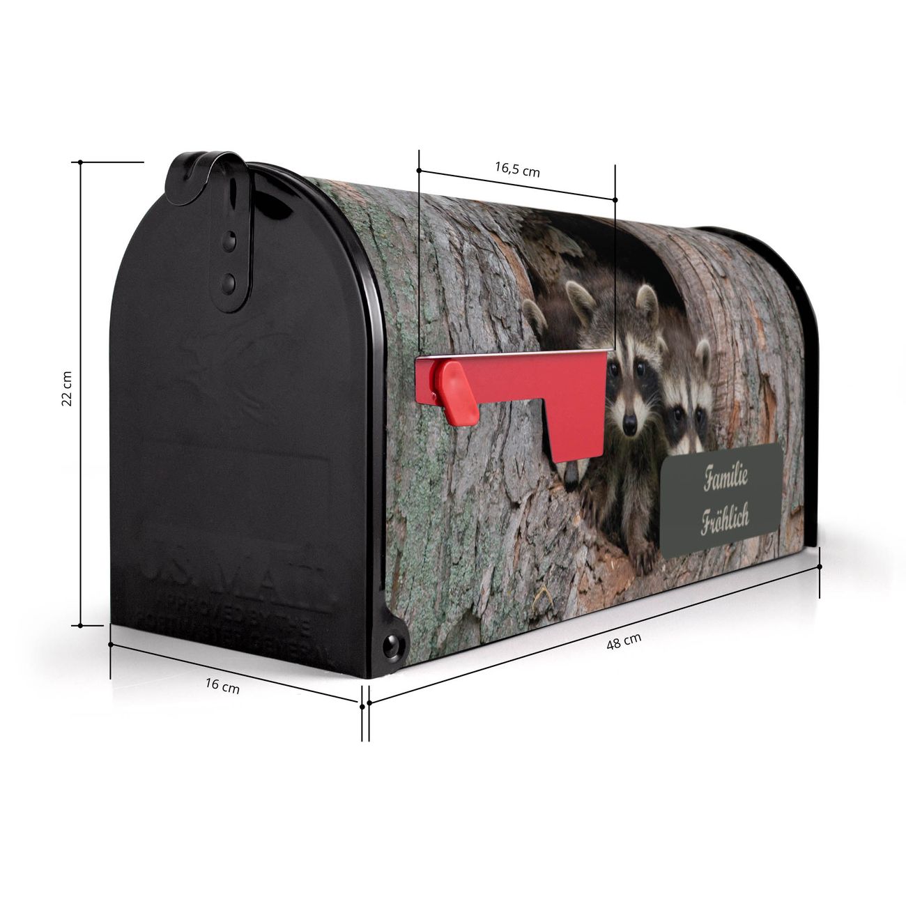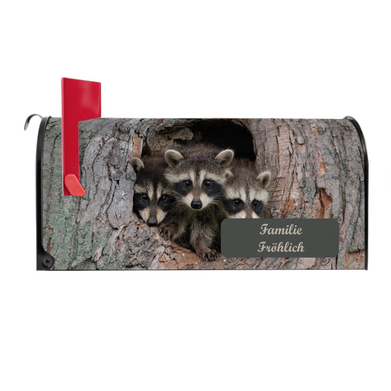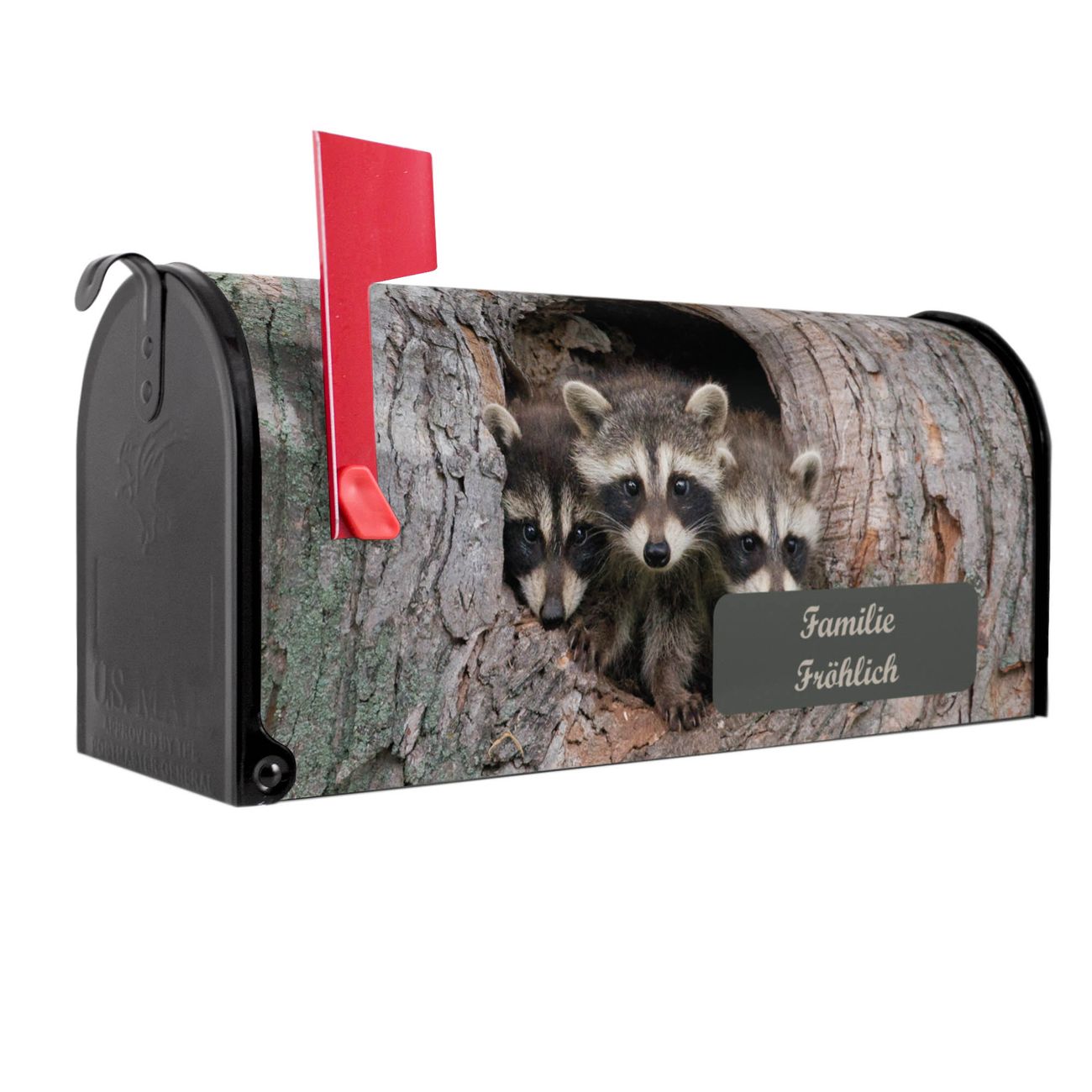 Der amerikanische Briefkasten von banjado mit Drei Waschbären Motiv bietet Ihnen ausreichend Fassungsvermögen, um große A4 Sendungen und Zeitschriften zu empfangen. Die typisch amerikanische rote Fahne zeigt Ihnen an, wenn Sie Post erhalten haben. Die US-Mailbox besteht aus verzinktem Stahlblech welches lackiert wurde und ist 48 x 22 x 16 CM (BxHxT) groß. Die Folie mit Motiv Drei Waschbären besteht aus einer wetter- und UV-resistenten Folie, die mit einem Schutzlaminat überzogen ist, sodass die US Mailbox zusätzlich vor Kratzern geschützt ist. An der Unterkante sind 4 Löcher je Seite um die Mailbox, typisch amerikanisch, an einem Holzpfahl oder einem Zaun zu befestigen. Auf Wunsch können Sie bei uns den passenden Standfuß oder die passende Wandhalterung kaufen um die US-Mailbox sicher zu befestigen. Wir bieten Ihnen ebenfalls Namensschilder, bereits beschriftet oder frei zu beschriften, und verschiedene selbst gestaltete Bitte-Keine-Werbung-Aufkleber.