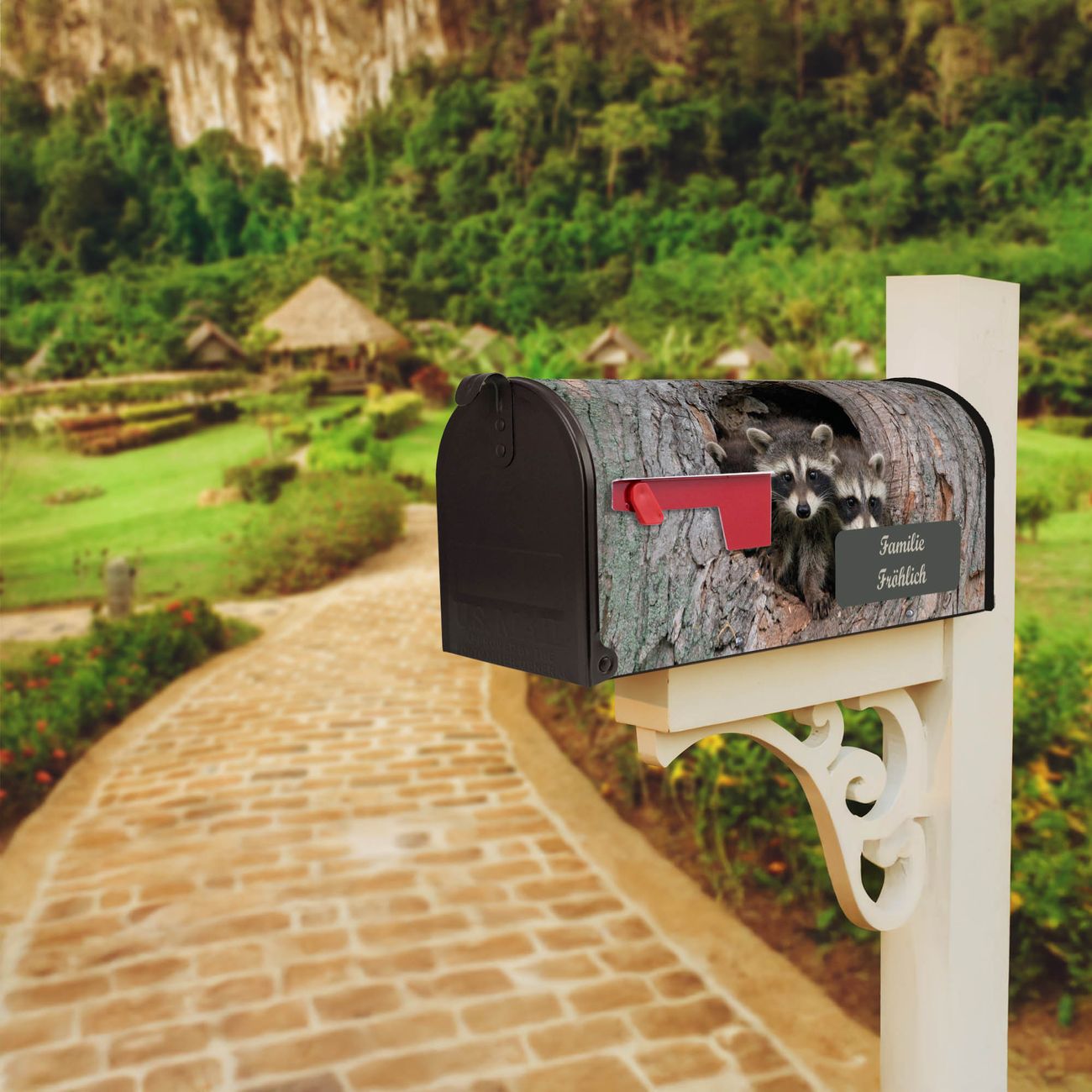 Unser amerikanischer Briefkasten mit dem Motiv Drei Waschbären hat ein sehr ansprechendes und ausgefallenes Design, ist in der Grundfarbe weiß, grün oder schwarz erhältlich. Damit entlocken Sie Ihren Nachbarn und dem Postboten immer wieder ein Lächeln. Die Mailbox ist ein Original Import aus Mississippi USA und wird von unserer kleinen Manufaktur in Sachsen von Hand veredelt. Die US-Mailbox bietet ausreichend Platz auch für große Sendungen, eine Fahne die Ihnen Post anzeigt, wetterfestes und äußerst stabiles Material - so macht Post empfangen Freude.