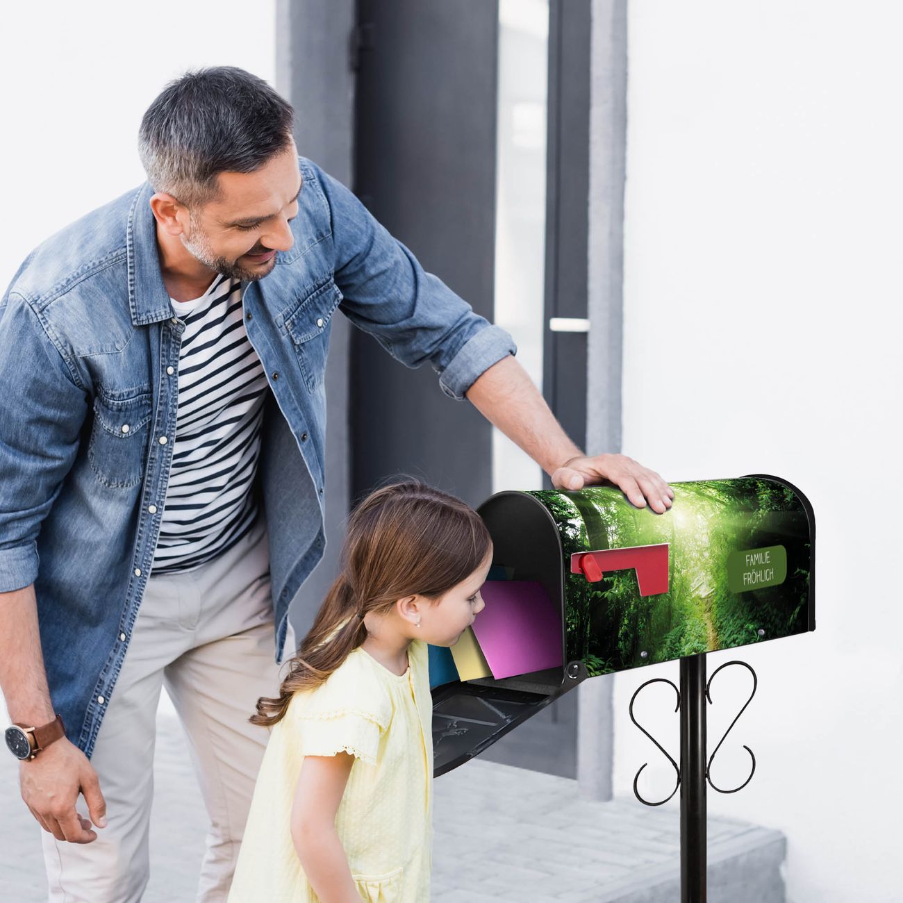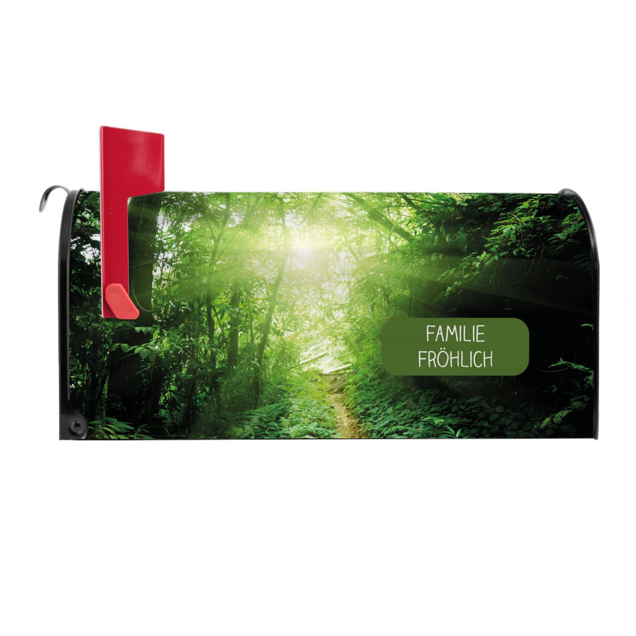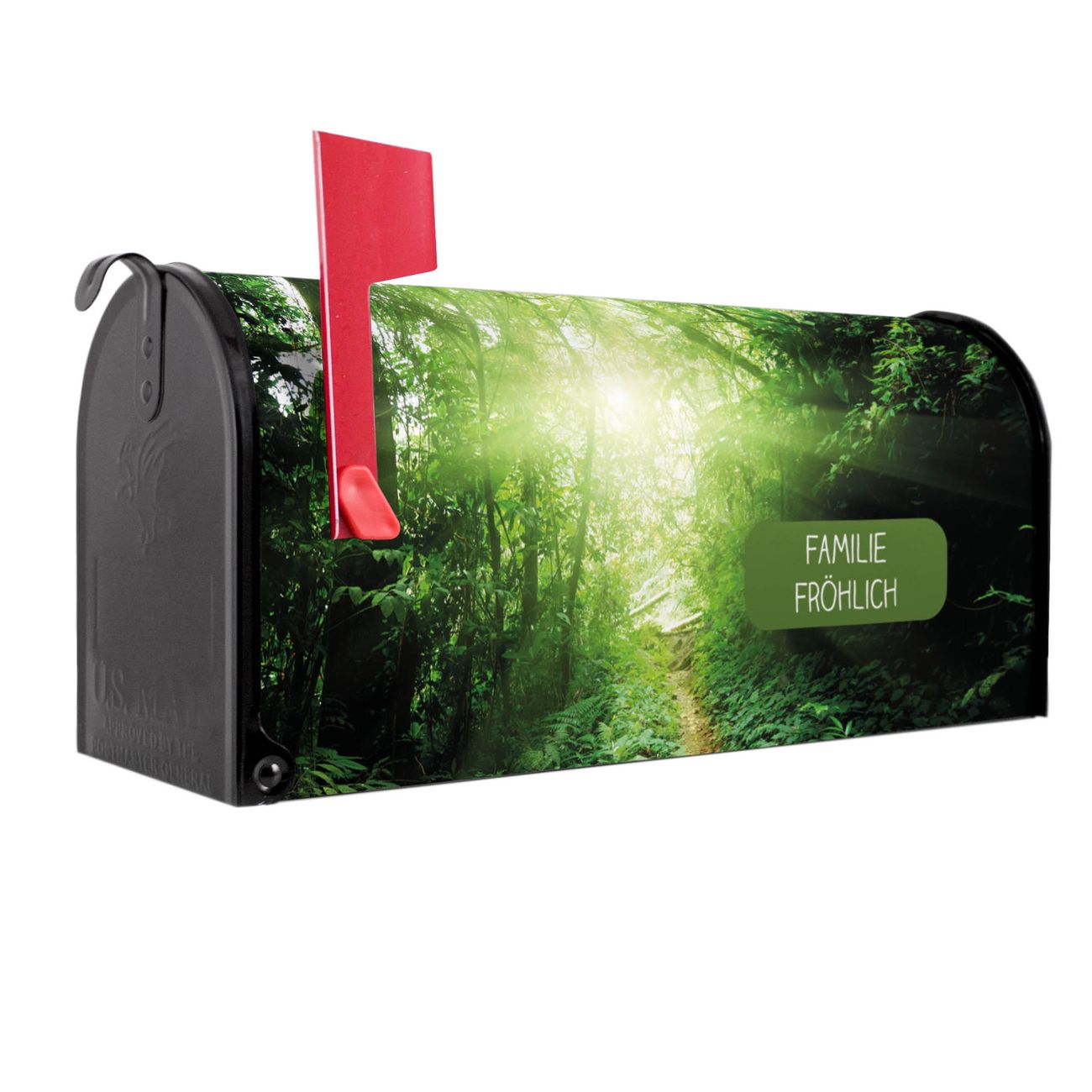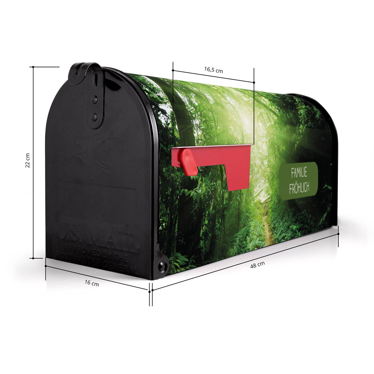 Der amerikanische Briefkasten von banjado mit Dschungel Malaysia Motiv bietet Ihnen ausreichend Fassungsvermögen, um große A4 Sendungen und Zeitschriften zu empfangen. Die typisch amerikanische rote Fahne zeigt Ihnen an, wenn Sie Post erhalten haben. Die US-Mailbox besteht aus verzinktem Stahlblech welches lackiert wurde und ist 48 x 22 x 16 CM (BxHxT) groß. Die Folie mit Motiv Dschungel Malaysia besteht aus einer wetter- und UV-resistenten Folie, die mit einem Schutzlaminat überzogen ist, sodass die US Mailbox zusätzlich vor Kratzern geschützt ist. An der Unterkante sind 4 Löcher je Seite um die Mailbox, typisch amerikanisch, an einem Holzpfahl oder einem Zaun zu befestigen. Auf Wunsch können Sie bei uns den passenden Standfuß oder die passende Wandhalterung kaufen um die US-Mailbox sicher zu befestigen. Wir bieten Ihnen ebenfalls Namensschilder, bereits beschriftet oder frei zu beschriften, und verschiedene selbst gestaltete Bitte-Keine-Werbung-Aufkleber.