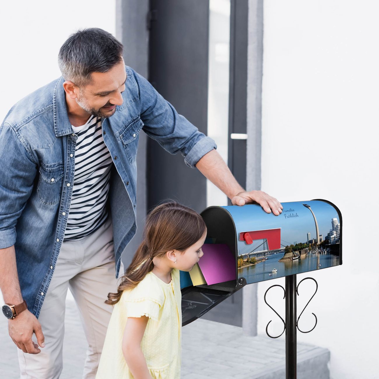 Unser amerikanischer Briefkasten mit dem Motiv Düsseldorf hat ein sehr ansprechendes und ausgefallenes Design, ist in der Grundfarbe weiß, grün oder schwarz erhältlich. Damit entlocken Sie Ihren Nachbarn und dem Postboten immer wieder ein Lächeln. Die Mailbox ist ein Original Import aus Mississippi USA und wird von unserer kleinen Manufaktur in Sachsen von Hand veredelt. Die US-Mailbox bietet ausreichend Platz auch für große Sendungen, eine Fahne die Ihnen Post anzeigt, wetterfestes und äußerst stabiles Material - so macht Post empfangen Freude.