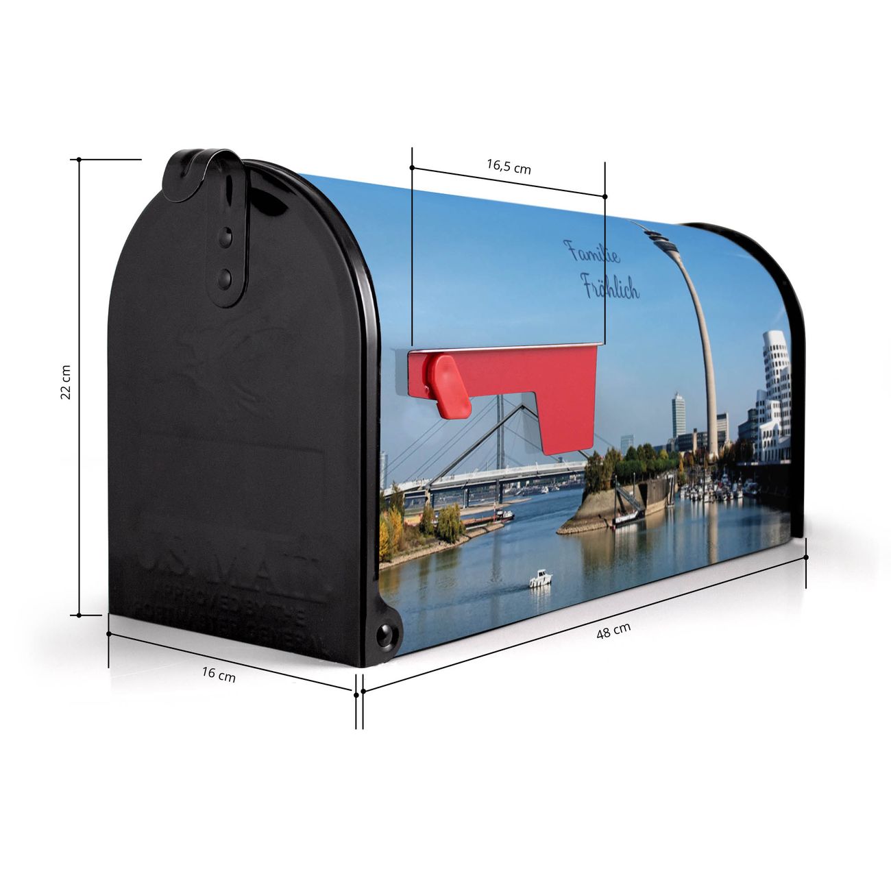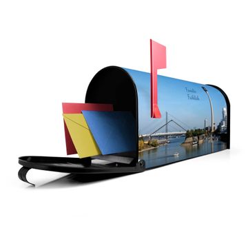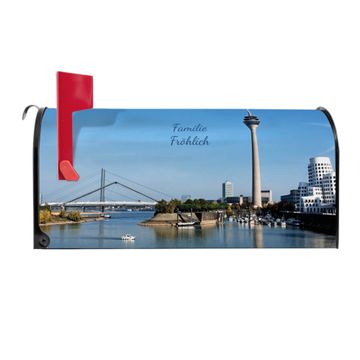 Der amerikanische Briefkasten von banjado mit Düsseldorf Motiv bietet Ihnen ausreichend Fassungsvermögen, um große A4 Sendungen und Zeitschriften zu empfangen. Die typisch amerikanische rote Fahne zeigt Ihnen an, wenn Sie Post erhalten haben. Die US-Mailbox besteht aus verzinktem Stahlblech welches lackiert wurde und ist 48 x 22 x 16 CM (BxHxT) groß. Die Folie mit Motiv Düsseldorf besteht aus einer wetter- und UV-resistenten Folie, die mit einem Schutzlaminat überzogen ist, sodass die US Mailbox zusätzlich vor Kratzern geschützt ist. An der Unterkante sind 4 Löcher je Seite um die Mailbox, typisch amerikanisch, an einem Holzpfahl oder einem Zaun zu befestigen. Auf Wunsch können Sie bei uns den passenden Standfuß oder die passende Wandhalterung kaufen um die US-Mailbox sicher zu befestigen. Wir bieten Ihnen ebenfalls Namensschilder, bereits beschriftet oder frei zu beschriften, und verschiedene selbst gestaltete Bitte-Keine-Werbung-Aufkleber.