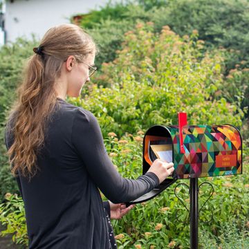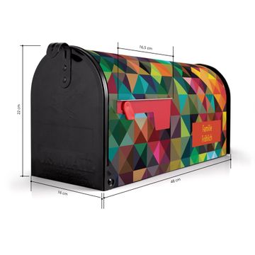 Der amerikanische Briefkasten von banjado mit Dunkles Kaleidoskop Motiv bietet Ihnen ausreichend Fassungsvermögen, um große A4 Sendungen und Zeitschriften zu empfangen. Die typisch amerikanische rote Fahne zeigt Ihnen an, wenn Sie Post erhalten haben. Die US-Mailbox besteht aus verzinktem Stahlblech welches lackiert wurde und ist 48 x 22 x 16 CM (BxHxT) groß. Die Folie mit Motiv Dunkles Kaleidoskop besteht aus einer wetter- und UV-resistenten Folie, die mit einem Schutzlaminat überzogen ist, sodass die US Mailbox zusätzlich vor Kratzern geschützt ist. An der Unterkante sind 4 Löcher je Seite um die Mailbox, typisch amerikanisch, an einem Holzpfahl oder einem Zaun zu befestigen. Auf Wunsch können Sie bei uns den passenden Standfuß oder die passende Wandhalterung kaufen um die US-Mailbox sicher zu befestigen. Wir bieten Ihnen ebenfalls Namensschilder, bereits beschriftet oder frei zu beschriften, und verschiedene selbst gestaltete Bitte-Keine-Werbung-Aufkleber.