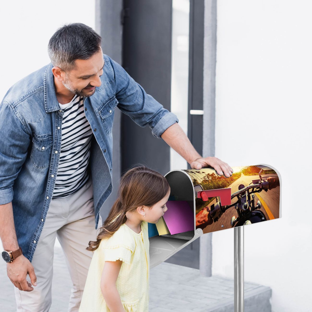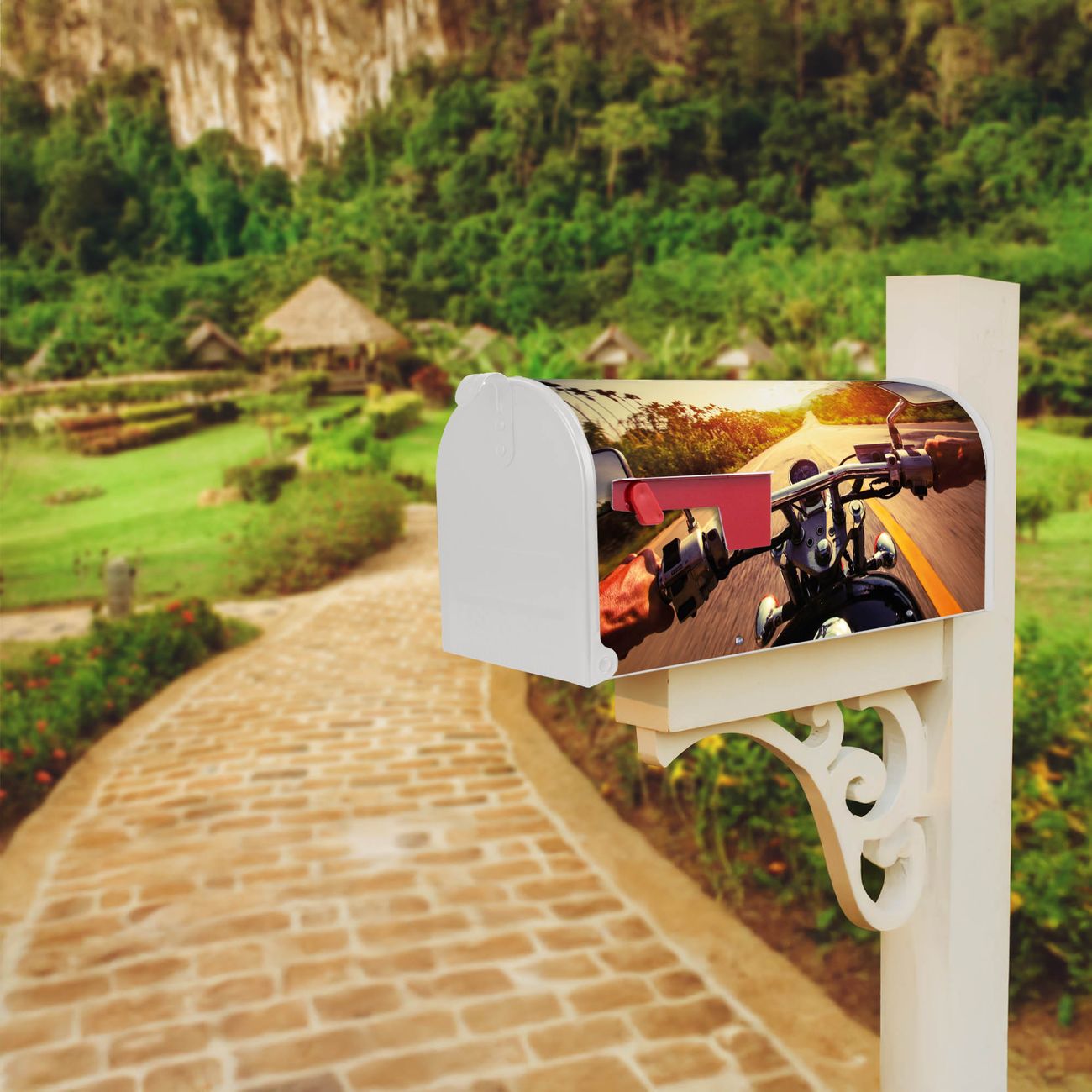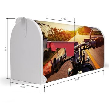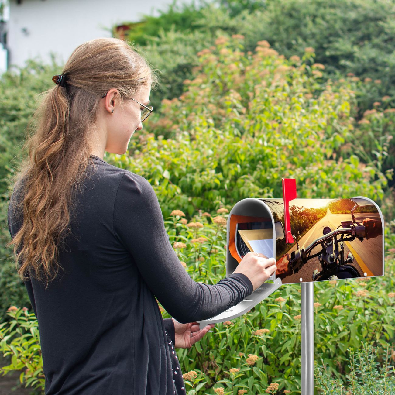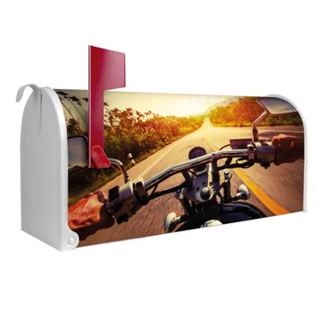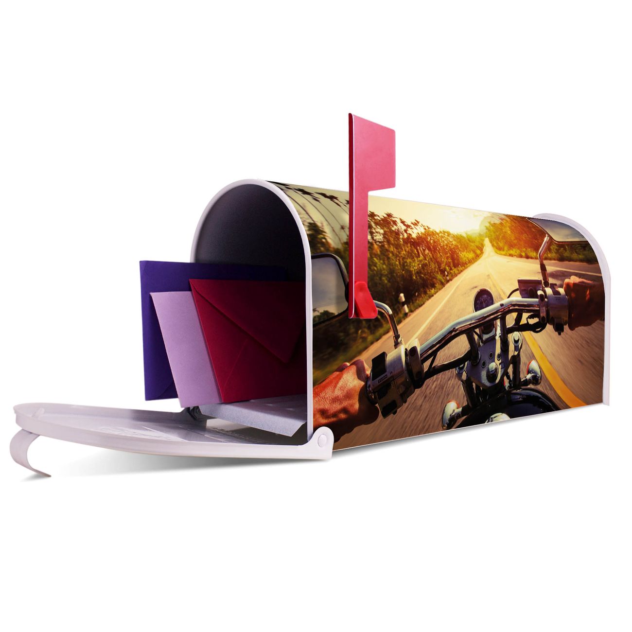 Der amerikanische Briefkasten von banjado mit Easy Rider Motiv bietet Ihnen ausreichend Fassungsvermögen, um große A4 Sendungen und Zeitschriften zu empfangen. Die typisch amerikanische rote Fahne zeigt Ihnen an, wenn Sie Post erhalten haben. Die US-Mailbox besteht aus verzinktem Stahlblech welches lackiert wurde und ist 48 x 22 x 16 CM (BxHxT) groß. Die Folie mit Motiv Easy Rider besteht aus einer wetter- und UV-resistenten Folie, die mit einem Schutzlaminat überzogen ist, sodass die US Mailbox zusätzlich vor Kratzern geschützt ist. An der Unterkante sind 4 Löcher je Seite um die Mailbox, typisch amerikanisch, an einem Holzpfahl oder einem Zaun zu befestigen. Auf Wunsch können Sie bei uns den passenden Standfuß oder die passende Wandhalterung kaufen um die US-Mailbox sicher zu befestigen. Wir bieten Ihnen ebenfalls Namensschilder, bereits beschriftet oder frei zu beschriften, und verschiedene selbst gestaltete Bitte-Keine-Werbung-Aufkleber.