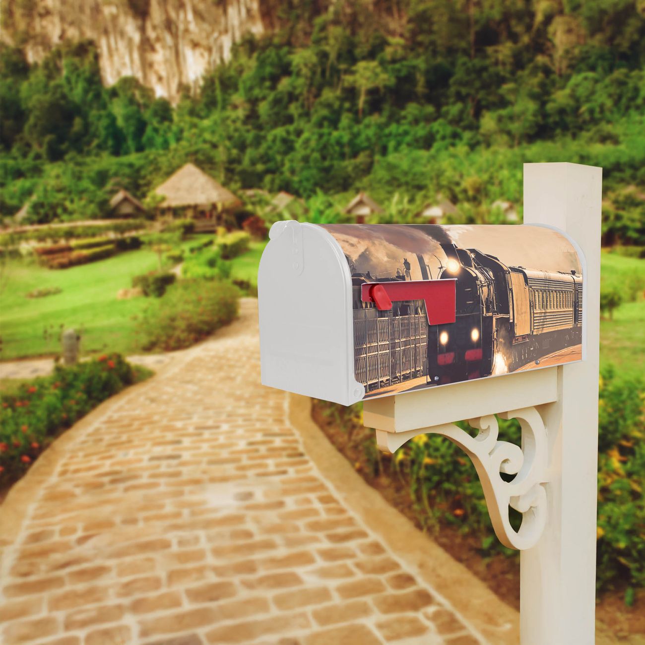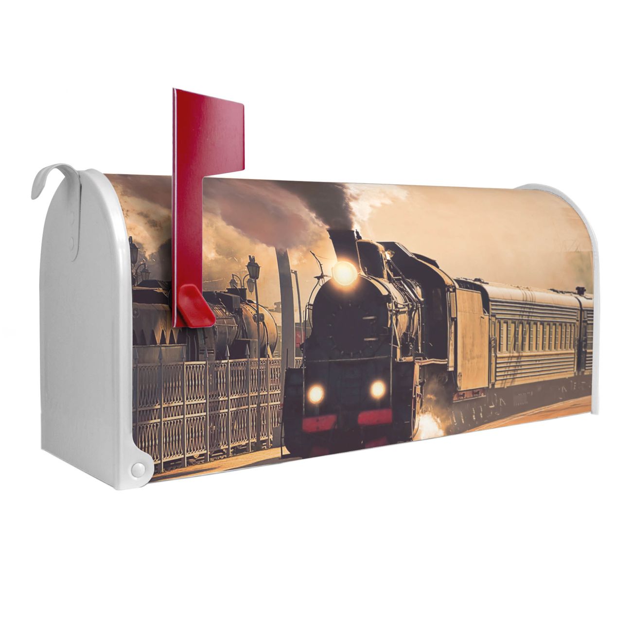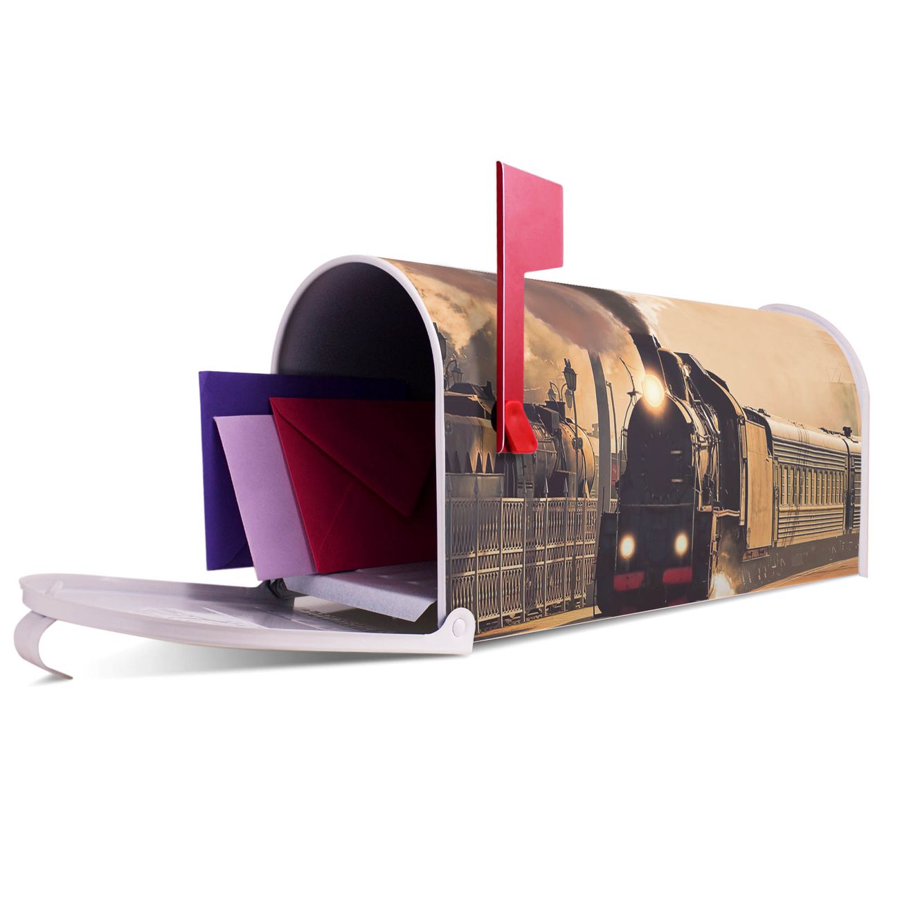 Unser amerikanischer Briefkasten mit dem Motiv Einfahrender Zug hat ein sehr ansprechendes und ausgefallenes Design, ist in der Grundfarbe weiß, grün oder schwarz erhältlich. Damit entlocken Sie Ihren Nachbarn und dem Postboten immer wieder ein Lächeln. Die Mailbox ist ein Original Import aus Mississippi USA und wird von unserer kleinen Manufaktur in Sachsen von Hand veredelt. Die US-Mailbox bietet ausreichend Platz auch für große Sendungen, eine Fahne die Ihnen Post anzeigt, wetterfestes und äußerst stabiles Material - so macht Post empfangen Freude.