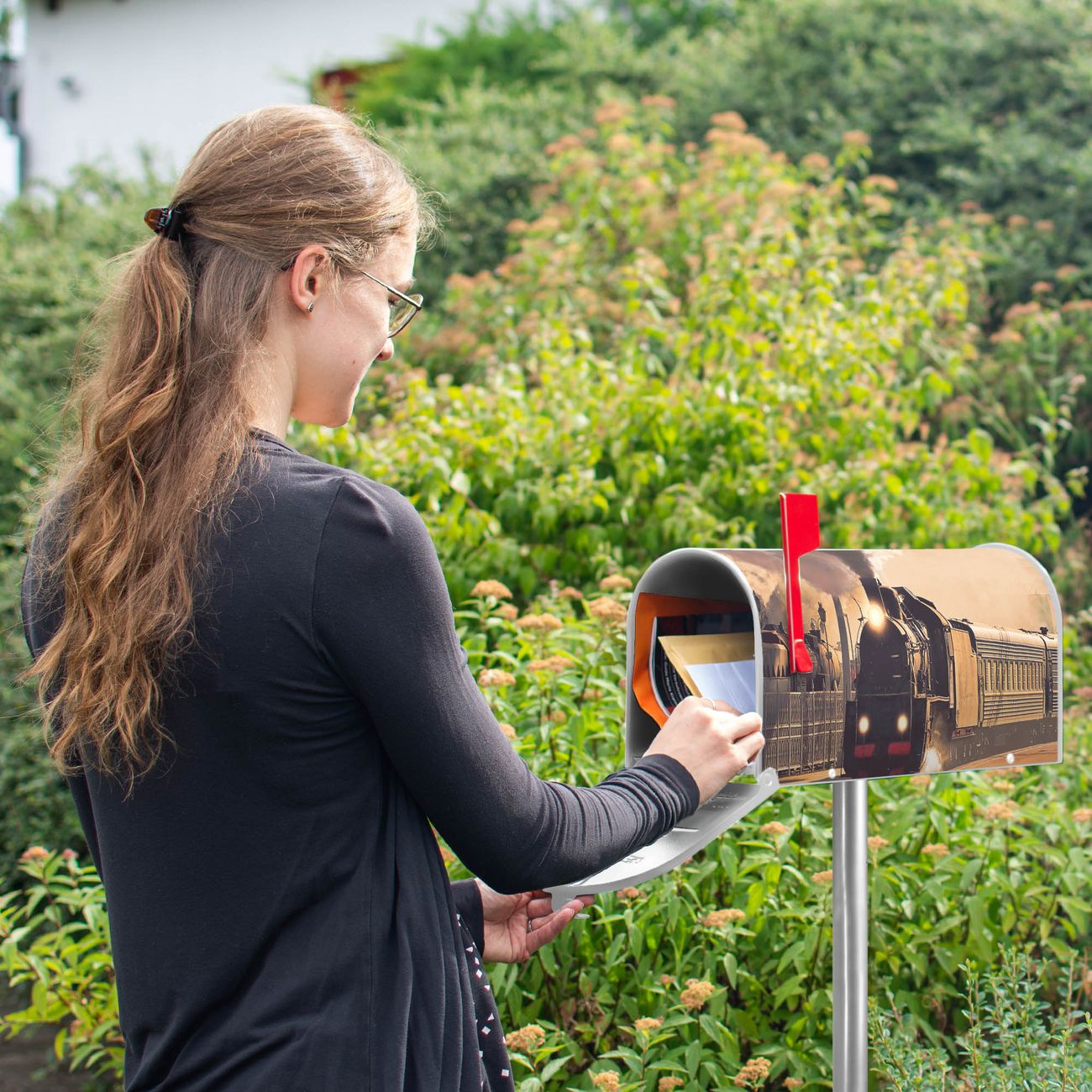 Der amerikanische Briefkasten von banjado mit Einfahrender Zug Motiv bietet Ihnen ausreichend Fassungsvermögen, um große A4 Sendungen und Zeitschriften zu empfangen. Die typisch amerikanische rote Fahne zeigt Ihnen an, wenn Sie Post erhalten haben. Die US-Mailbox besteht aus verzinktem Stahlblech welches lackiert wurde und ist 48 x 22 x 16 CM (BxHxT) groß. Die Folie mit Motiv Einfahrender Zug besteht aus einer wetter- und UV-resistenten Folie, die mit einem Schutzlaminat überzogen ist, sodass die US Mailbox zusätzlich vor Kratzern geschützt ist. An der Unterkante sind 4 Löcher je Seite um die Mailbox, typisch amerikanisch, an einem Holzpfahl oder einem Zaun zu befestigen. Auf Wunsch können Sie bei uns den passenden Standfuß oder die passende Wandhalterung kaufen um die US-Mailbox sicher zu befestigen. Wir bieten Ihnen ebenfalls Namensschilder, bereits beschriftet oder frei zu beschriften, und verschiedene selbst gestaltete Bitte-Keine-Werbung-Aufkleber.