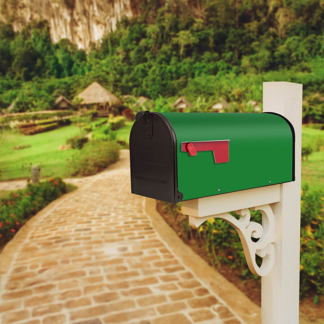 Der amerikanische Briefkasten von banjado mit Grün Farbe bietet Ihnen ausreichend Fassungsvermögen, um große A4 Sendungen und Zeitschriften zu empfangen. Die typisch amerikanische rote Fahne zeigt Ihnen an, wenn Sie Post erhalten haben. Die US-Mailbox besteht aus verzinktem Stahlblech welches lackiert wurde und ist 48 x 22 x 16 CM (BxHxT) groß. Die Folie mit Farbe Grün besteht aus einer wetter- und UV-resistenten Folie, die mit einem Schutzlaminat überzogen ist, sodass die US Mailbox zusätzlich vor Kratzern geschützt ist. An der Unterkante sind 4 Löcher je Seite um die Mailbox, typisch amerikanisch, an einem Holzpfahl oder einem Zaun zu befestigen. Auf Wunsch können Sie bei uns den passenden Standfuß oder die passende Wandhalterung kaufen um die US-Mailbox sicher zu befestigen. Wir bieten Ihnen ebenfalls Namensschilder, bereits beschriftet oder frei zu beschriften, und verschiedene selbst gestaltete Bitte-Keine-Werbung-Aufkleber.