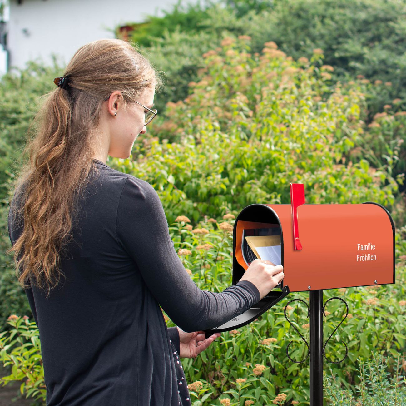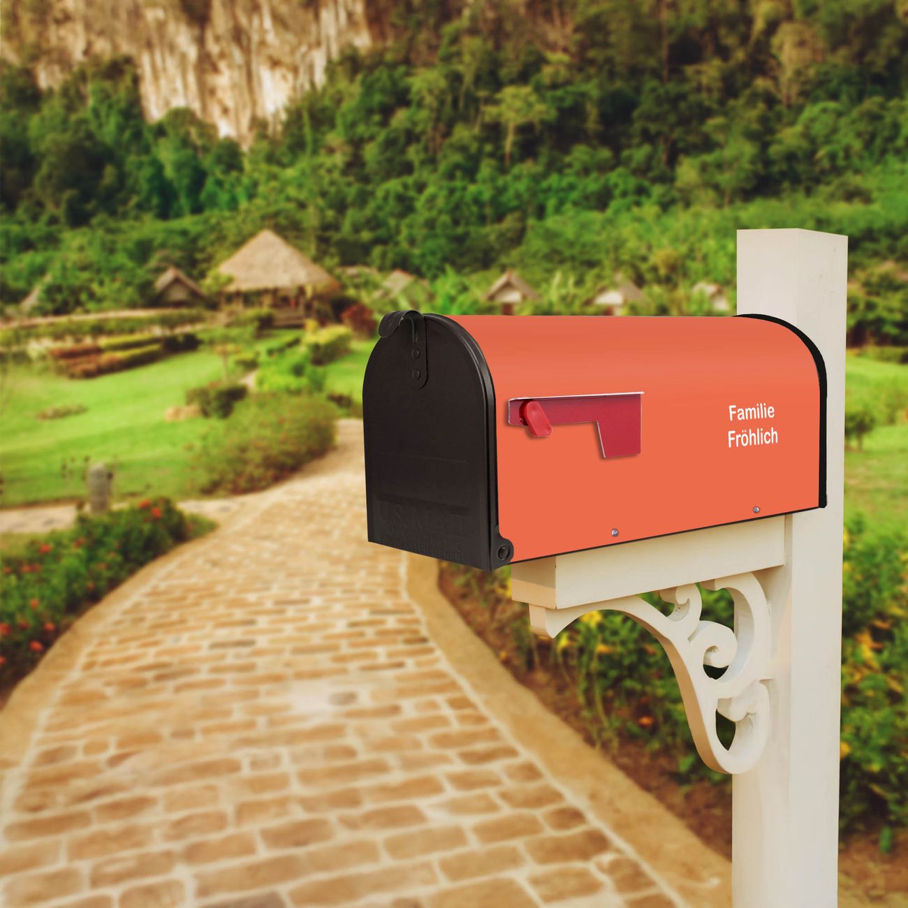 Der amerikanische Briefkasten von banjado mit Orange Farbe bietet Ihnen ausreichend Fassungsvermögen, um große A4 Sendungen und Zeitschriften zu empfangen. Die typisch amerikanische rote Fahne zeigt Ihnen an, wenn Sie Post erhalten haben. Die US-Mailbox besteht aus verzinktem Stahlblech welches lackiert wurde und ist 48 x 22 x 16 CM (BxHxT) groß. Die Folie mit Farbe Orange besteht aus einer wetter- und UV-resistenten Folie, die mit einem Schutzlaminat überzogen ist, sodass die US Mailbox zusätzlich vor Kratzern geschützt ist. An der Unterkante sind 4 Löcher je Seite um die Mailbox, typisch amerikanisch, an einem Holzpfahl oder einem Zaun zu befestigen. Auf Wunsch können Sie bei uns den passenden Standfuß oder die passende Wandhalterung kaufen um die US-Mailbox sicher zu befestigen. Wir bieten Ihnen ebenfalls Namensschilder, bereits beschriftet oder frei zu beschriften, und verschiedene selbst gestaltete Bitte-Keine-Werbung-Aufkleber.