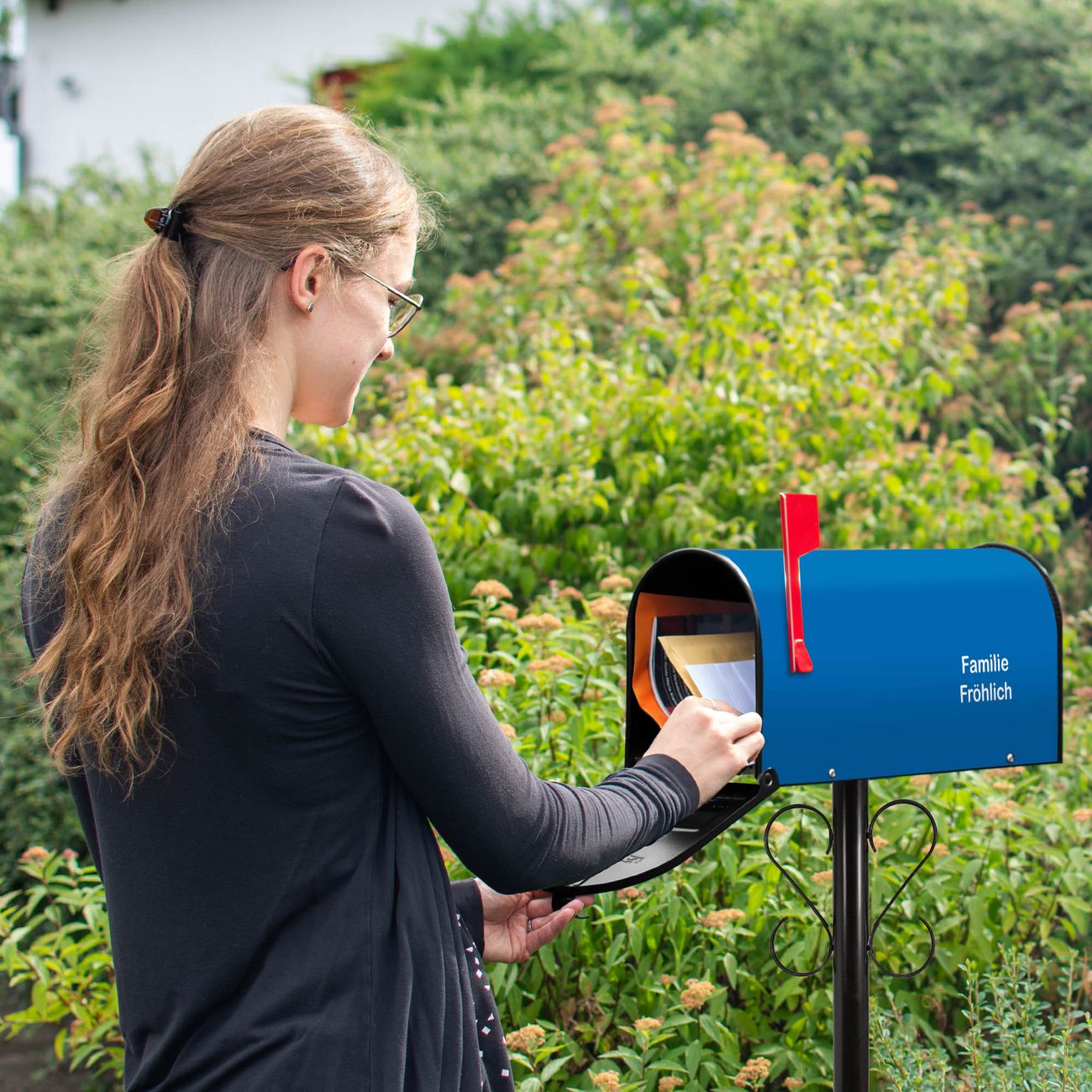 Der amerikanische Briefkasten von banjado mit Signalblau Farbe bietet Ihnen ausreichend Fassungsvermögen, um große A4 Sendungen und Zeitschriften zu empfangen. Die typisch amerikanische rote Fahne zeigt Ihnen an, wenn Sie Post erhalten haben. Die US-Mailbox besteht aus verzinktem Stahlblech welches lackiert wurde und ist 48 x 22 x 16 CM (BxHxT) groß. Die Folie mit Farbe Signalblau besteht aus einer wetter- und UV-resistenten Folie, die mit einem Schutzlaminat überzogen ist, sodass die US Mailbox zusätzlich vor Kratzern geschützt ist. An der Unterkante sind 4 Löcher je Seite um die Mailbox, typisch amerikanisch, an einem Holzpfahl oder einem Zaun zu befestigen. Auf Wunsch können Sie bei uns den passenden Standfuß oder die passende Wandhalterung kaufen um die US-Mailbox sicher zu befestigen. Wir bieten Ihnen ebenfalls Namensschilder, bereits beschriftet oder frei zu beschriften, und verschiedene selbst gestaltete Bitte-Keine-Werbung-Aufkleber.