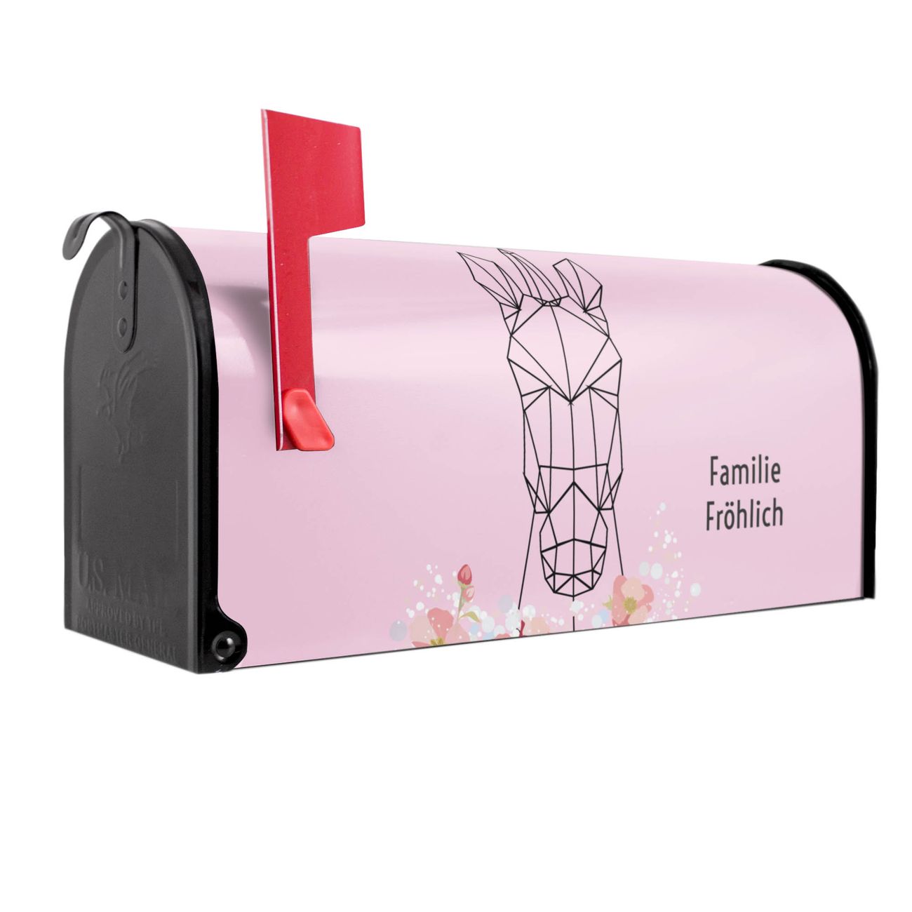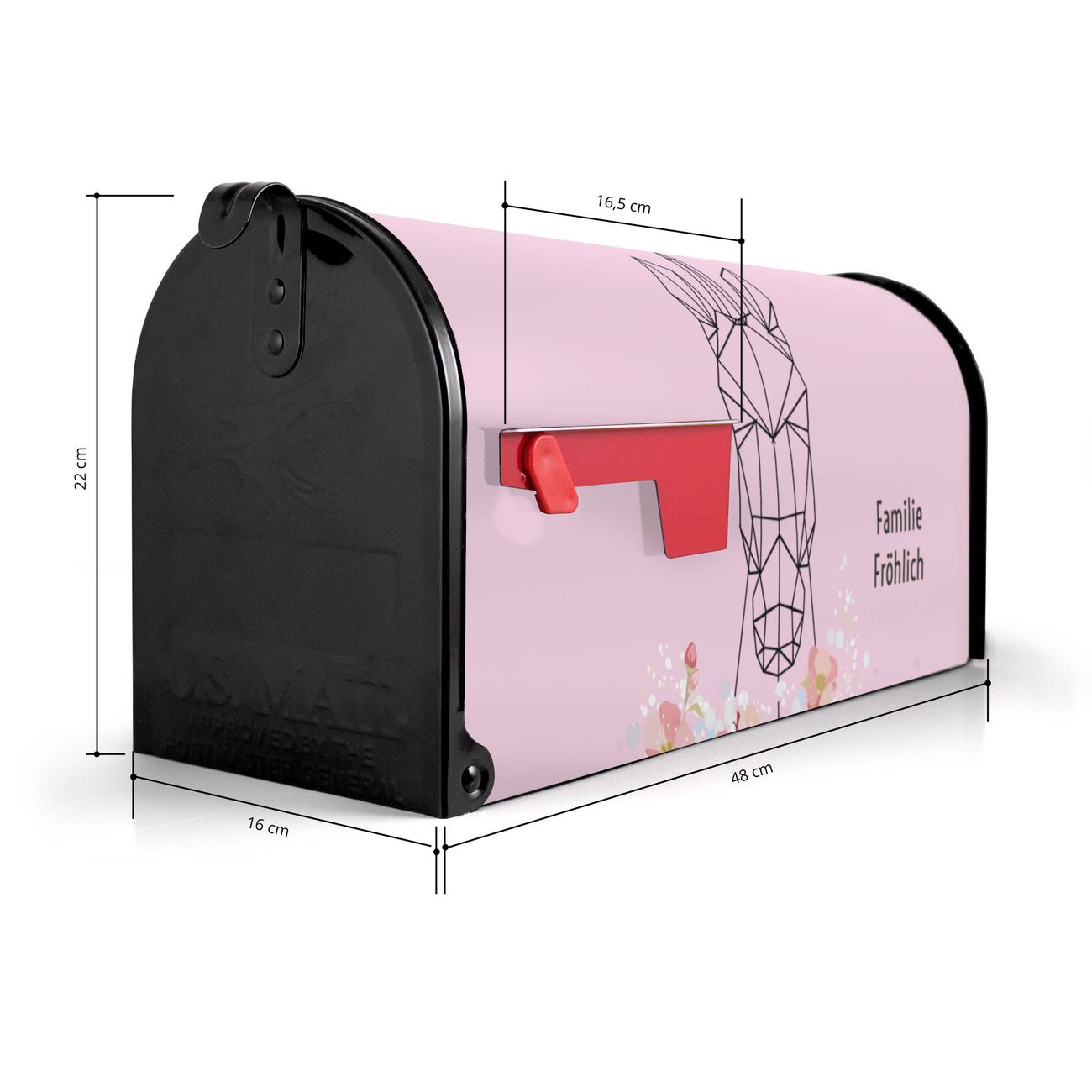 Der amerikanische Briefkasten von banjado mit Einhorn Poygon Motiv bietet Ihnen ausreichend Fassungsvermögen, um große A4 Sendungen und Zeitschriften zu empfangen. Die typisch amerikanische rote Fahne zeigt Ihnen an, wenn Sie Post erhalten haben. Die US-Mailbox besteht aus verzinktem Stahlblech welches lackiert wurde und ist 48 x 22 x 16 CM (BxHxT) groß. Die Folie mit Motiv Einhorn Poygon besteht aus einer wetter- und UV-resistenten Folie, die mit einem Schutzlaminat überzogen ist, sodass die US Mailbox zusätzlich vor Kratzern geschützt ist. An der Unterkante sind 4 Löcher je Seite um die Mailbox, typisch amerikanisch, an einem Holzpfahl oder einem Zaun zu befestigen. Auf Wunsch können Sie bei uns den passenden Standfuß oder die passende Wandhalterung kaufen um die US-Mailbox sicher zu befestigen. Wir bieten Ihnen ebenfalls Namensschilder, bereits beschriftet oder frei zu beschriften, und verschiedene selbst gestaltete Bitte-Keine-Werbung-Aufkleber.