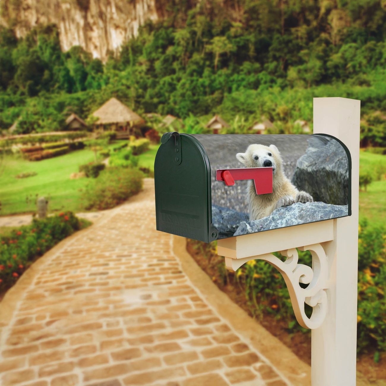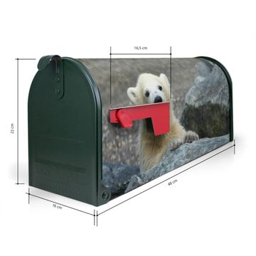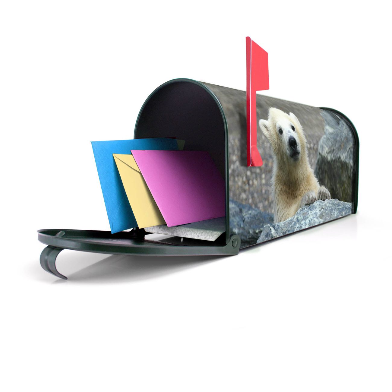 Der amerikanische Briefkasten von banjado mit Eisbär Baby Motiv bietet Ihnen ausreichend Fassungsvermögen, um große A4 Sendungen und Zeitschriften zu empfangen. Die typisch amerikanische rote Fahne zeigt Ihnen an, wenn Sie Post erhalten haben. Die US-Mailbox besteht aus verzinktem Stahlblech welches lackiert wurde und ist 48 x 22 x 16 CM (BxHxT) groß. Die Folie mit Motiv Eisbär Baby besteht aus einer wetter- und UV-resistenten Folie, die mit einem Schutzlaminat überzogen ist, sodass die US Mailbox zusätzlich vor Kratzern geschützt ist. An der Unterkante sind 4 Löcher je Seite um die Mailbox, typisch amerikanisch, an einem Holzpfahl oder einem Zaun zu befestigen. Auf Wunsch können Sie bei uns den passenden Standfuß oder die passende Wandhalterung kaufen um die US-Mailbox sicher zu befestigen. Wir bieten Ihnen ebenfalls Namensschilder, bereits beschriftet oder frei zu beschriften, und verschiedene selbst gestaltete Bitte-Keine-Werbung-Aufkleber.