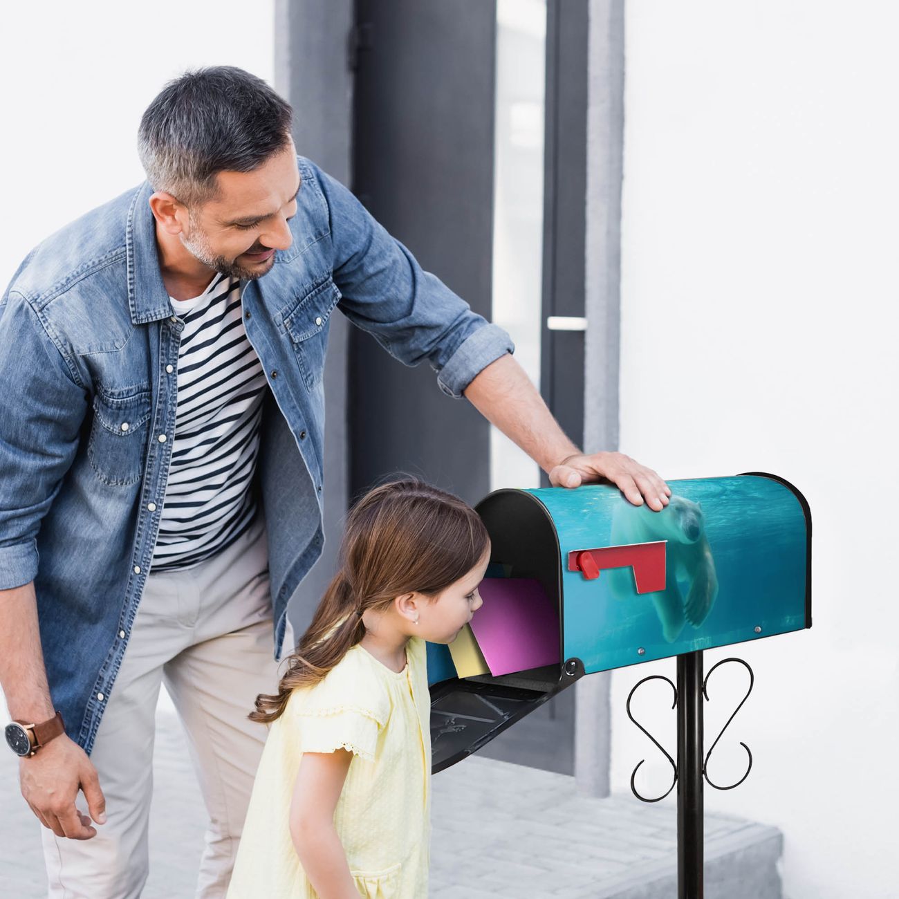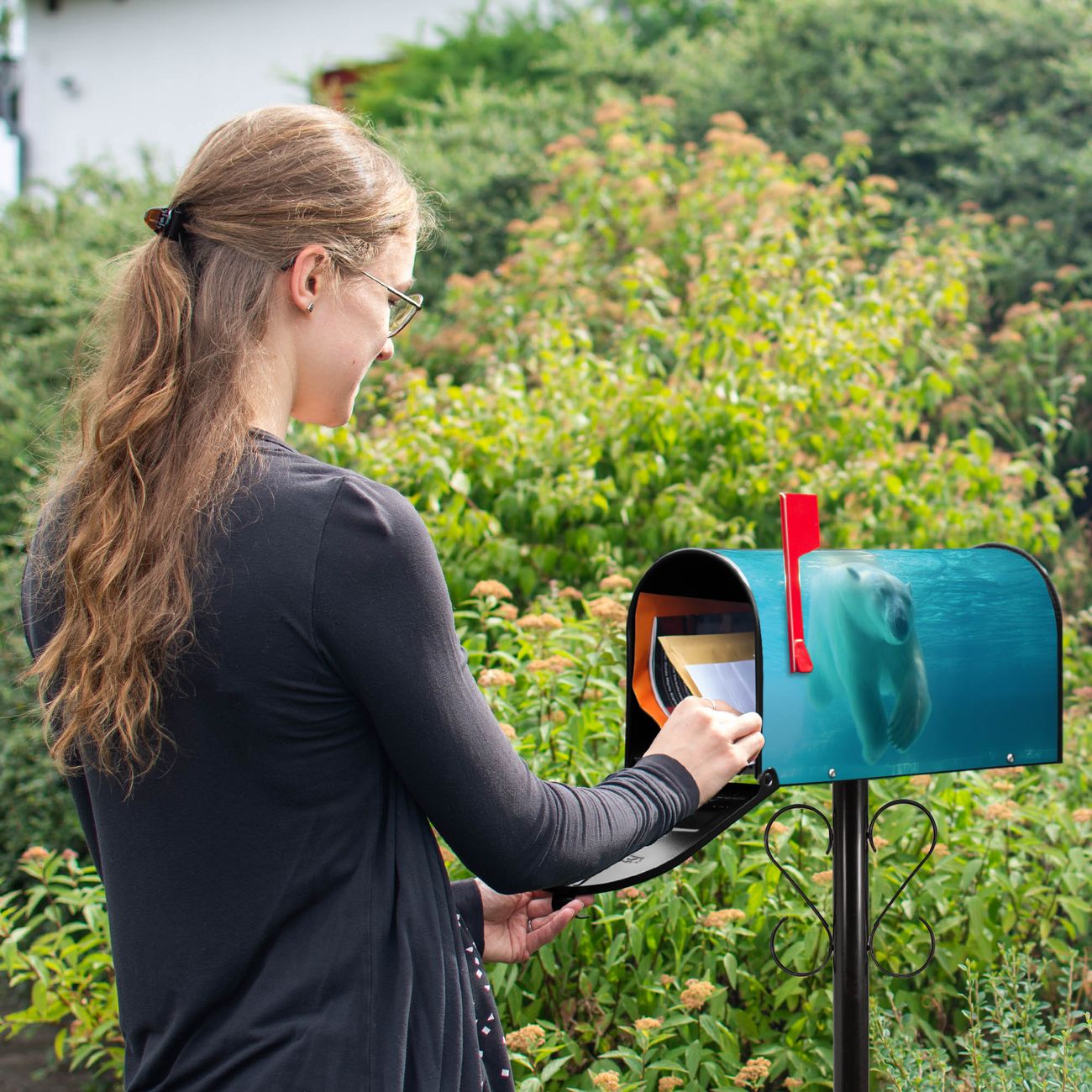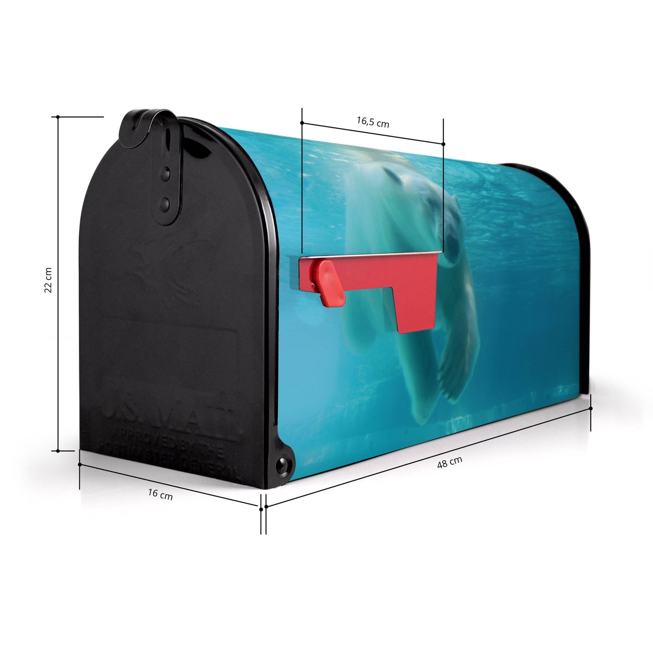 Der amerikanische Briefkasten von banjado mit Eisbär unter Wasser Motiv bietet Ihnen ausreichend Fassungsvermögen, um große A4 Sendungen und Zeitschriften zu empfangen. Die typisch amerikanische rote Fahne zeigt Ihnen an, wenn Sie Post erhalten haben. Die US-Mailbox besteht aus verzinktem Stahlblech welches lackiert wurde und ist 48 x 22 x 16 CM (BxHxT) groß. Die Folie mit Motiv Eisbär unter Wasser besteht aus einer wetter- und UV-resistenten Folie, die mit einem Schutzlaminat überzogen ist, sodass die US Mailbox zusätzlich vor Kratzern geschützt ist. An der Unterkante sind 4 Löcher je Seite um die Mailbox, typisch amerikanisch, an einem Holzpfahl oder einem Zaun zu befestigen. Auf Wunsch können Sie bei uns den passenden Standfuß oder die passende Wandhalterung kaufen um die US-Mailbox sicher zu befestigen. Wir bieten Ihnen ebenfalls Namensschilder, bereits beschriftet oder frei zu beschriften, und verschiedene selbst gestaltete Bitte-Keine-Werbung-Aufkleber.