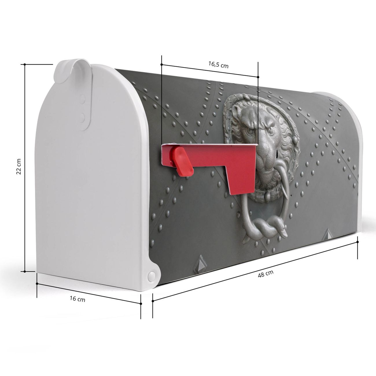 Der amerikanische Briefkasten von banjado mit Eisentor Motiv bietet Ihnen ausreichend Fassungsvermögen, um große A4 Sendungen und Zeitschriften zu empfangen. Die typisch amerikanische rote Fahne zeigt Ihnen an, wenn Sie Post erhalten haben. Die US-Mailbox besteht aus verzinktem Stahlblech welches lackiert wurde und ist 48 x 22 x 16 CM (BxHxT) groß. Die Folie mit Motiv Eisentor besteht aus einer wetter- und UV-resistenten Folie, die mit einem Schutzlaminat überzogen ist, sodass die US Mailbox zusätzlich vor Kratzern geschützt ist. An der Unterkante sind 4 Löcher je Seite um die Mailbox, typisch amerikanisch, an einem Holzpfahl oder einem Zaun zu befestigen. Auf Wunsch können Sie bei uns den passenden Standfuß oder die passende Wandhalterung kaufen um die US-Mailbox sicher zu befestigen. Wir bieten Ihnen ebenfalls Namensschilder, bereits beschriftet oder frei zu beschriften, und verschiedene selbst gestaltete Bitte-Keine-Werbung-Aufkleber.