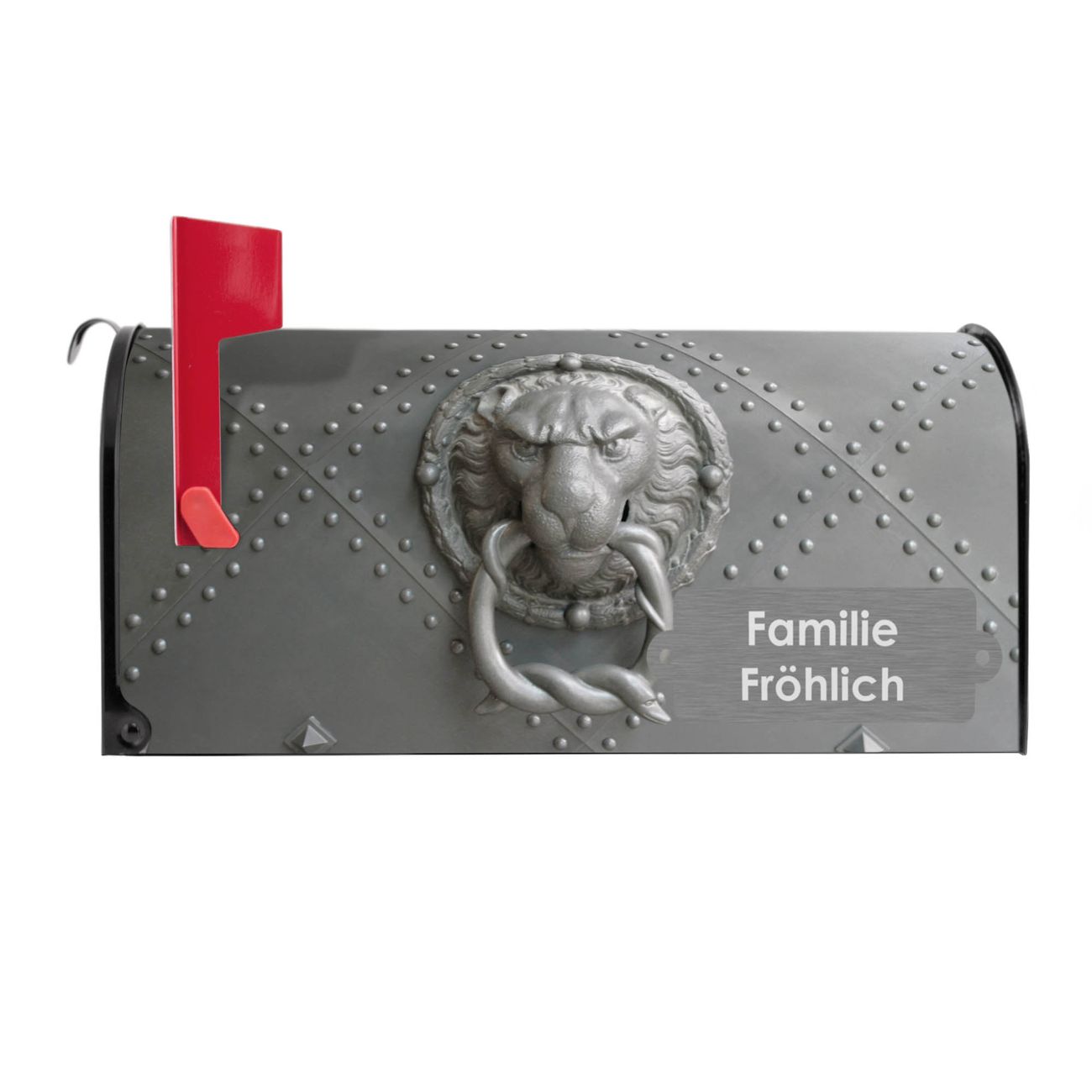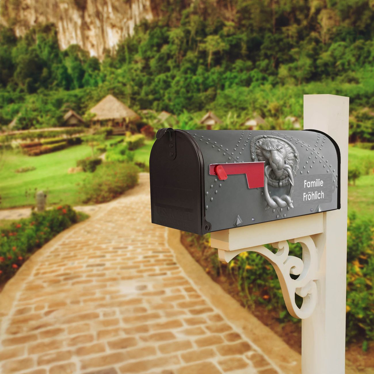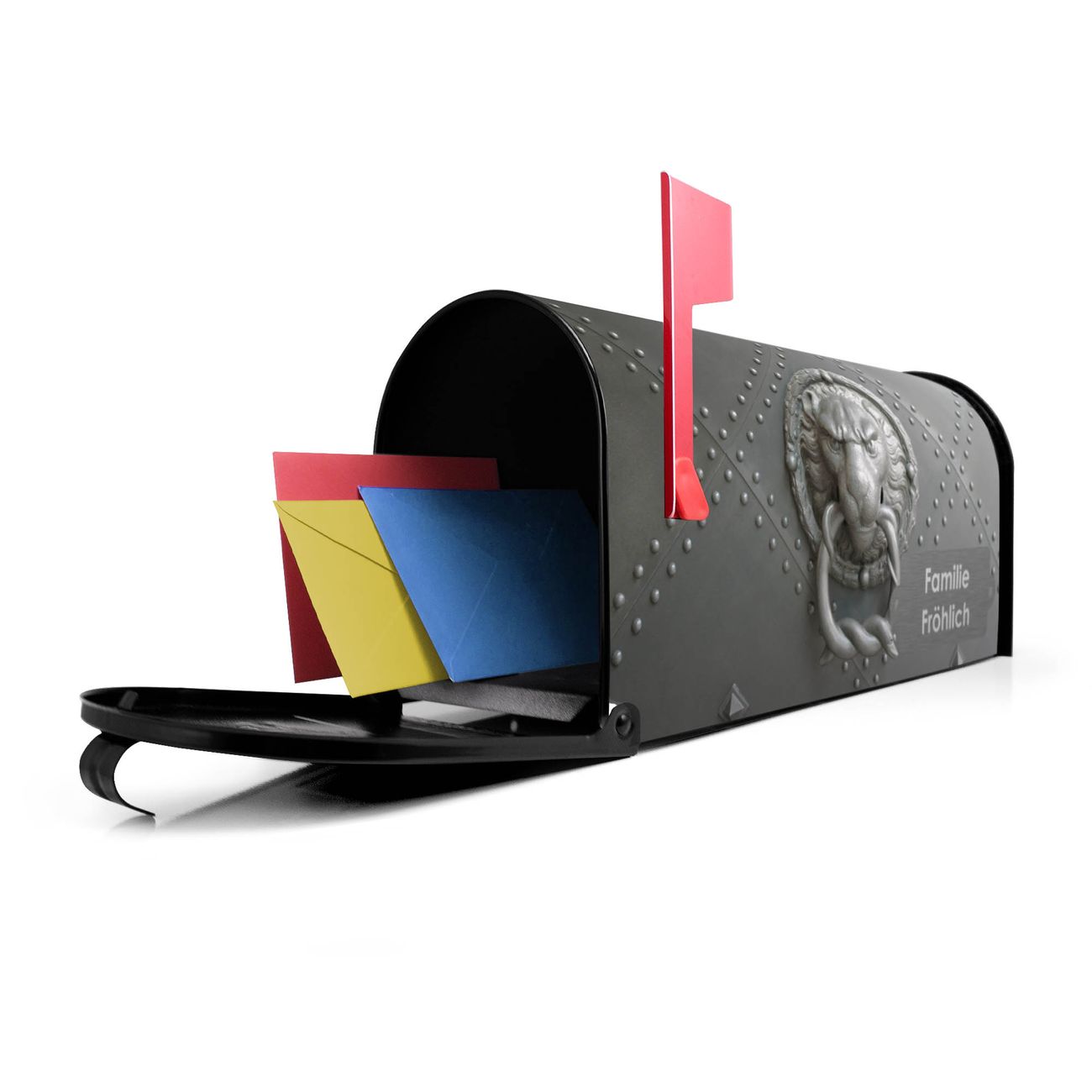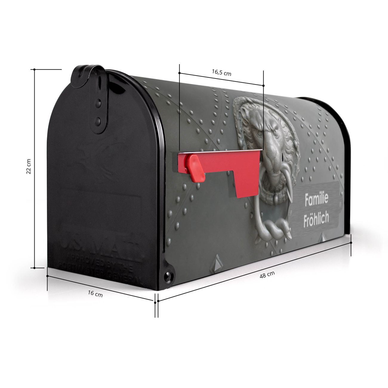 Der amerikanische Briefkasten von banjado mit Eisentor Motiv bietet Ihnen ausreichend Fassungsvermögen, um große A4 Sendungen und Zeitschriften zu empfangen. Die typisch amerikanische rote Fahne zeigt Ihnen an, wenn Sie Post erhalten haben. Die US-Mailbox besteht aus verzinktem Stahlblech welches lackiert wurde und ist 48 x 22 x 16 CM (BxHxT) groß. Die Folie mit Motiv Eisentor besteht aus einer wetter- und UV-resistenten Folie, die mit einem Schutzlaminat überzogen ist, sodass die US Mailbox zusätzlich vor Kratzern geschützt ist. An der Unterkante sind 4 Löcher je Seite um die Mailbox, typisch amerikanisch, an einem Holzpfahl oder einem Zaun zu befestigen. Auf Wunsch können Sie bei uns den passenden Standfuß oder die passende Wandhalterung kaufen um die US-Mailbox sicher zu befestigen. Wir bieten Ihnen ebenfalls Namensschilder, bereits beschriftet oder frei zu beschriften, und verschiedene selbst gestaltete Bitte-Keine-Werbung-Aufkleber.