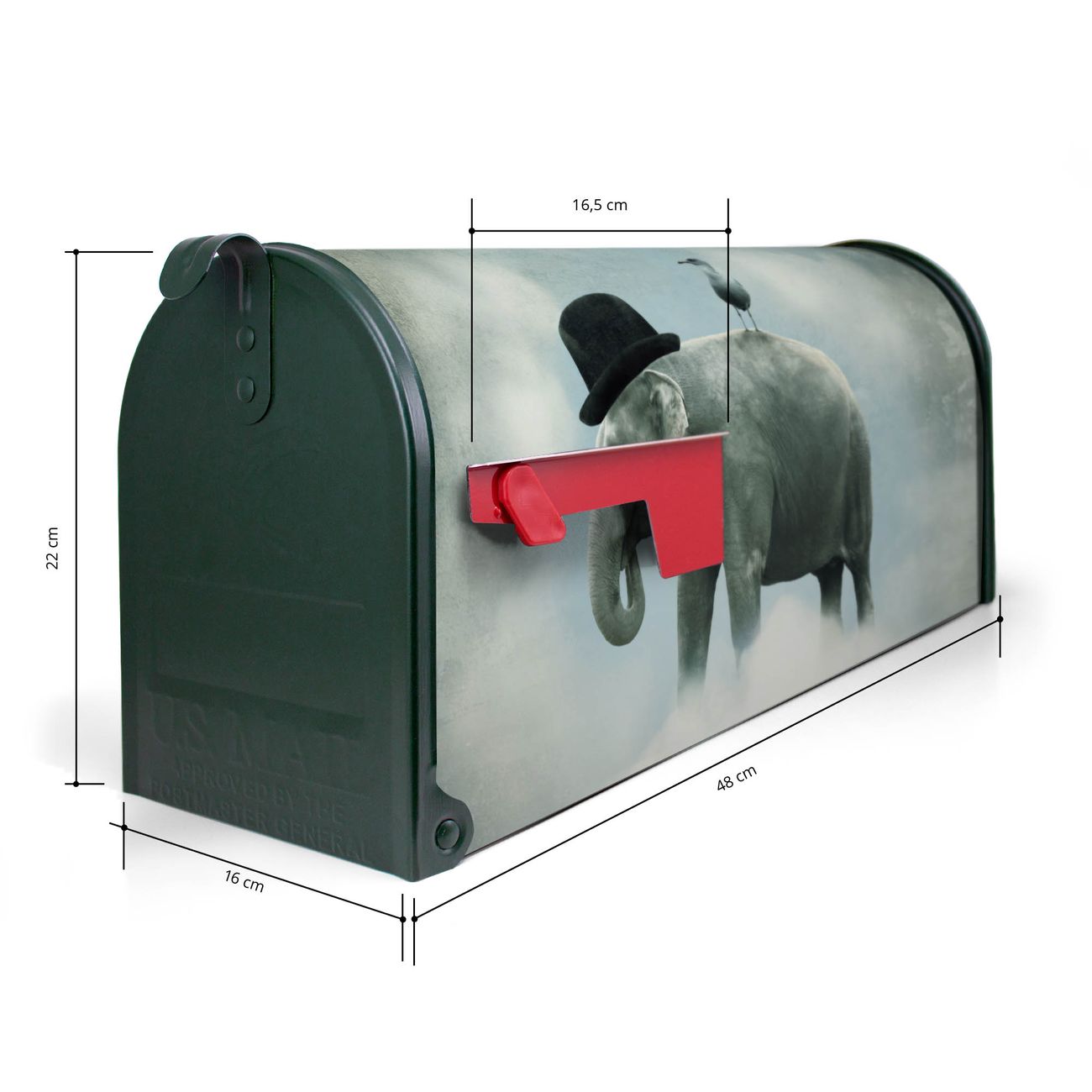 Der amerikanische Briefkasten von banjado mit Elefant und Möwe Motiv bietet Ihnen ausreichend Fassungsvermögen, um große A4 Sendungen und Zeitschriften zu empfangen. Die typisch amerikanische rote Fahne zeigt Ihnen an, wenn Sie Post erhalten haben. Die US-Mailbox besteht aus verzinktem Stahlblech welches lackiert wurde und ist 48 x 22 x 16 CM (BxHxT) groß. Die Folie mit Motiv Elefant und Möwe besteht aus einer wetter- und UV-resistenten Folie, die mit einem Schutzlaminat überzogen ist, sodass die US Mailbox zusätzlich vor Kratzern geschützt ist. An der Unterkante sind 4 Löcher je Seite um die Mailbox, typisch amerikanisch, an einem Holzpfahl oder einem Zaun zu befestigen. Auf Wunsch können Sie bei uns den passenden Standfuß oder die passende Wandhalterung kaufen um die US-Mailbox sicher zu befestigen. Wir bieten Ihnen ebenfalls Namensschilder, bereits beschriftet oder frei zu beschriften, und verschiedene selbst gestaltete Bitte-Keine-Werbung-Aufkleber.